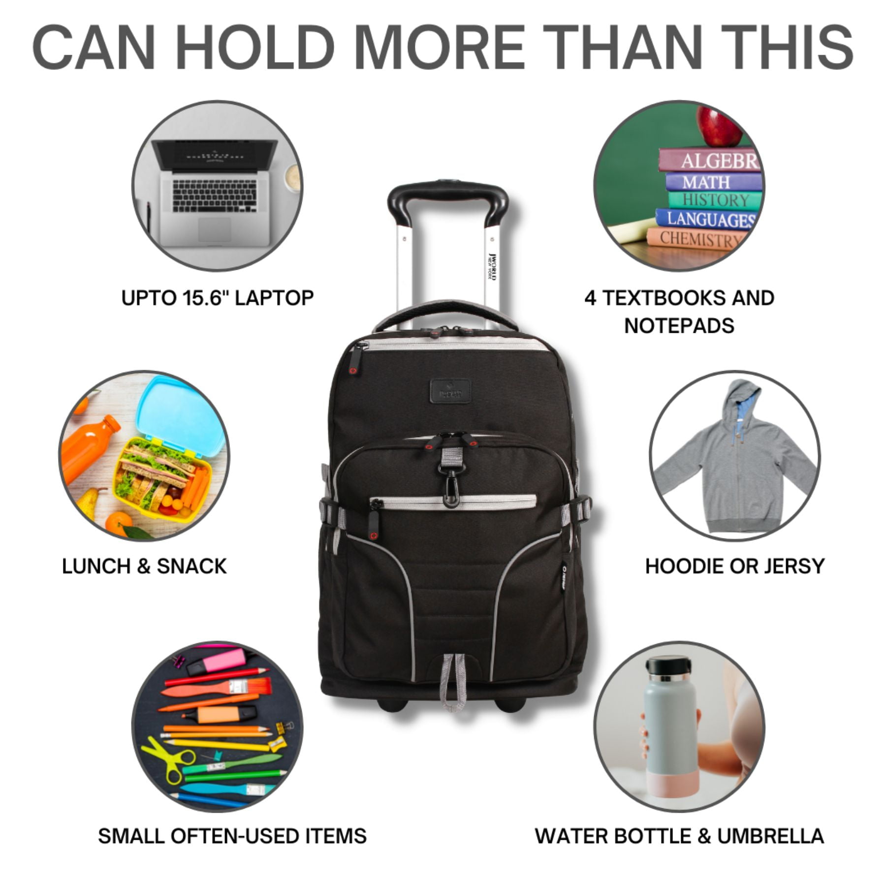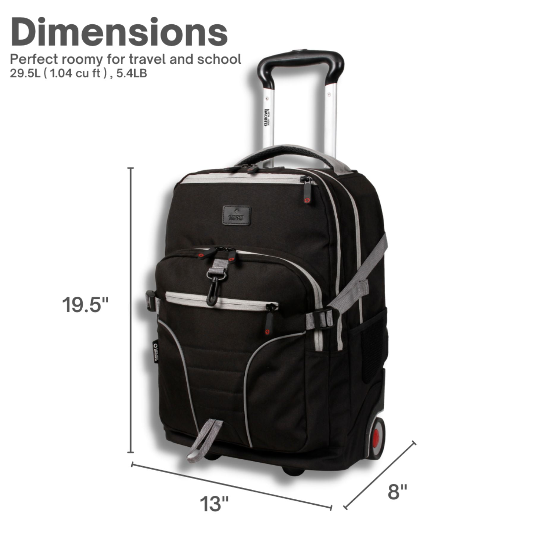 Large Backpack With Wheels: This 19.5” rolling backpack for school and travel offers the load carrying ability of a rolling suitcase and the portability of a school bookbag. For teens and adults who carry a lot of stuff. Huge Capacity: Easily carries a computer laptop, 3″ binder, 3 college textbooks, notebooks, portable hard drive and lunch with room to spare. Measures 19.5 x 13 x 8 inches Laptop Compartment: Fully-padded interior laptop carrying case keeps your laptop computer safe. This rolling laptop backpack fits most laptops up to 15.6-inches Large Organizer: A place for everything with 2 large compartments, 3 exterior zipper pockets, 2 mesh pockets, plus internal pockets, key clip and pen/card slots for keeping small items secure Adjustable Handle: Double tube aluminum handle extends to 34 or 39 inches for easy maneuverability by teens and adults up to 6’3” tall. Handle stores nested in wheeled backpack Converts Quickly: Pull out backpack straps in seconds when going upstairs or over rough ground. Straps easily tuck away in the back pocket when rolling—no having to unzip Smooth Rolling: Rubber backpack wheels roll and turn effortlessly on sidewalks, paths and airplane aisles. Corner mounted wheels provide extra stability Durable School Rolling bag: Made of durable polyester fabric with a metal frame, reinforced edges and a molded rubber bottom to protect against abrasion. Water resistant coating keeps your gear dry Versatile laptop Roller bag: Works well as a roller backpack for school, a kids rolling backpack with a laptop compartment, or as a carry on wheeled backpack for college students