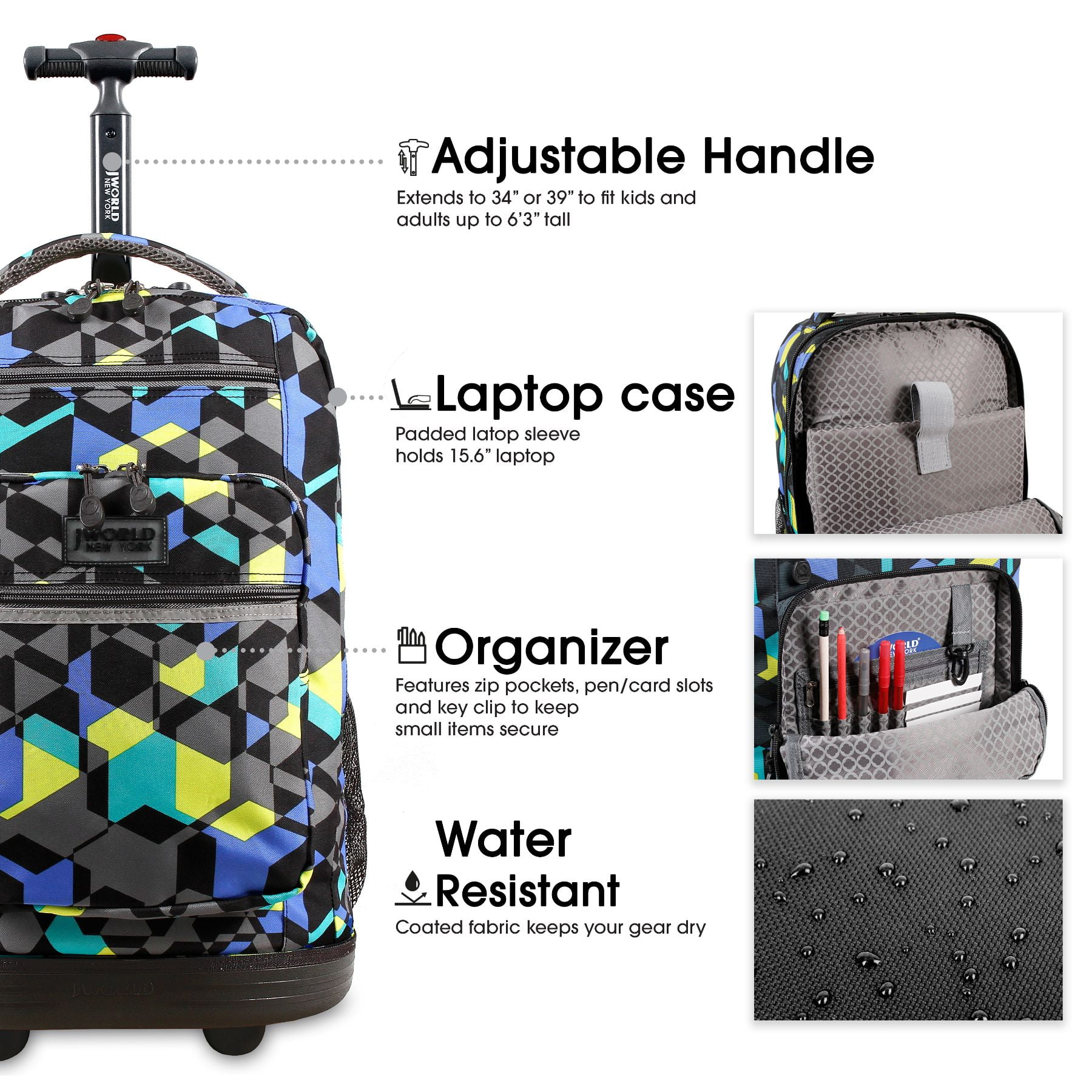 Versatile Wheeled Laptop Backpack! The innovative and versatile J World Sundance Rolling Backpack features a 15.6″ laptop sleeve compartment and bottom protection mold to ensure your device will not be damaged when traveling. The Sundance Wheeled Laptop Backpack can be utilized as both carry-on luggage or a strapped laptop backpack that is easy to carry around. Organize all of your belongings with a front pocket equipped with a pencil holder, key fob and mesh pocket perfect for storing items that can be easily accessed. For the people on the go in need of hydration, it has side mesh pockets that are ideal for storing water bottles and various other drink containers.
