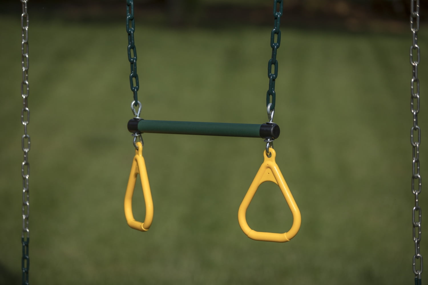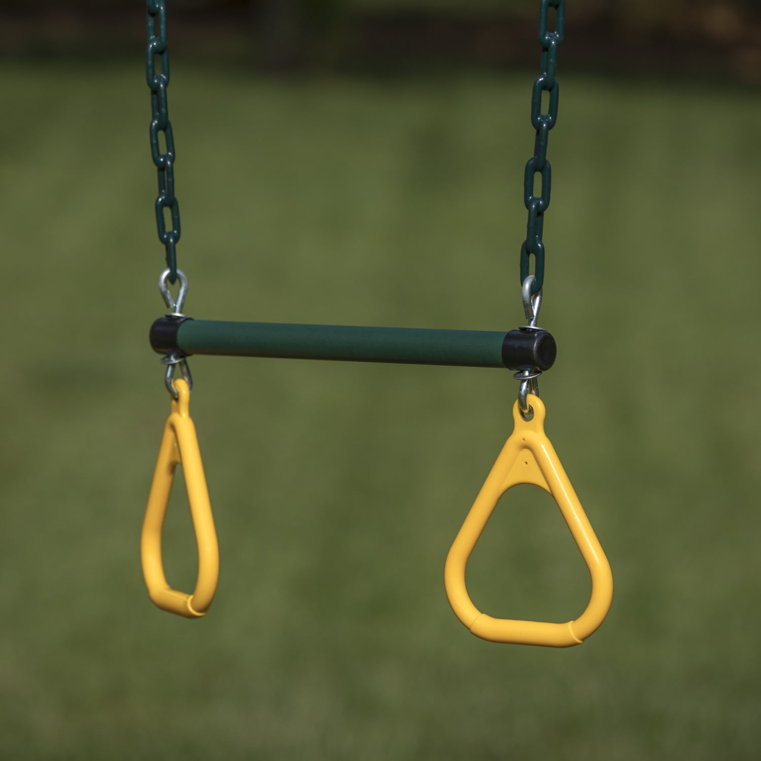 Playset ring trapeze bar is powder-coated and 21” in length Swing chains are 50” long with plastisol coating on the bottom 18” for a soft and comfortable grip Bar and chain are matching green while the handles are vibrant yellow Trapeze bar comes fully assembled Powder coating, plastic and plastisol used all passed a 500-hour UV resistance test