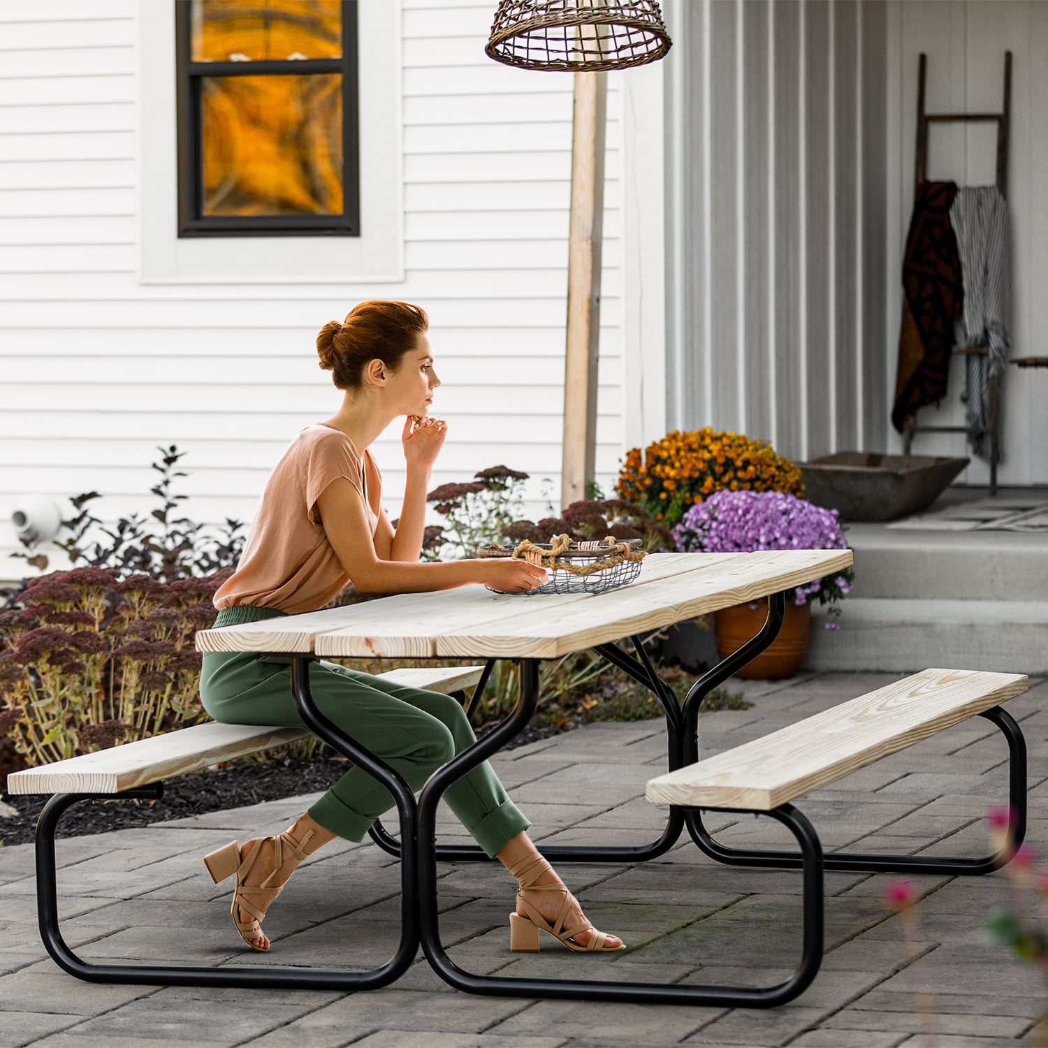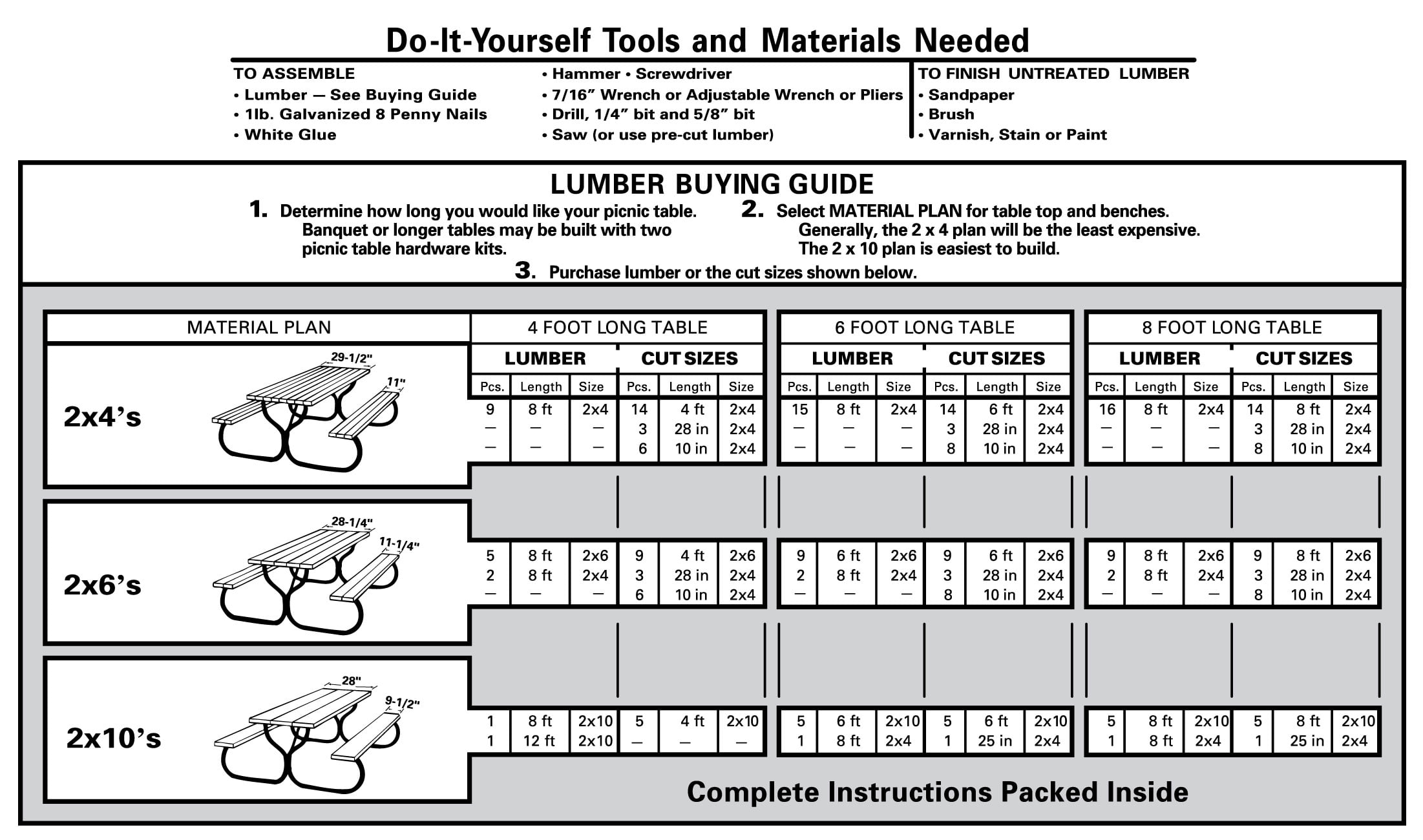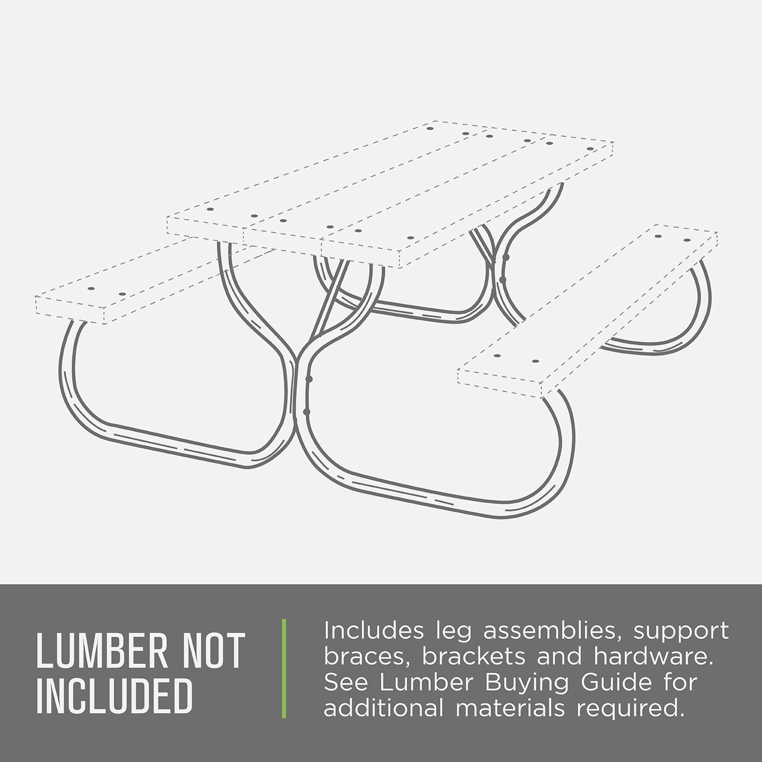 Customizable Design: Build 4ft, 6ft.or 8 ft picnic tables crafted from 2x4s, 2x6s or 2x10s. Outdoor Versatility: Perfect for gardens, patios, porches, or other outdoor spaces. Weather Resistant: Powdercoated steel frames are fade and rust resistant. Specially treated hardware resists corrosion from treated lumber Sturdy Construction: Designed to support 8 adults. Flat-Pack Shipping: Includes simple assembly instructions and a lumber buying guide. Enhanced Packaging: Secure packaging ensures the product arrives safely without damage. Low Maintenance: Smooth finish is easy to clean with a damp cloth. Lumber Not Included Customer Support: Customer service 8am – 8pm M-F, English, Spanish and French, 3 year warranty