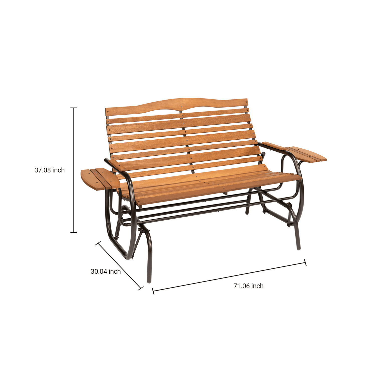 High Backrest Design: Fifteen 48″ slats on a gently curved steel frame for comfort and strength Natural Beauty: A warm stain finish on the Indonesian Mahogany stats enhances the beautiful wood grain. Functional Trays: Includes side trays ideal for holding drinks, books or snacks. Smooth Ride: Ball bearing glides provide a smooth, relaxing motion Outdoor Versatility: Perfect for gardens, patios, porches, or other outdoor spaces. Weather Resistant: Indonesian mahogany slats and a powdercoated steel frame withstand outdoor elements for long-term durability. Sturdy Construction: Designed to support 2 adults up to 500 pounds. Flat-Pack Shipping: Includes simple assembly instructions for convenient setup. Enhanced Packaging: Secure packaging ensures the product arrives safely without damage. Low Maintenance: Smooth finish is easy to clean with a damp cloth. Customer Support: Customer service 8am – 8pm M-F, English, Spanish and French, 3 year warrant