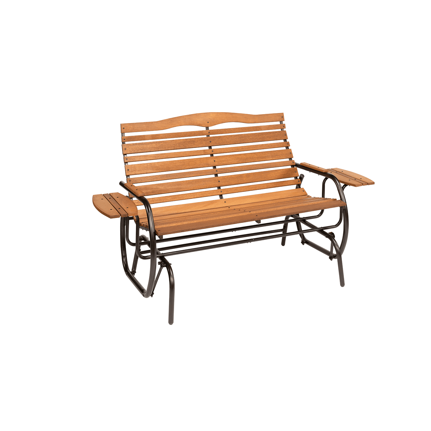 The Hi-back Glider with Trays blends comfort and durability. A high backrest and 15 slats on a gently curved steel frame makes this glider exceptionally comfortable. The Trays on each end holdi drinks, books, or snacks.The warm stain finish on the Indonesian mahogany slats enhances the beauty of the fine hardwood. Ball bearing glides provide a smooth, relaxing motion. Ideal for gardens, patios, or porches. Its durable mahogany slats and powdercoated steel frame offer exceptional weather resistance. The sturdy construction supports up to 500 pounds. Ships flat-packed and includes clear assembly instructions for quick setup.