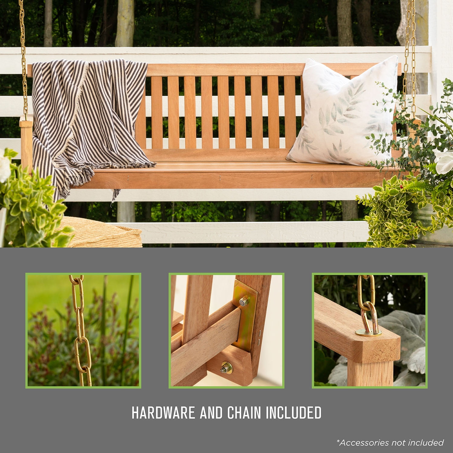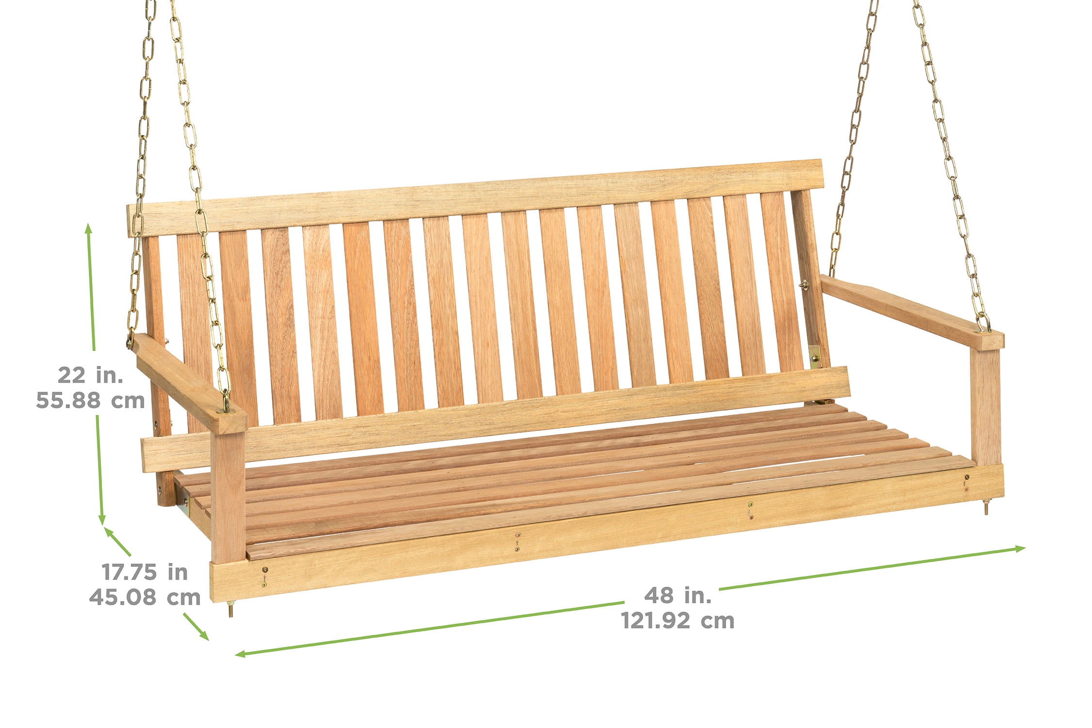Jack-Post 4′ Classic Natural Finish Porch Swing: Designed to hang from a porch or a swing frame like Jack-Post model WL-70z Swing frame sold separately Made from Indonesian hardwood Assembled Dimensions: 49″ W x 21.75″ D x 17.5″ H The natural finish can be stained or painted Steel welded chains for superior support and easy connecting to swing frame Simply add your own cushions for a custom look