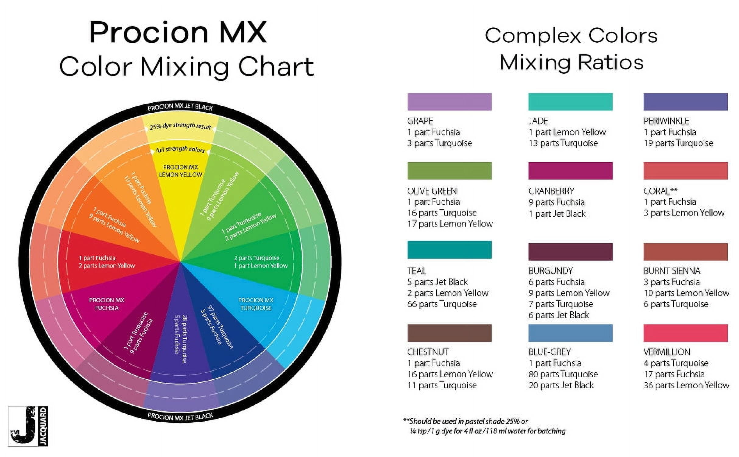 Cold water, fiber reactive Procion MX dye is the most vivid dye for cellulose fibers. This set includes 8—8 oz/0.23 kg jars of Procion MX dye powder with the following colors: 004 Lemon Yellow 020 Brilliant Orange 030 Fire Engine Red 040 Fuchsia 068 Turquoise 072 Medium Blue 097 Bright Green 150 Jet Black Item PMX208S