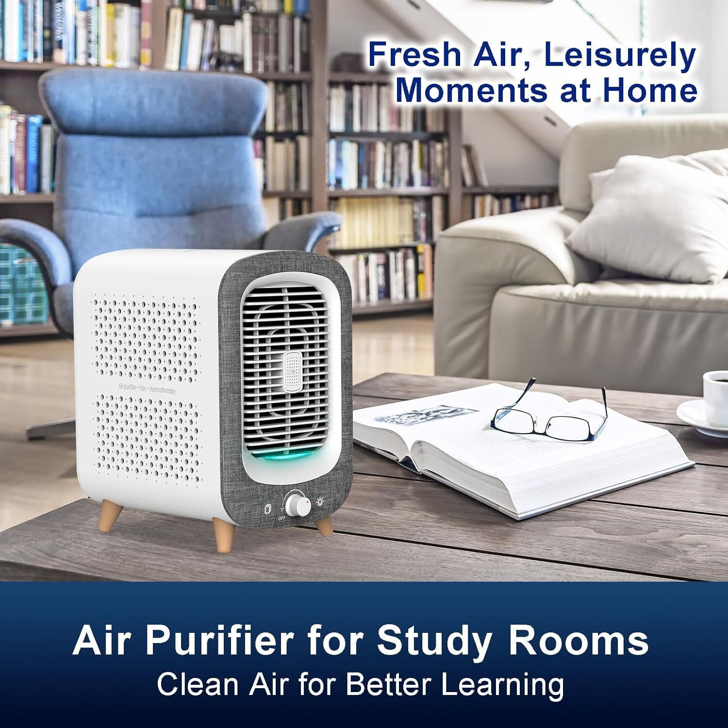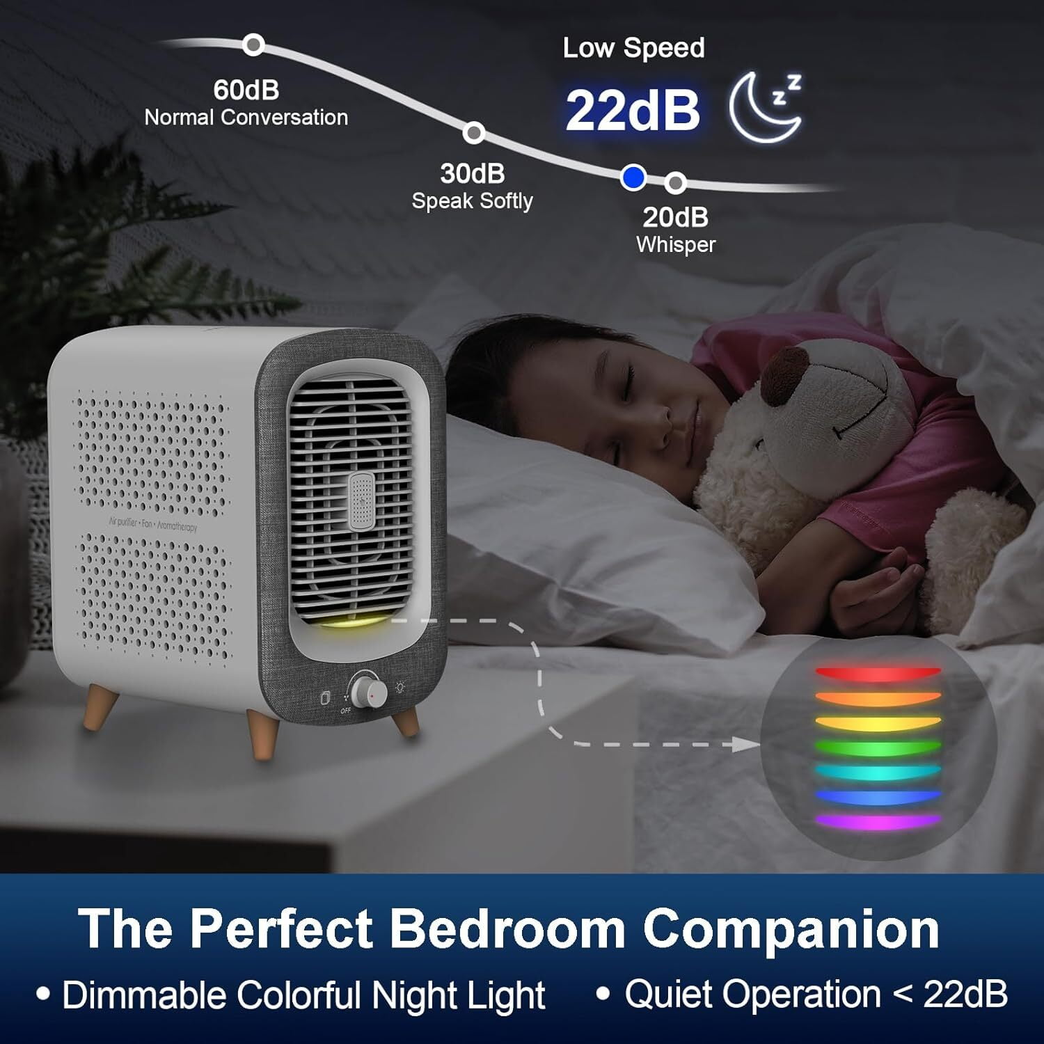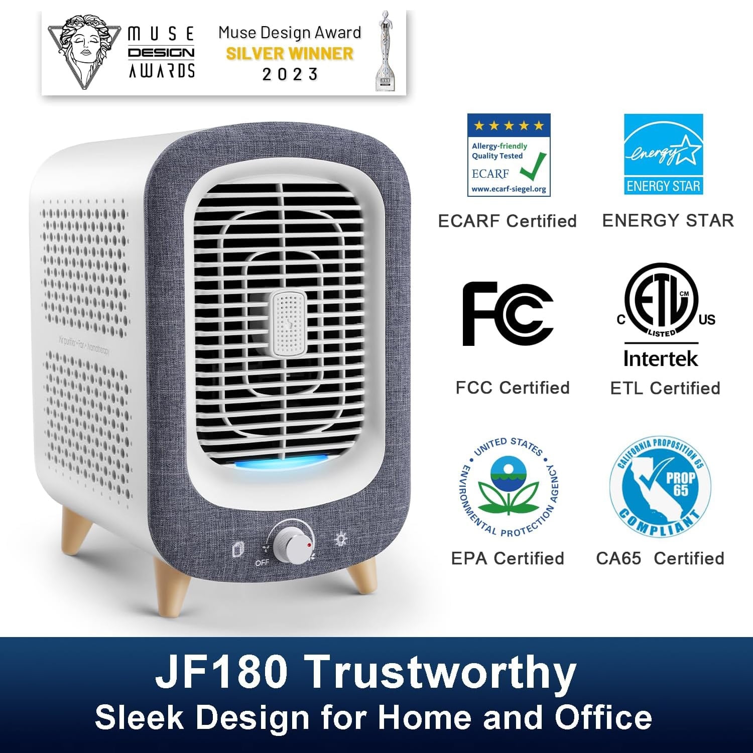 Embrace the timeless elegance of the JF180 Air Purifier, inspired by vintage radio design. Featuring charming faux wood legs, a mixed-texture snowflake fabric surface, and a retro radio dial knob, this air purifier seamlessly integrates into any décor, adding a touch of sophistication to your living space. Experience superior air purification with the JF180’s advanced filtration, including a pre-filter, H13 True HEPA filter, and high iodine value activated carbon filter. Effectively captures at least 99.97% of airborne particles as small as 0.015 micrometers, including PM2.5, smoke, pollen, dust, pet odors, VOCs, and more for fresher, cleaner air. Create a soothing sleep environment with the JF180’s gentle mood lighting and aromatherapy function. Add a few drops of your favorite essential oil to the pad, and let the tranquil fragrance fill your room as the air purifier cleanses the air. Ideal for bedrooms, nurseries, home offices, and apartments. Enjoy enhanced safety and comfort with the JF180’s bladeless technology. The absence of spinning blades makes it safe for children and pets, while the front air outlet design ensures efficient air circulation within 3 seconds. Its compact and stylish design fits perfectly into any room, complementing your décor.