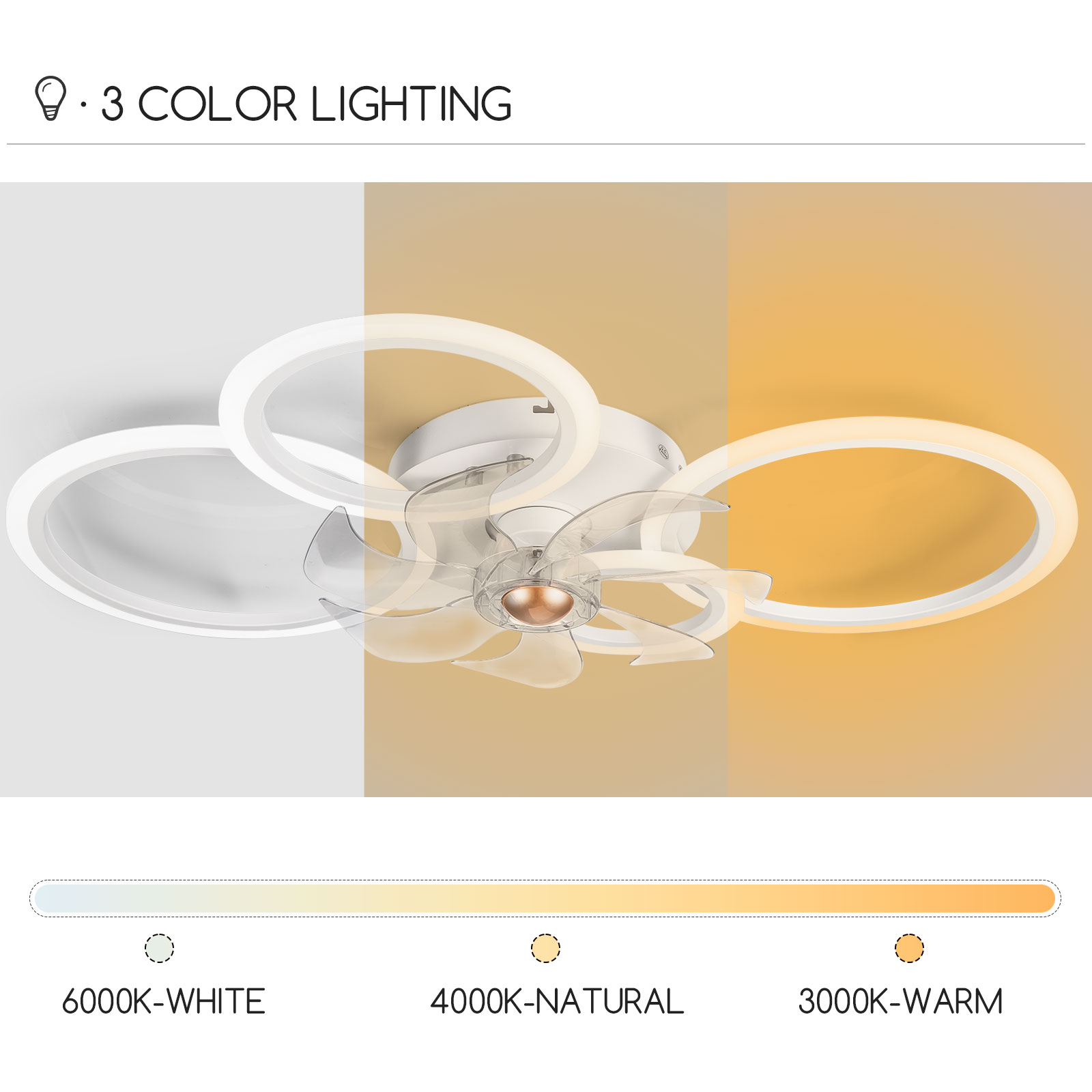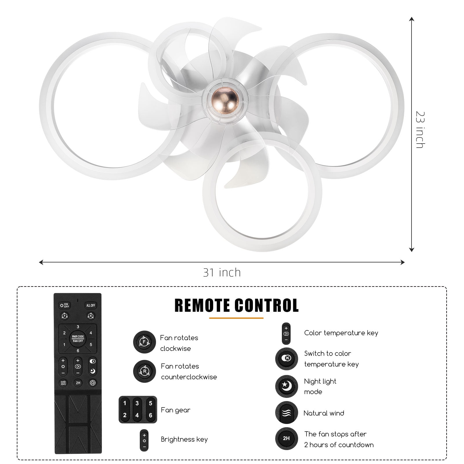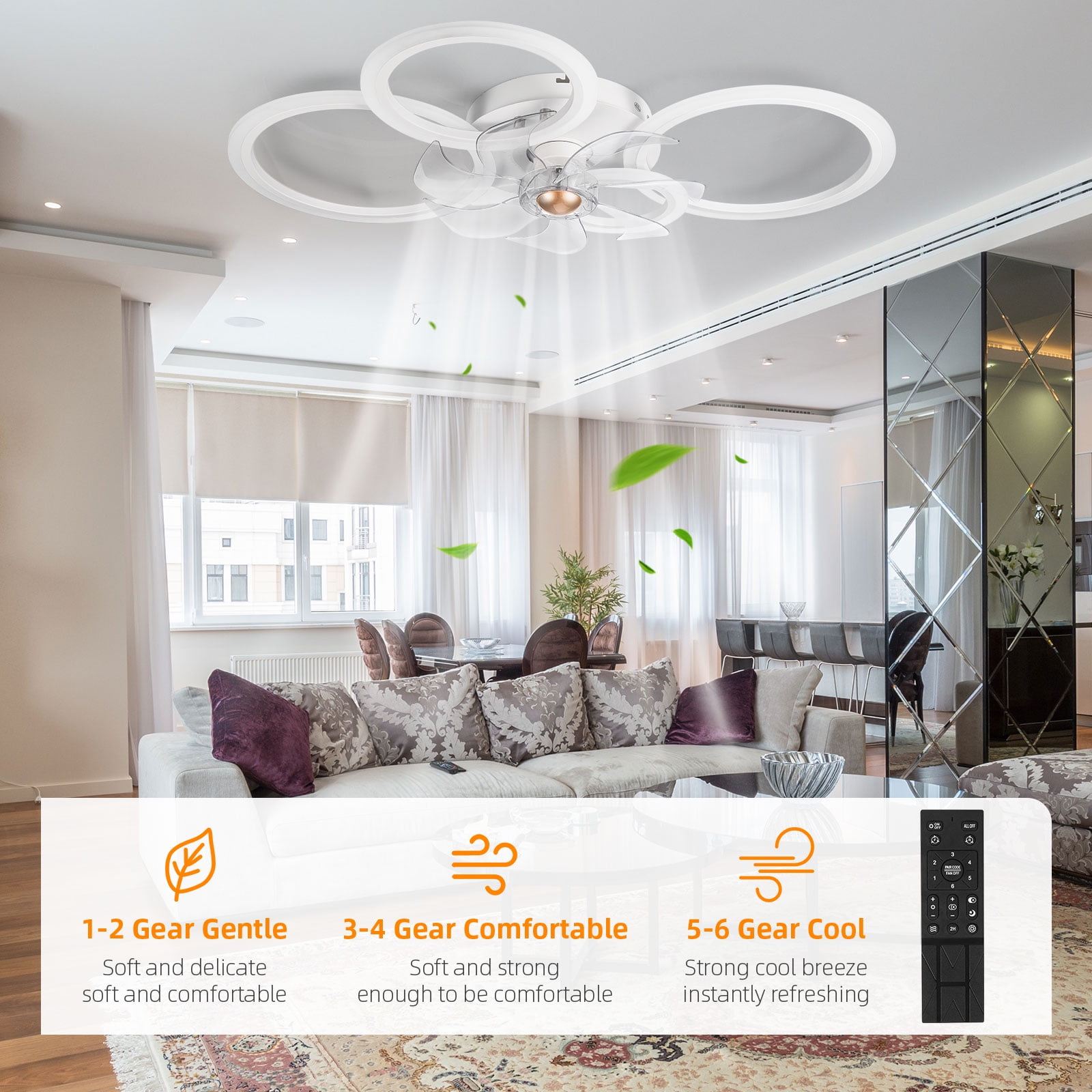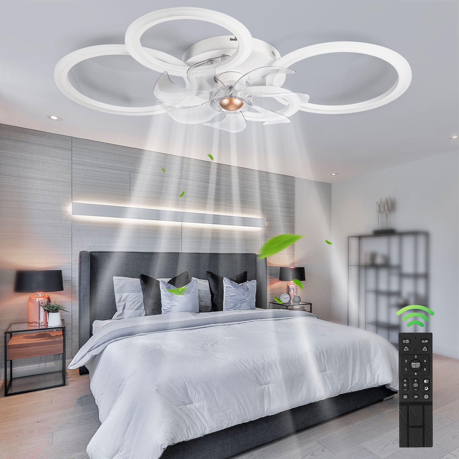Modern design low profile ceiling fan with LED light enhances your home interior with a stylish touch Bladeless design suitable for rooms around 10FT x 13FT, including bedrooms, living rooms, dining rooms, kitchens, children’s rooms, offices, and game rooms High-quality reversible pure copper motor ensures smooth and noiseless operation with 6 wind speed modes and a built-in dimming function for optimal air circulation 2-in-1 design features shorter blades placed in the inner ring circle of the light, providing safety without compromising airflow, ideal for low ceilings and loft beds Easy installation with all accessories pre-assembled for direct wiring to the ceiling, making it convenient to set up and maintain