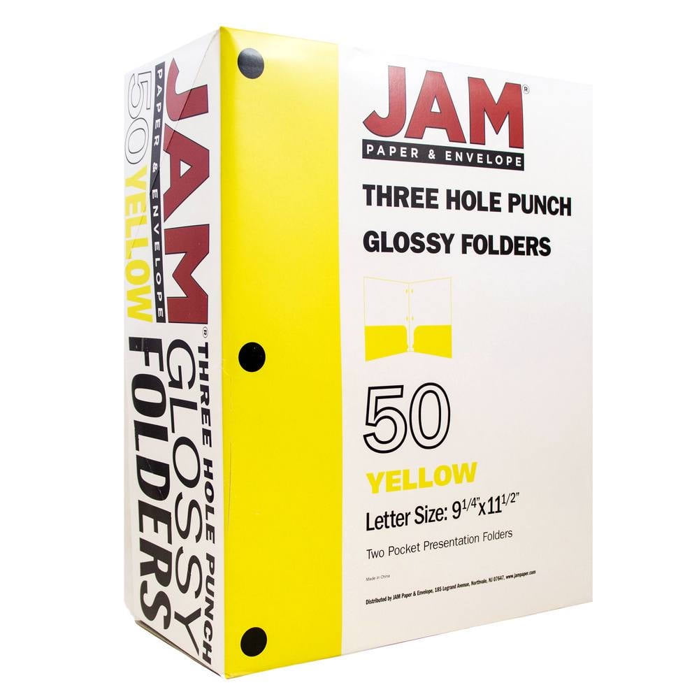 Are you known for your sunny disposition? Do you want to show everyone the brightness and joy that you feel? JAM Paper & Envelope Yellow Glossy Two Pocket 3 Hole Punched Presentation Folders are right for you! These luminescent folders feature a vibrant, glossy yellow finish! This pack contains an even total of 50 folders! Each one is made out of 100lb cardstock and measures 9 x 12 inches in size, making them ideal for standard sized documents! To help you more efficiently, sort and carry your papers, these folders contain two pockets in the inside. A business card slot is featured within the surface of every left-side pocket. To help you place and secure these folders into 3-ring binders, each one has three punch-out holes on the left side. Use these versatile folders at work, school, or in your home to brighten and organize your space! Size: 9in x 12in | Color: Yellow | Quantity: 50