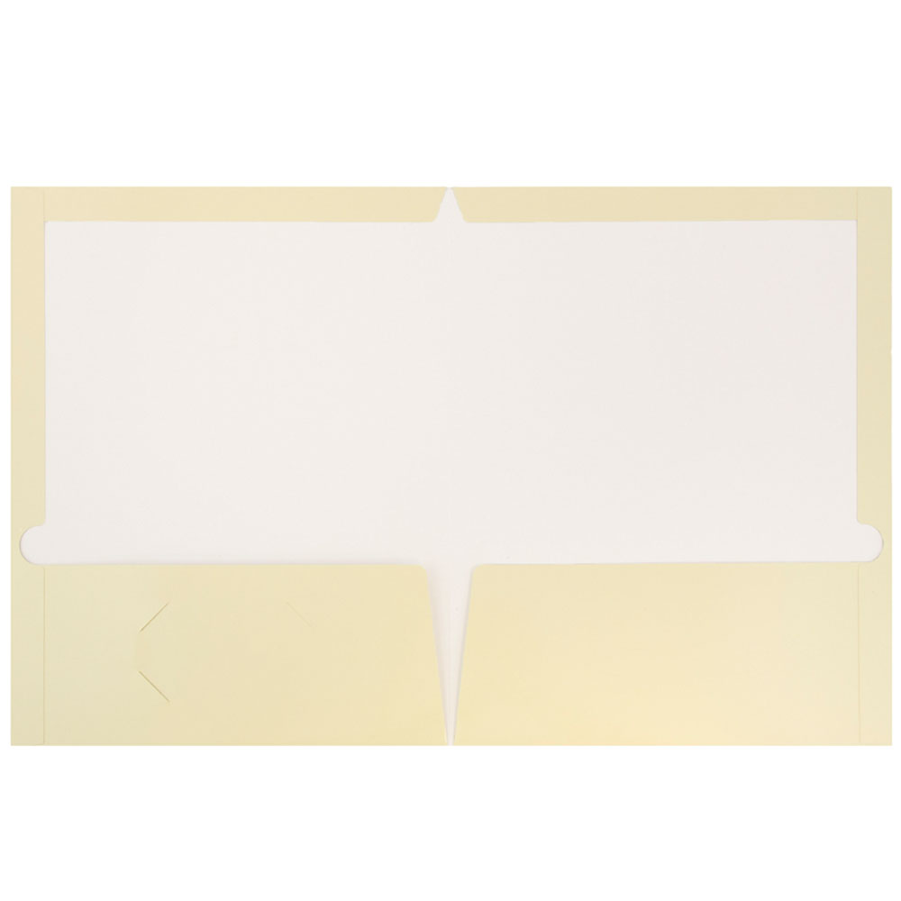 Ivory Folder Size: 9.5 x 11.5 inches, 100 per pack Quantity: 100 per box Folders are highly durable and felxible and include: 2 pockets to keep your documents secure and an additional busiess card slot on the left pocket Smooth cardstock glossy finish