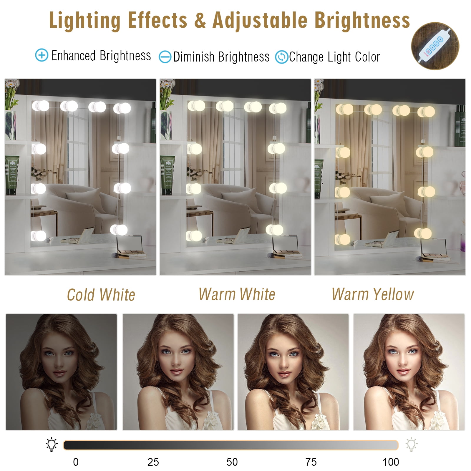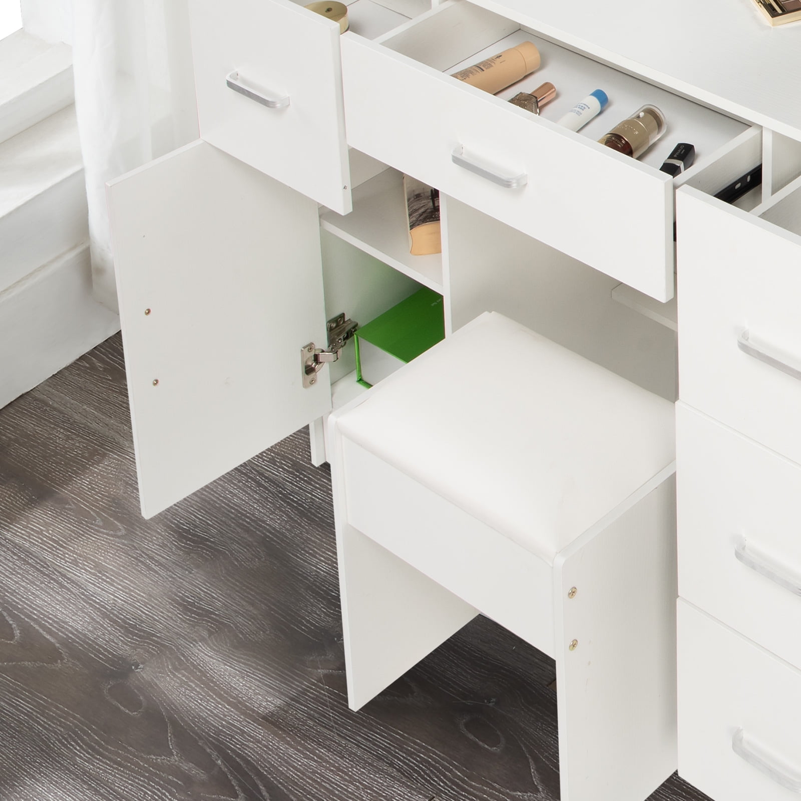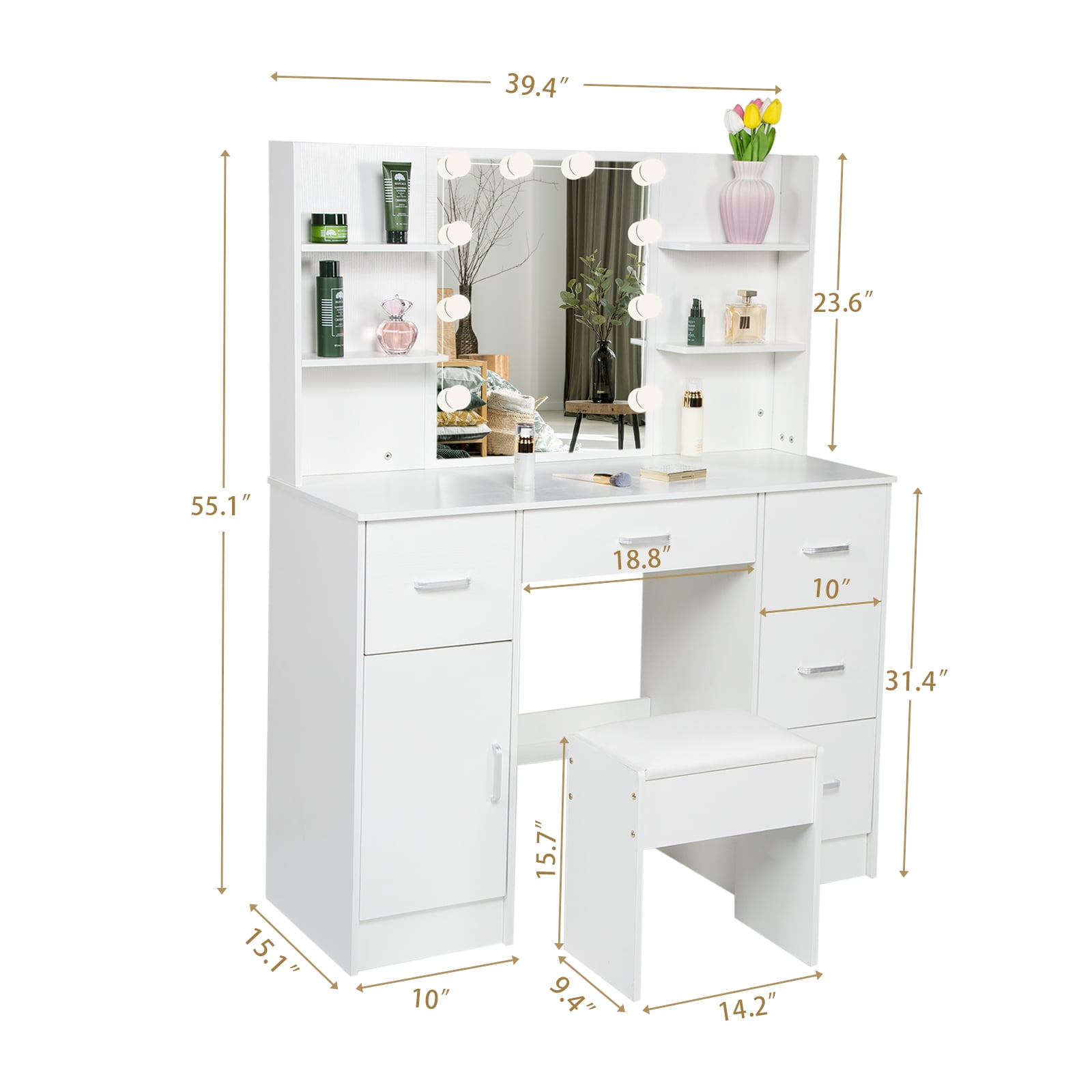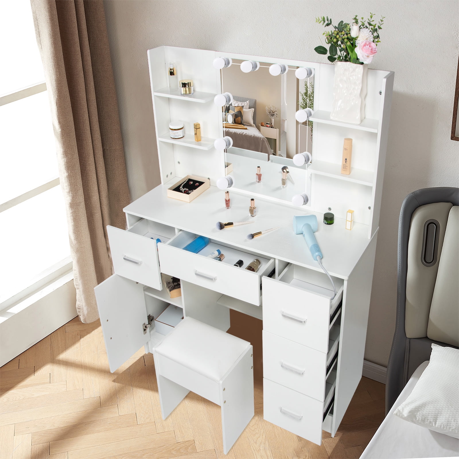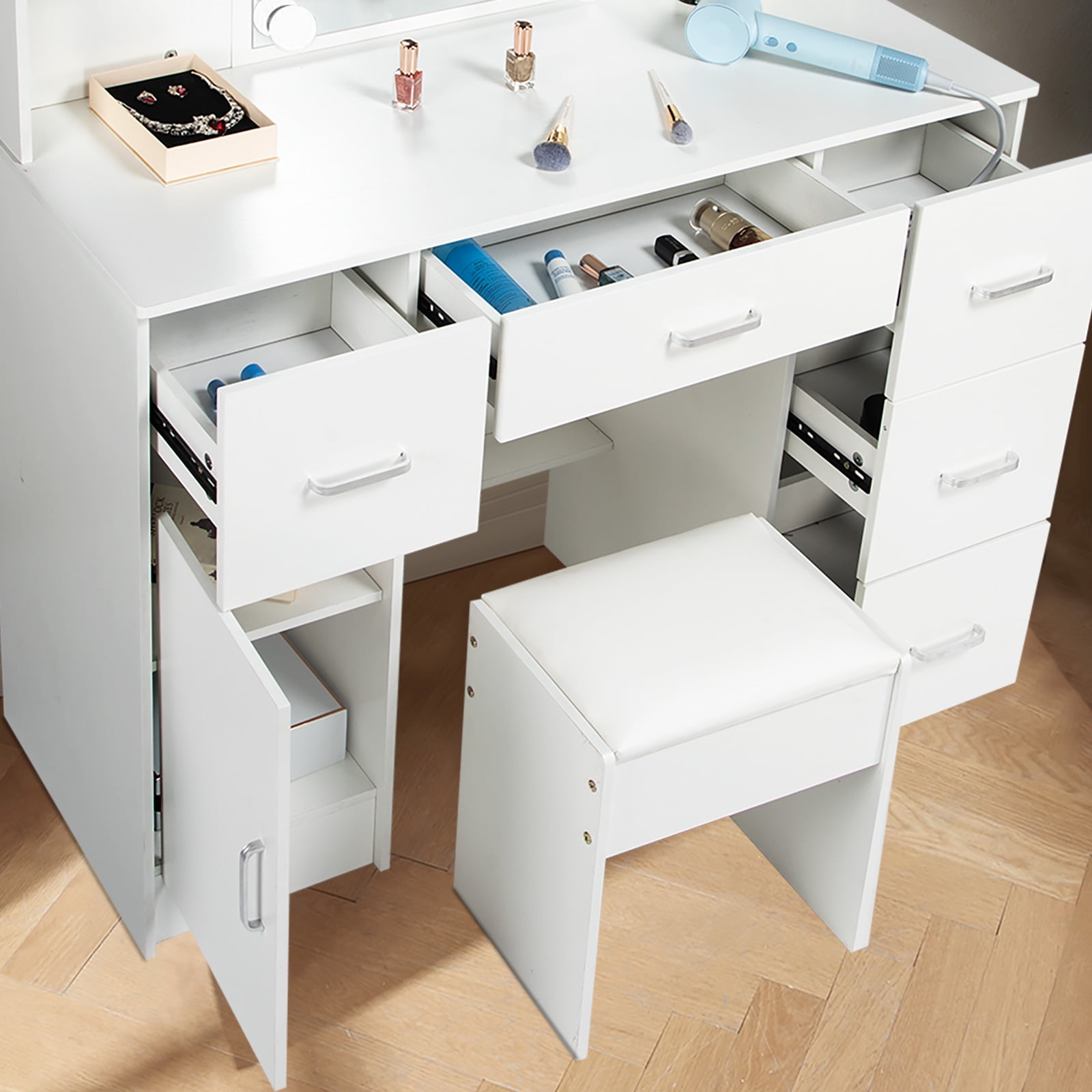 Made of high quality MDF material in a white finish add a touch of glamour in your bedroom, dressing room or studio, and ensures durability and stability of the makeup vanity for years to come. Hollywood light bulbs add a sense of glamor and style. Package Included: 1 x Dressing Table, 1 x Dressing Stool, 1 x Instruction With 5 drawers, 6 shelves and 1 storage cabinets, enough space for all makeups, jewelry, hair accessories, blow dryer, it means no more lost cosmetics. This vanity desk is equipped with 10 LED bulbs can adjust brightness and have 3 lights modes: warm yellow, warm white and cold white light colors. It can accurately illuminate skin color and complexion during the day or at night, allowing you to enjoy every detail of makeup.