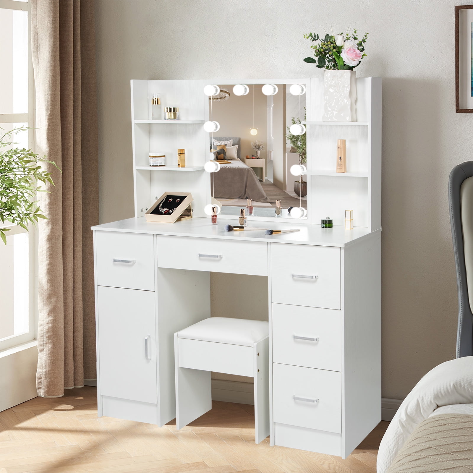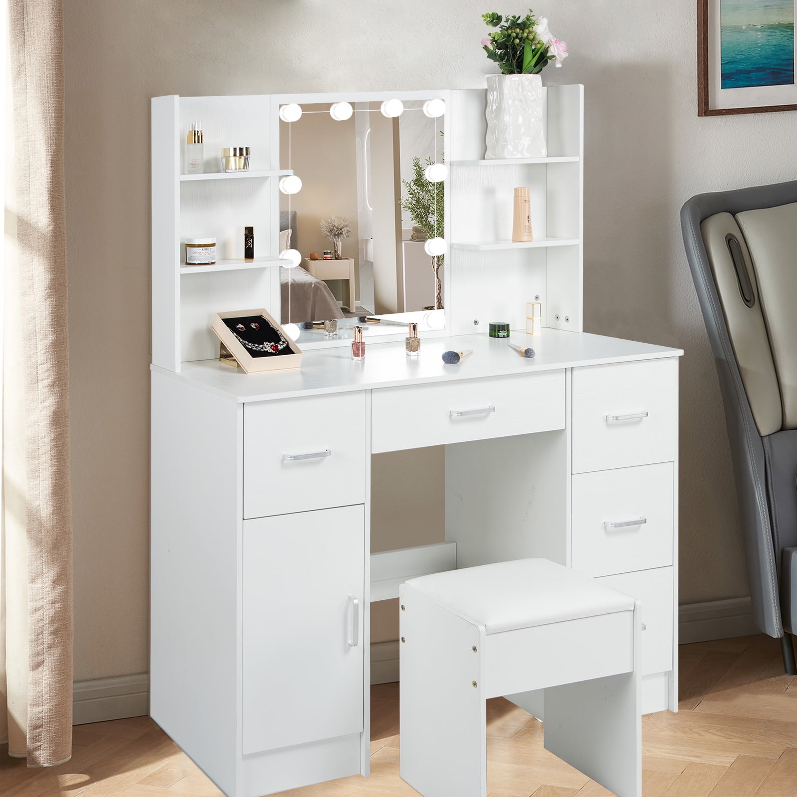 Jarbalai Vanity Table Set with Mirror and Lights and Stool, 6 Storage Shelves 5 Drawers Makeup Desk for Bedroom, White