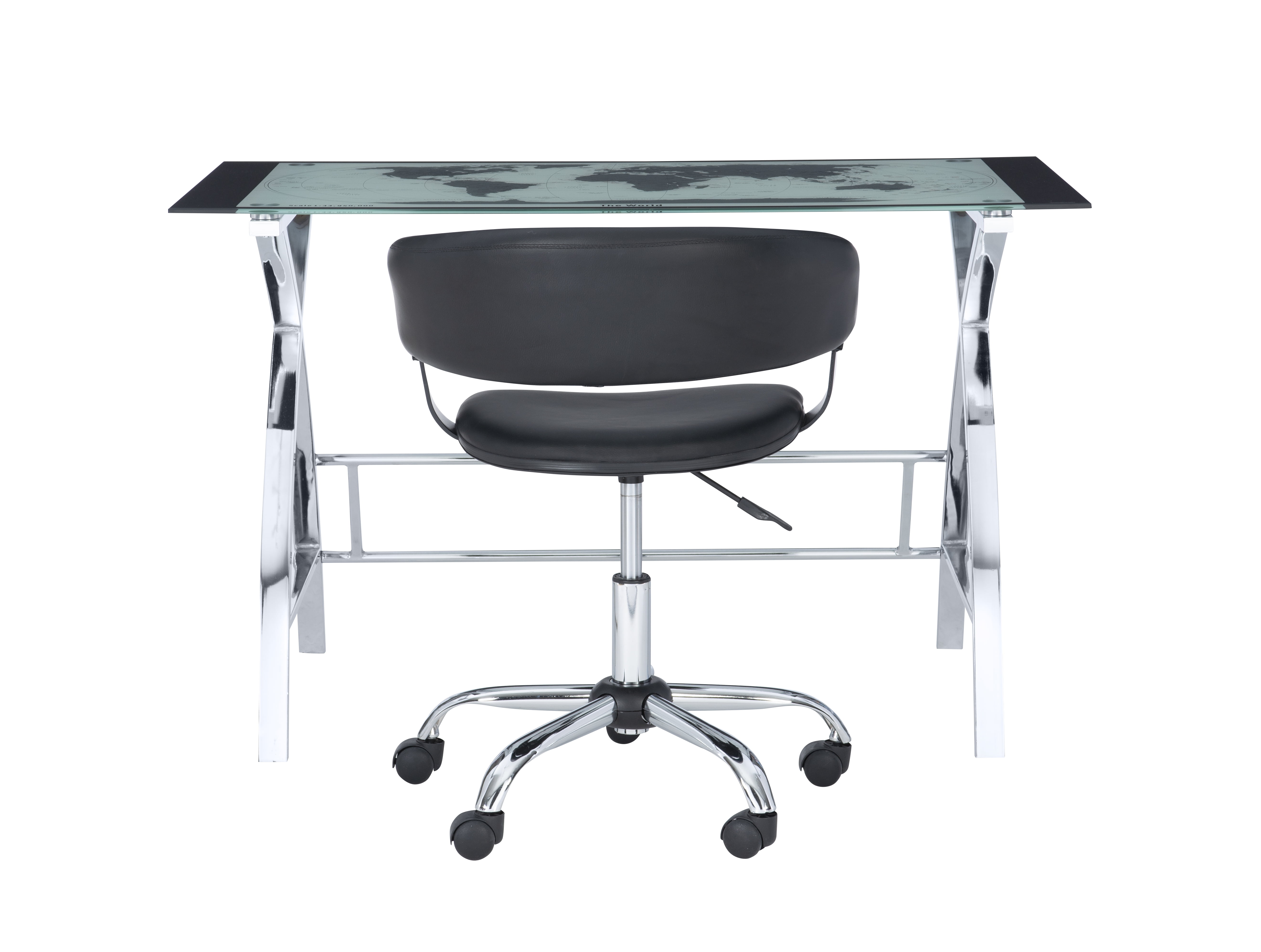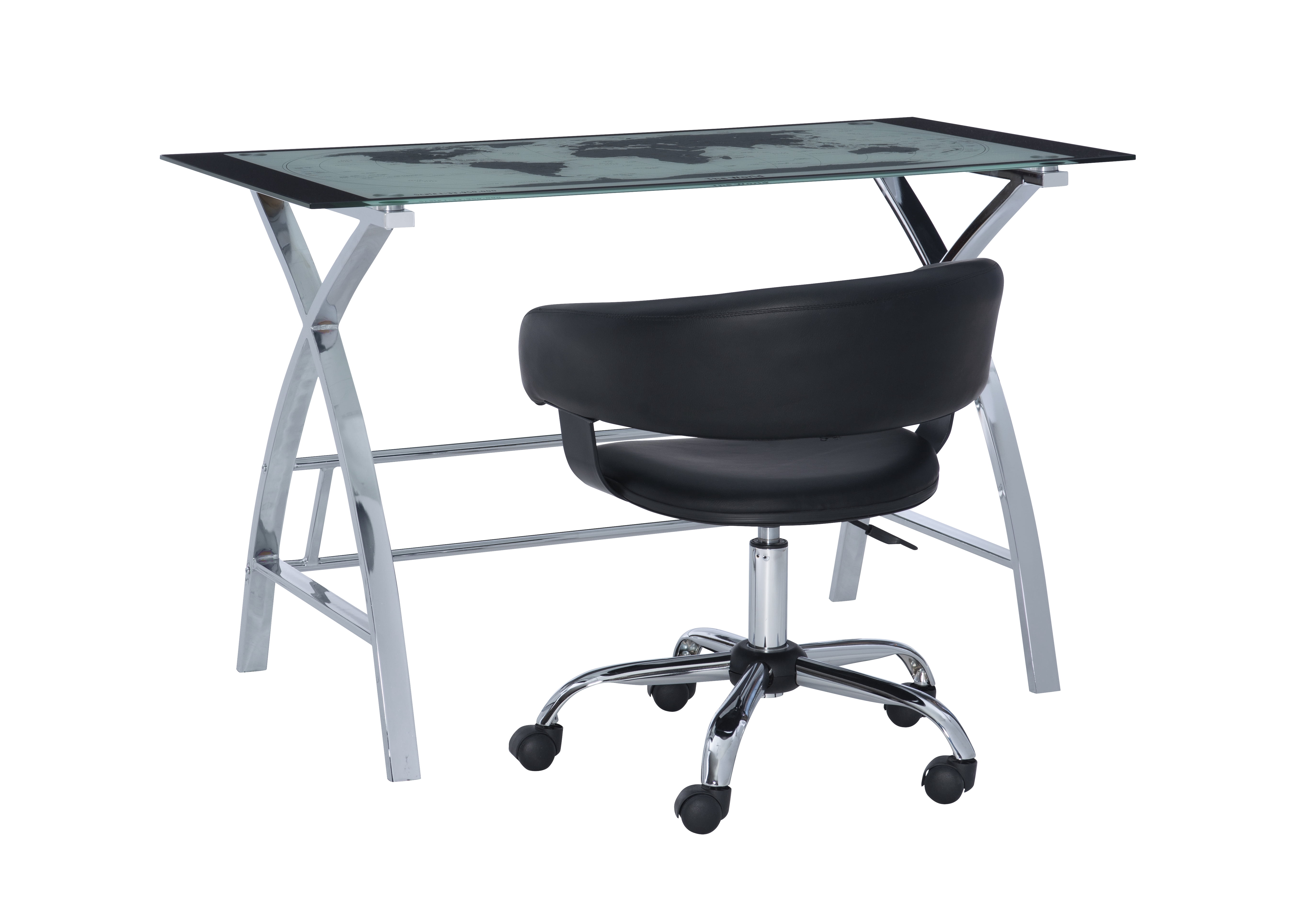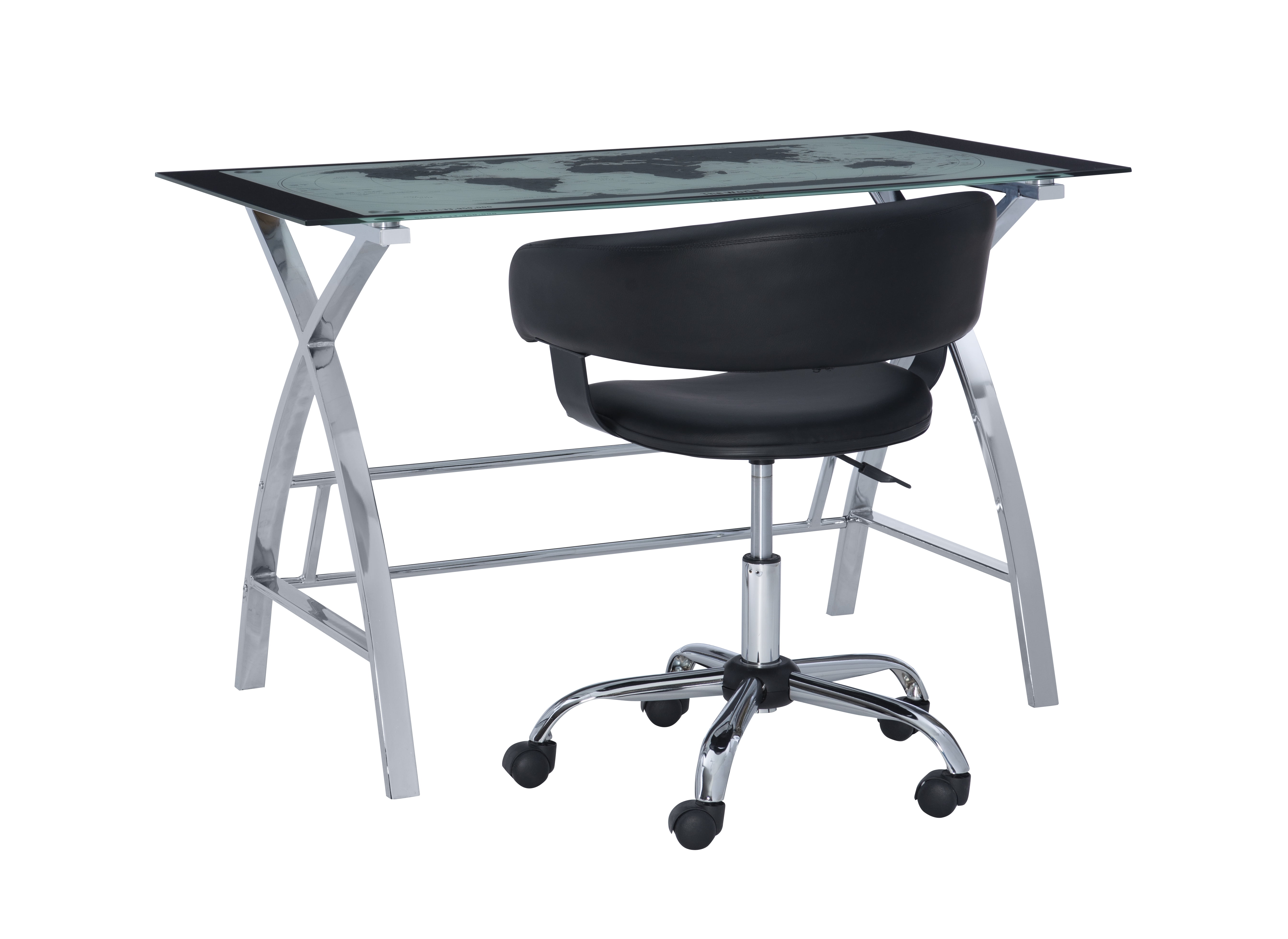 The perfect addition to any office or work area. Crafted from strong chrome plated metal and durable glass. The top features a beautiful map design. The sides feature a unique X pattern. Provides ample work space. plush swivel seat Curved Seat Back White Faux Leather gas lift Some assembly required Assembled Dimensions: Desk: 47.25″w x 23.63″d x 29.50″h; Chair: 24″w x 24″d x 26.6″-30.7″h Ships in 2 boxes