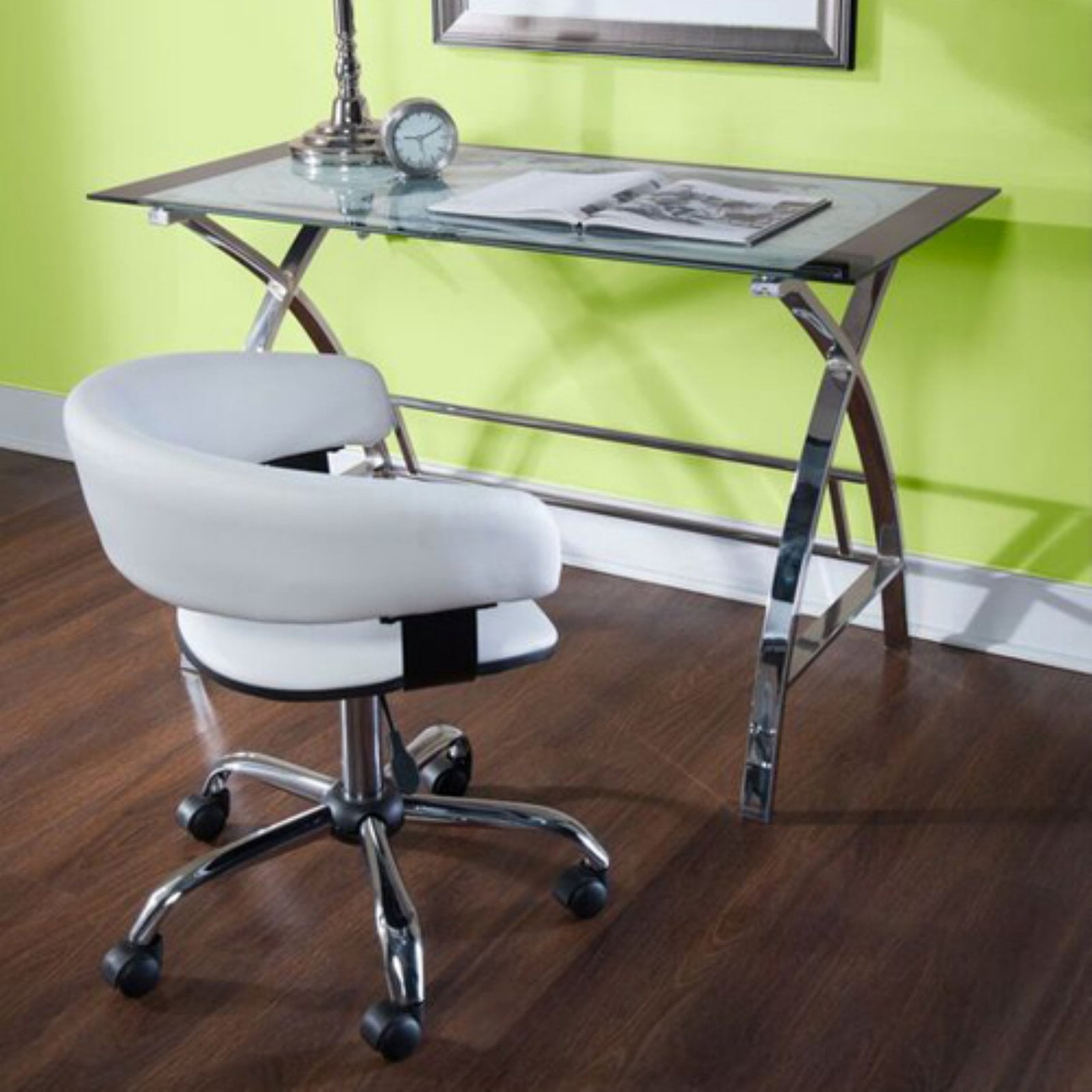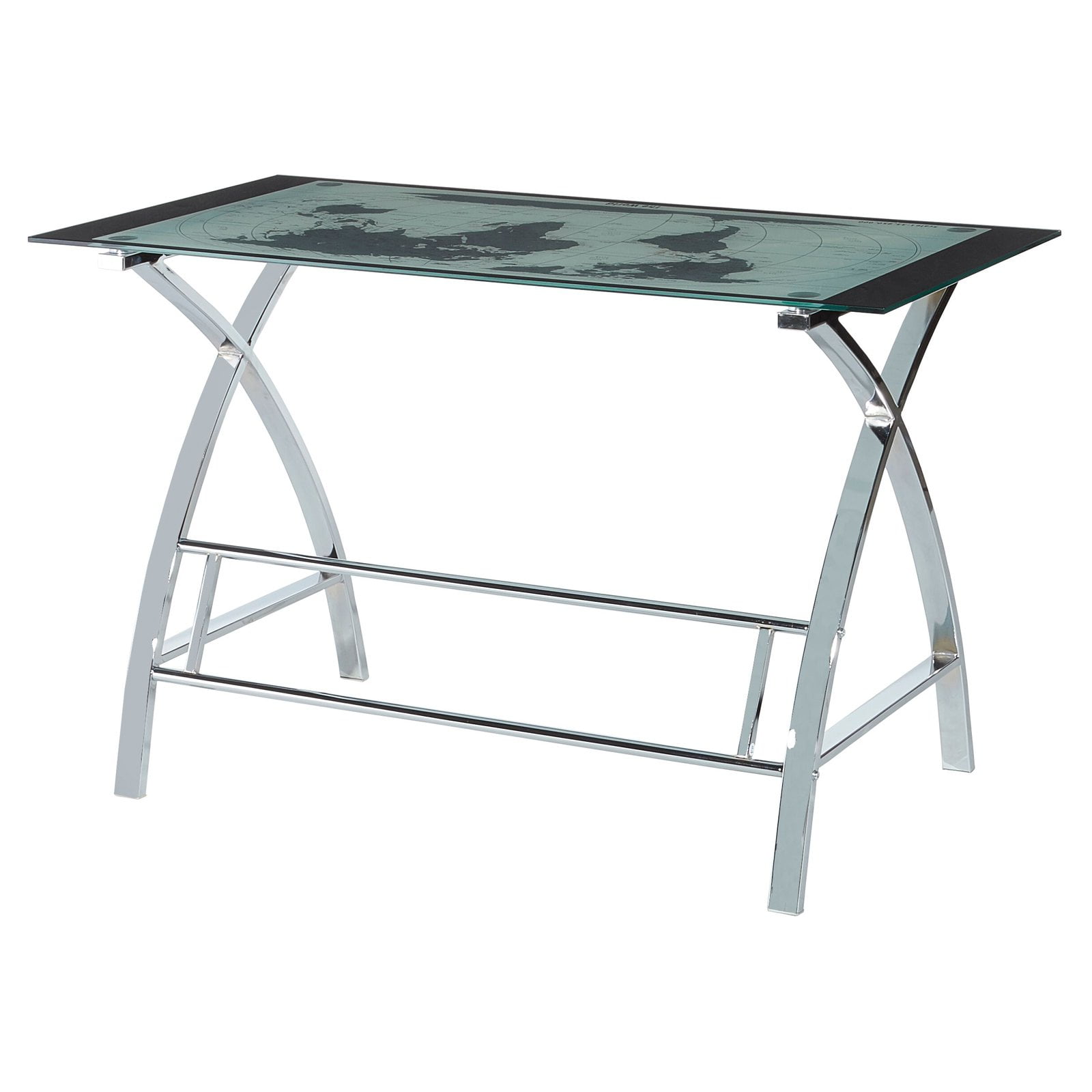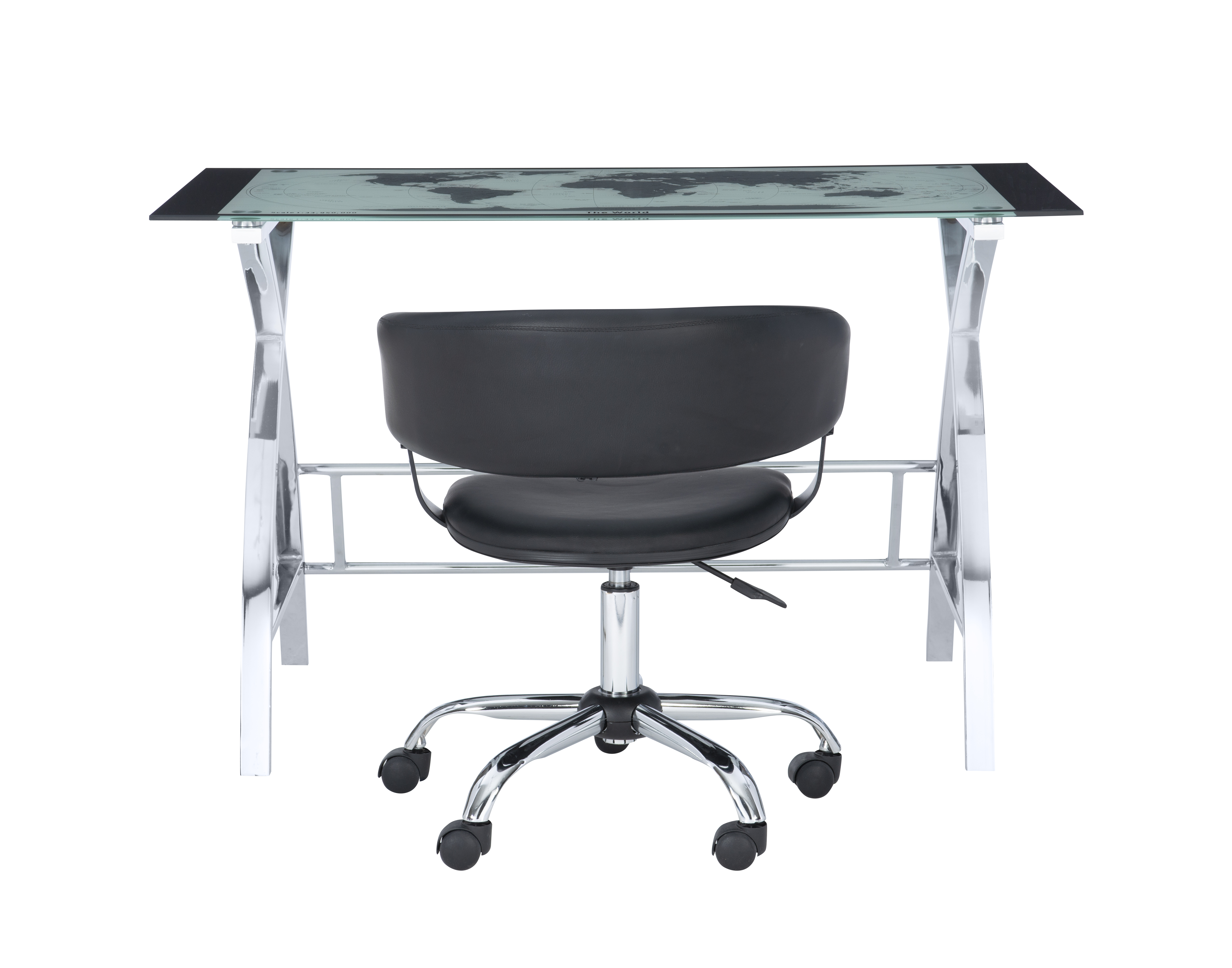 The perfect addition to any office or work area. Crafted from strong chrome plated metal and durable glass. The top features a beautiful map design. The sides feature a unique X pattern. Provides ample work space. plush swivel seat Curved Seat Back White Faux Leather gas lift Some assembly required Assembled Dimensions: Desk: 47.25″w x 23.63″d x 29.50″h; Chair: 24″w x 24″d x 26.6″-30.7″h Ships in 2 boxes