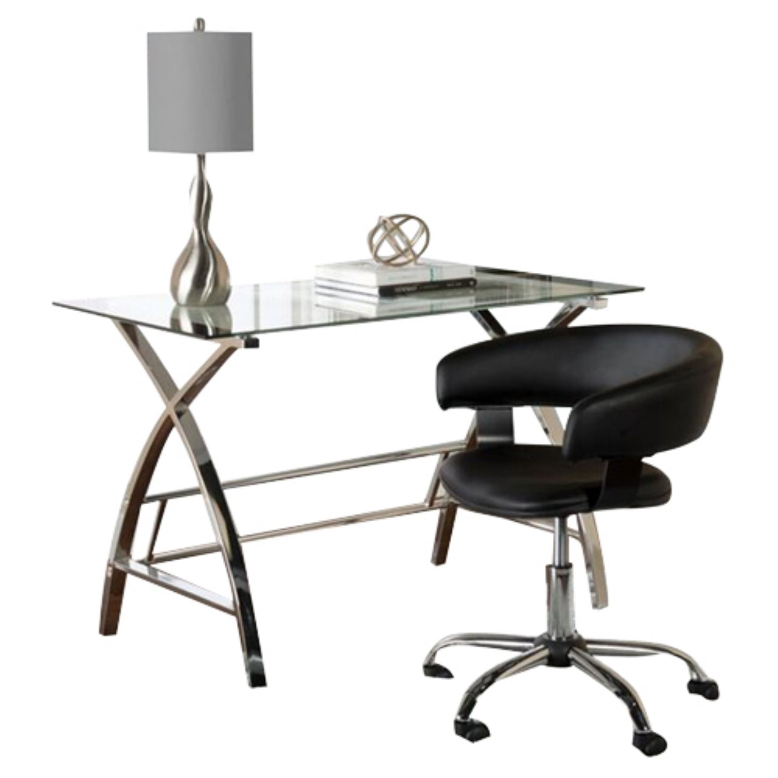 Providing ample work space and added glam, the Powell Jared Desk Set is a smart addition to your home office. Distinctive crisscross, chrome legs flank a tempered glass tabletop, spacious enough to house your laptop, work documents and other essentials. Even more, you’ll enjoy sitting in the included swivel chair, which features a curved black seat back and an adjustable height that allow you to tackle your ‘To-Do’ list in style.