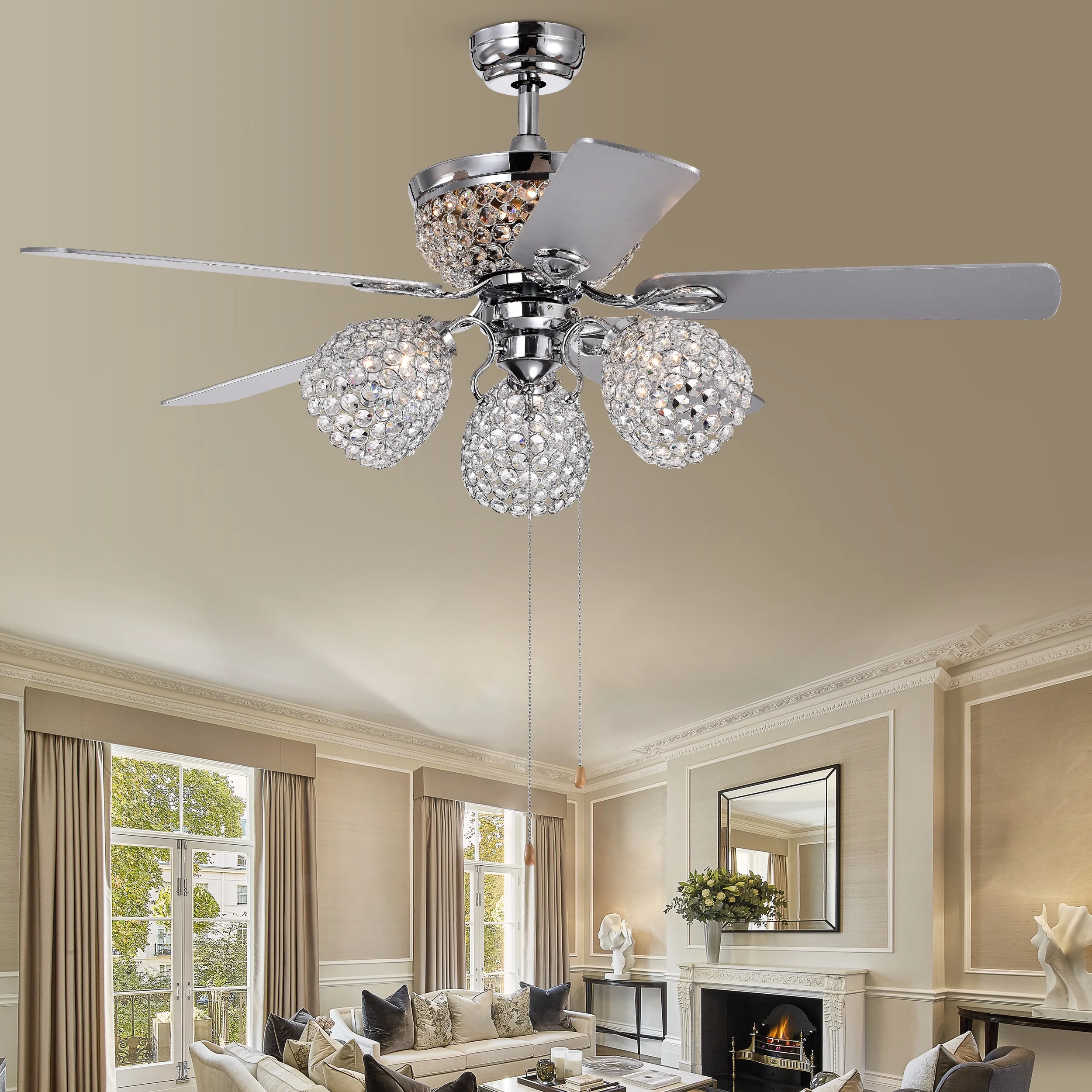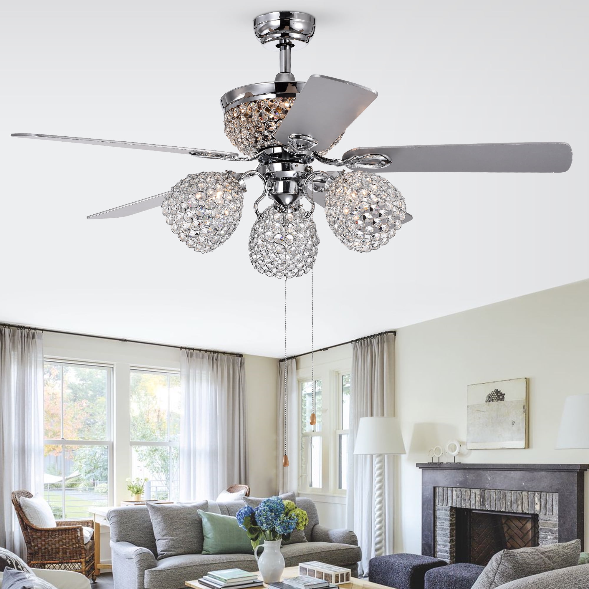 Manufacturer Part Number: CFL-8415REMO/CH This exquisite three crystal cup and upper crystal bowl lighted ceilng fan will be a welcome delight to your space. Excellent illumination and reliable ventilation. The multi-speed reversible fan insures you find the perfect comfort level. Remote Controlled for extra convenience. Item dimension: 52 x 22.52 x 52 in Item Weight: 22.38 lbs