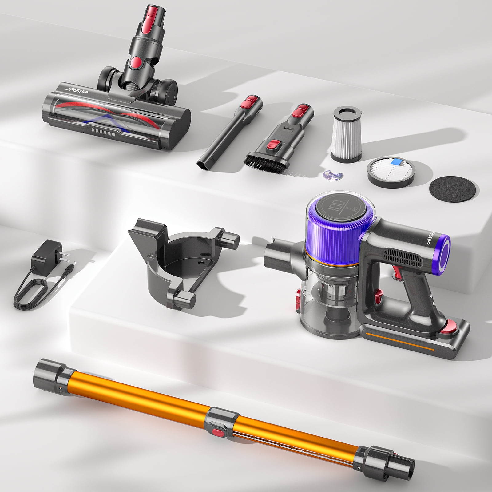 【400W/38KPA Powerful Suction】 JASTIP Flash 1 cordless vacuum cleaner is equipped with 2024 upgraded brushless motor, delivering powerful 38Kpa suction power. With 3 adjustable suction levels, it can effectively clean dust,pet hair,pet food, coffee beans, grains, scraps, flour, etc. providing deep cleaning for your home. 【Up to 55mins Runtime】 Flash 1 stick vacuum with upgraded battery ensures a thorough cleaning of the entire 200² square meter house.This rechargeable vacuum cleaner only takes 4 hours to fully charge. You can purchase extra batteries in the store for a longer run time. 【All-in-one LED display】 Built-in the latest LCD smart sensor, Flash 1 vacuum cleaner has a user-friendly interface, which shows real-time suction mode, remaining battery value and alerts you when the vacuum is clogged,providing you with a more convenient and efficient cleaning experience. 【7-layer whole machine filtration】This wireless vacuum is featured with multi-cone cyclone filtration, effectively reduce the clogging of the vacuum cleaner filtration system, which can captures 99.99% of of particles expels cleaner air,Additionally, this cordless vacuum is equipped with a scented sheet filter layer, providing a pleasant fragrance while cleaning. 【V-shaped Upgraded Brush&&1.5L Dust Cup】 The newly upgraded V-shaped rolling brush can effectively reduce hair entanglement.With a big capacity of 1.5L dust cup, and the box can be easily emptied with the push of a button. What’s in The Box? Cordless vacuum cleaner*1 Battery Pack*1 Telescopic Rod*1 Power adapter*1 Wall Hanging*1 Long Crevice Nozzle*1 2 in 1 Brush*1 HEPA Filter*1 Hardware Bag*1 Goose head cleaning brush*1 User Manual*1