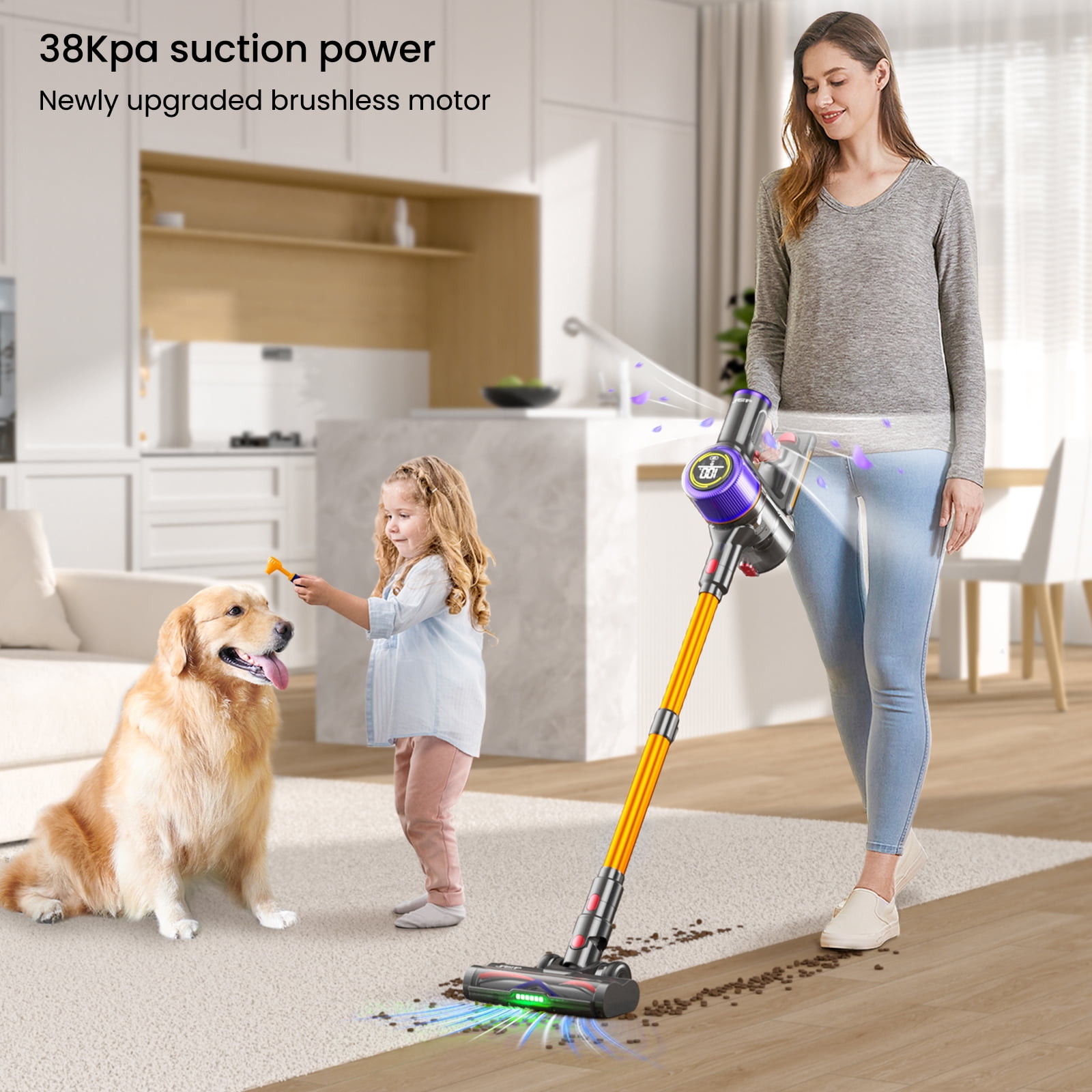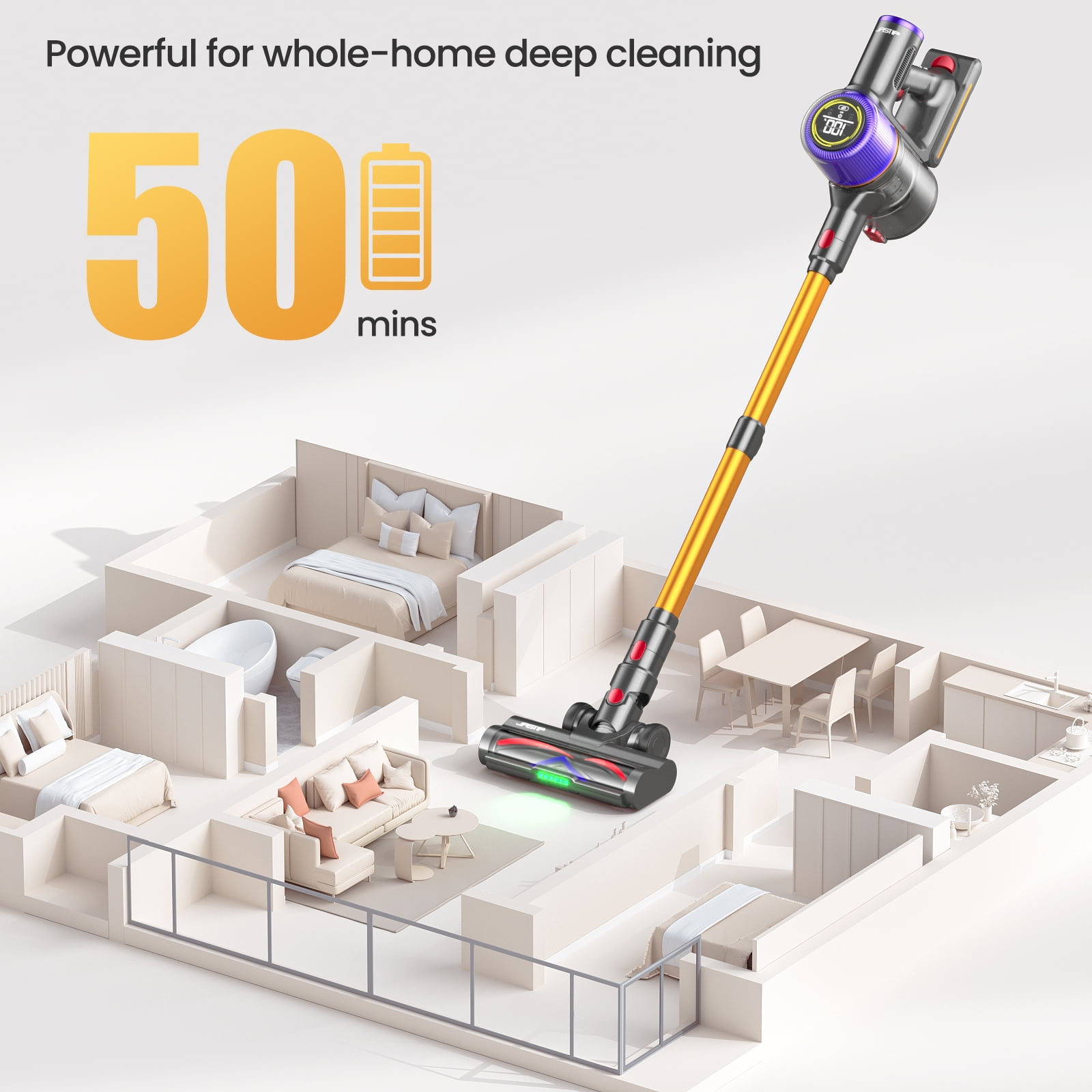 JASTIP Cordless Stick Vacuum Cleaner with Touch Screen, 55 Mins Runtime, 400W/38KPA Powerful Suction, Portable Vacuum for Household Pet Hair, Carpet and Hard Floors