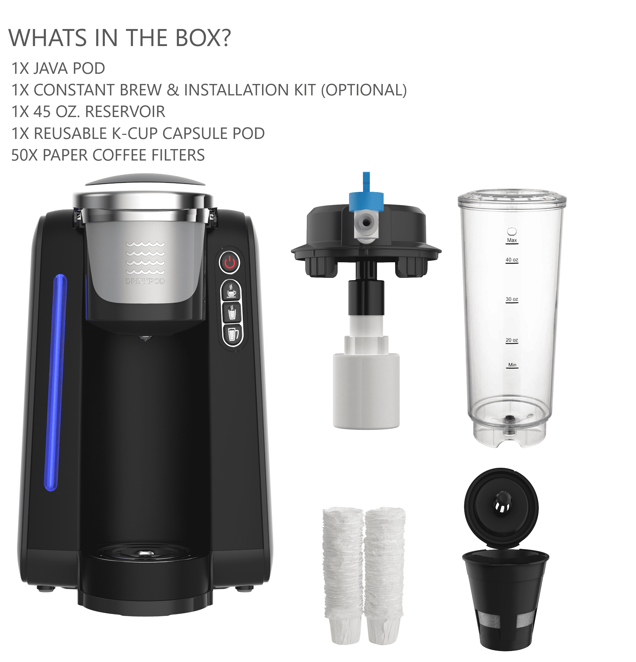 Exclusive Refillable or In-Line Water Design – A truly one-of-a-kind coffee brewer make the JAVAPod 1 features a manually refillable water reservoir for countertop use and an option for connecting a water line for offices or shared workspaces. · Pre-Programmed Dispenser Sizes – Our versatile K-cup coffee maker also features fill presents to let you fill up a small coffee cup, medium coffee mug, or even a bigger travel tumbler. Perfect for starting off the day or relaxing in the evening. · Enjoy K-Cups or Traditional Coffee – We’ve included 50 paper coffee filters and a refillable pod capsule with built-in steel mesh strainer with our JAVAPod 1 brewer so you can enjoy single-serve K-cups or use your favorite coffee grounds seamlessly. · Trusted Quality Assurance – Our JAVAPod 1 was designed to support your everyday life at home or at work which is why it’s backed by our responsive customer service and long-lasting quality you can trust.