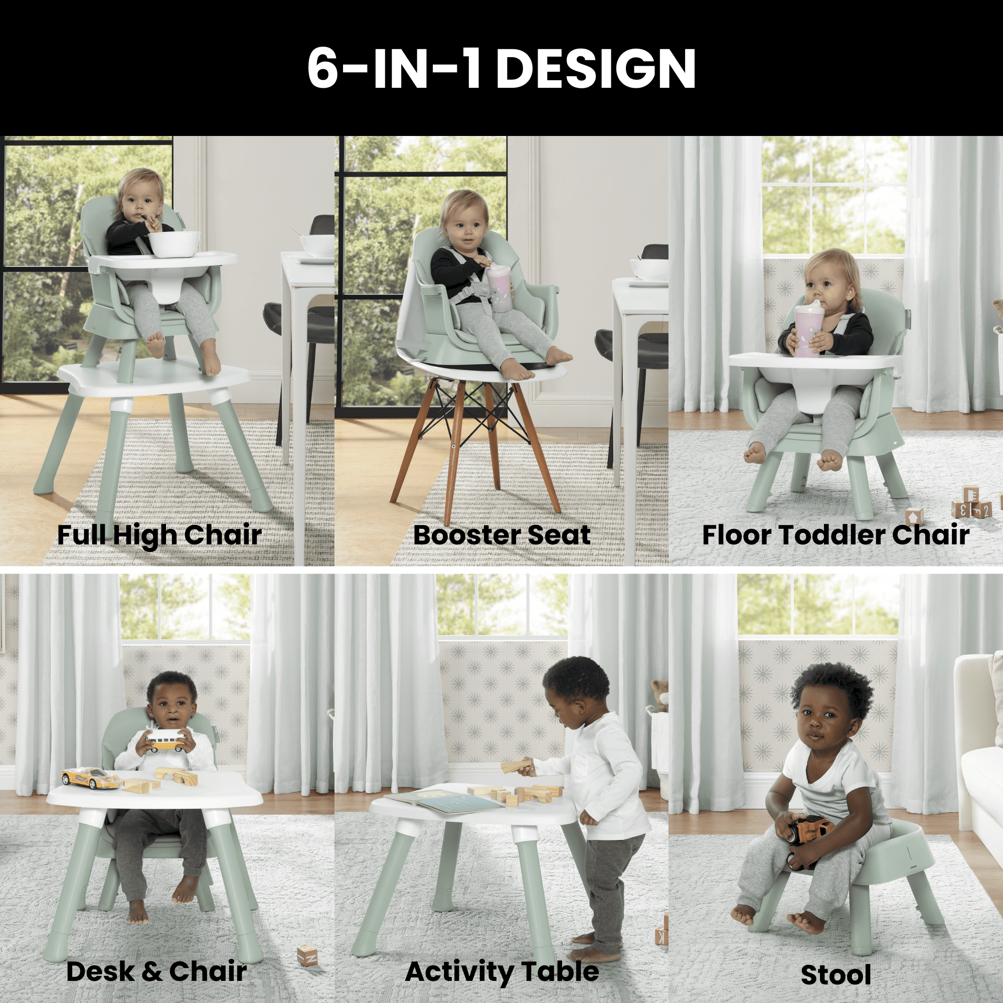 6 MODES OF USE: This convertible high chair has a variety of modes to suit your baby’s next stage of development | Use as an infant high chair, stool, booster seat, floor toddler chair, activity table and a desk and chair STYLISH DESIGN: The stylish, contemporary silhouette and neutral color palette of this high chair will complement your home | No tools needed for assembly, easy snap-in design allows you to set up quickly EASY TO CLEAN: Water-resistant leatherette seat cover is easy to wipe clean | Easy to wipe clean with smooth surfaces from top to bottom |No hidden crevices for food to get stuck | Adjustable meal tray with 3 positions SAFE OPTION: Five-point safety harness | JPMA certified to meet or exceed all ASTM and applicable CPSC standards | Anti-slip rubber feet reduces unwanted sliding | Meal tray made of non-toxic and food-grade PP