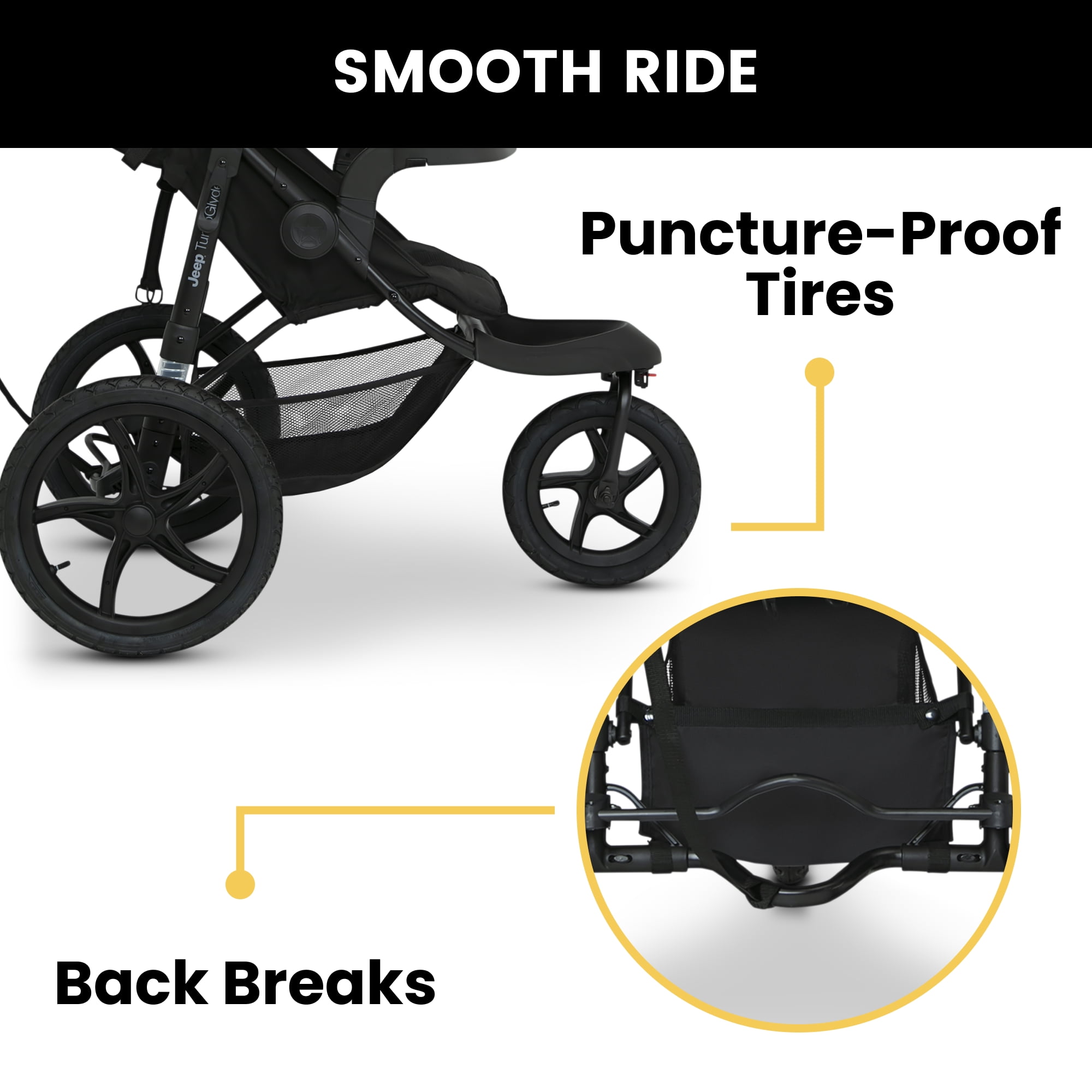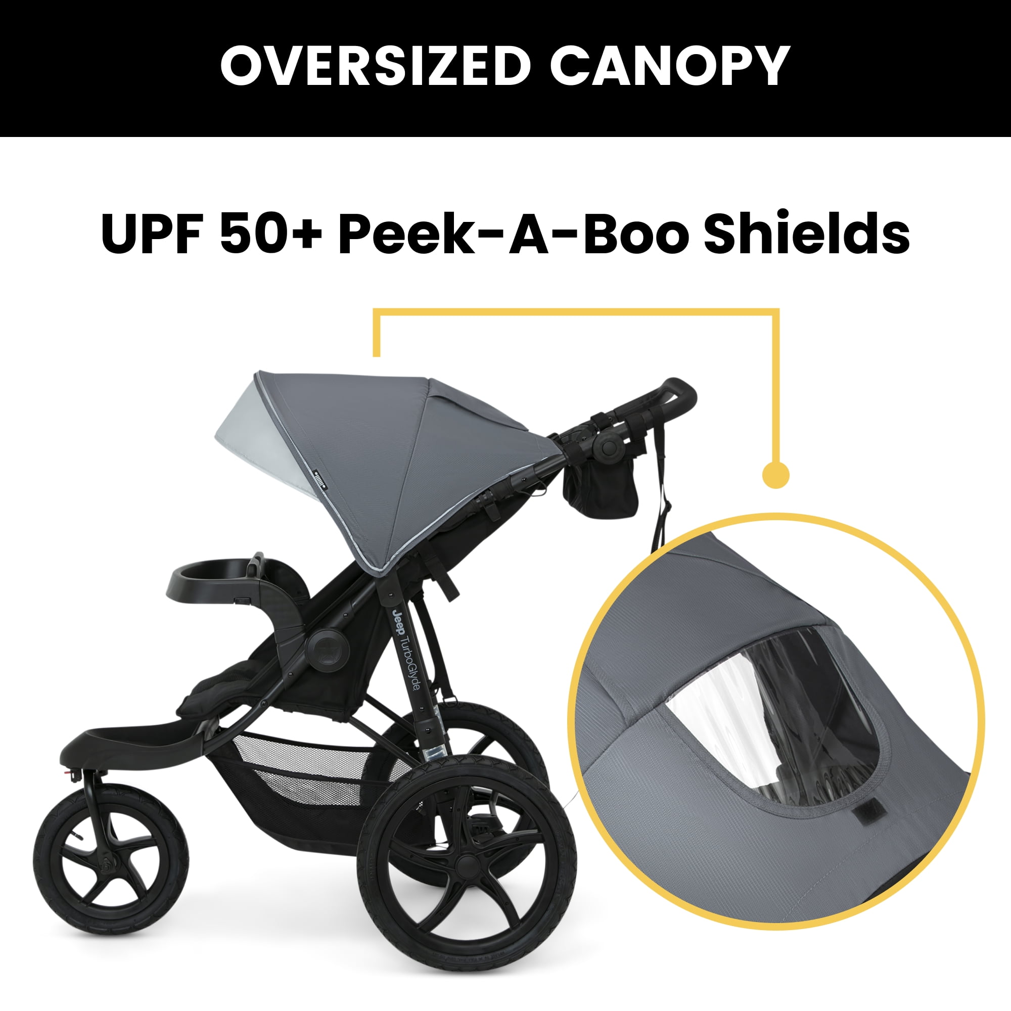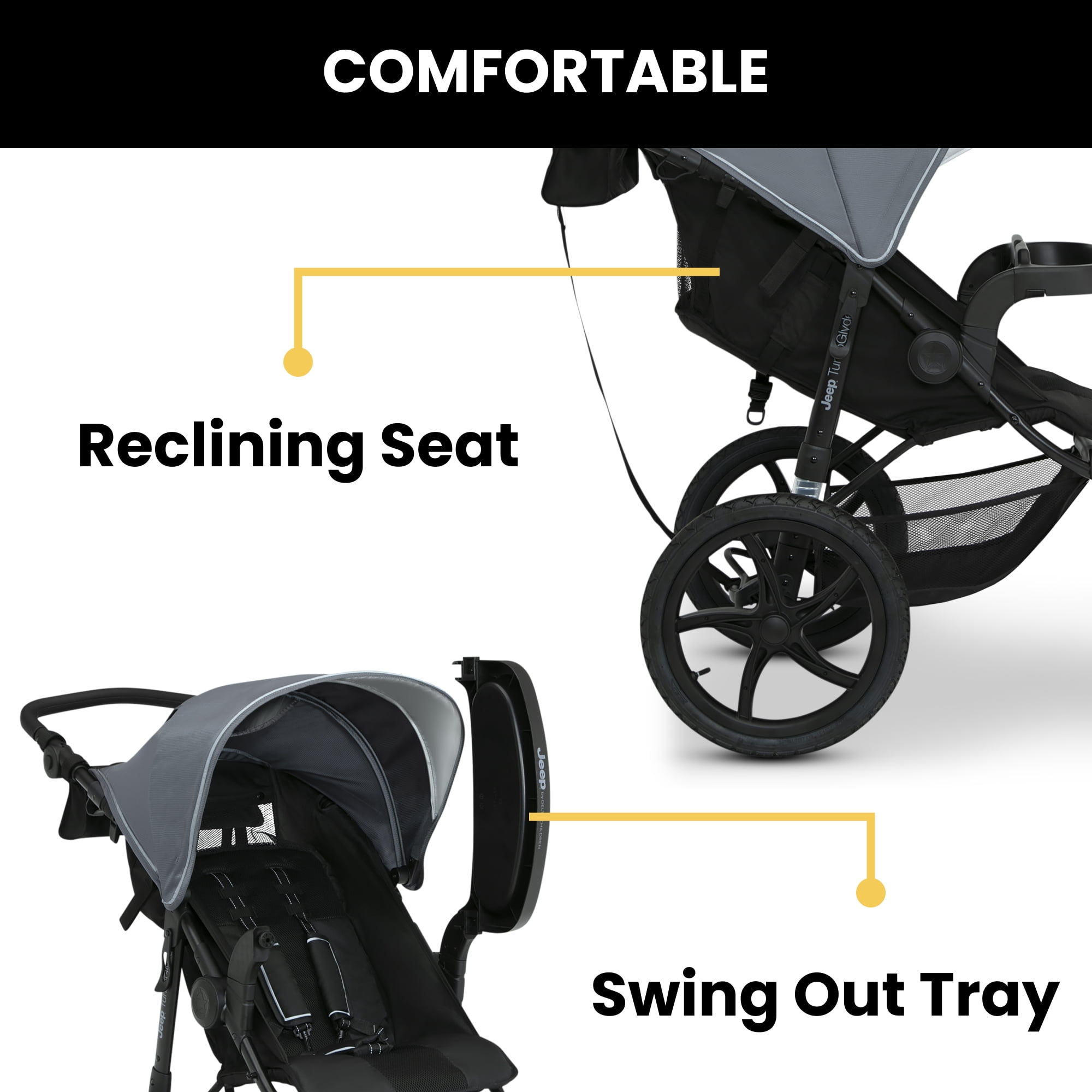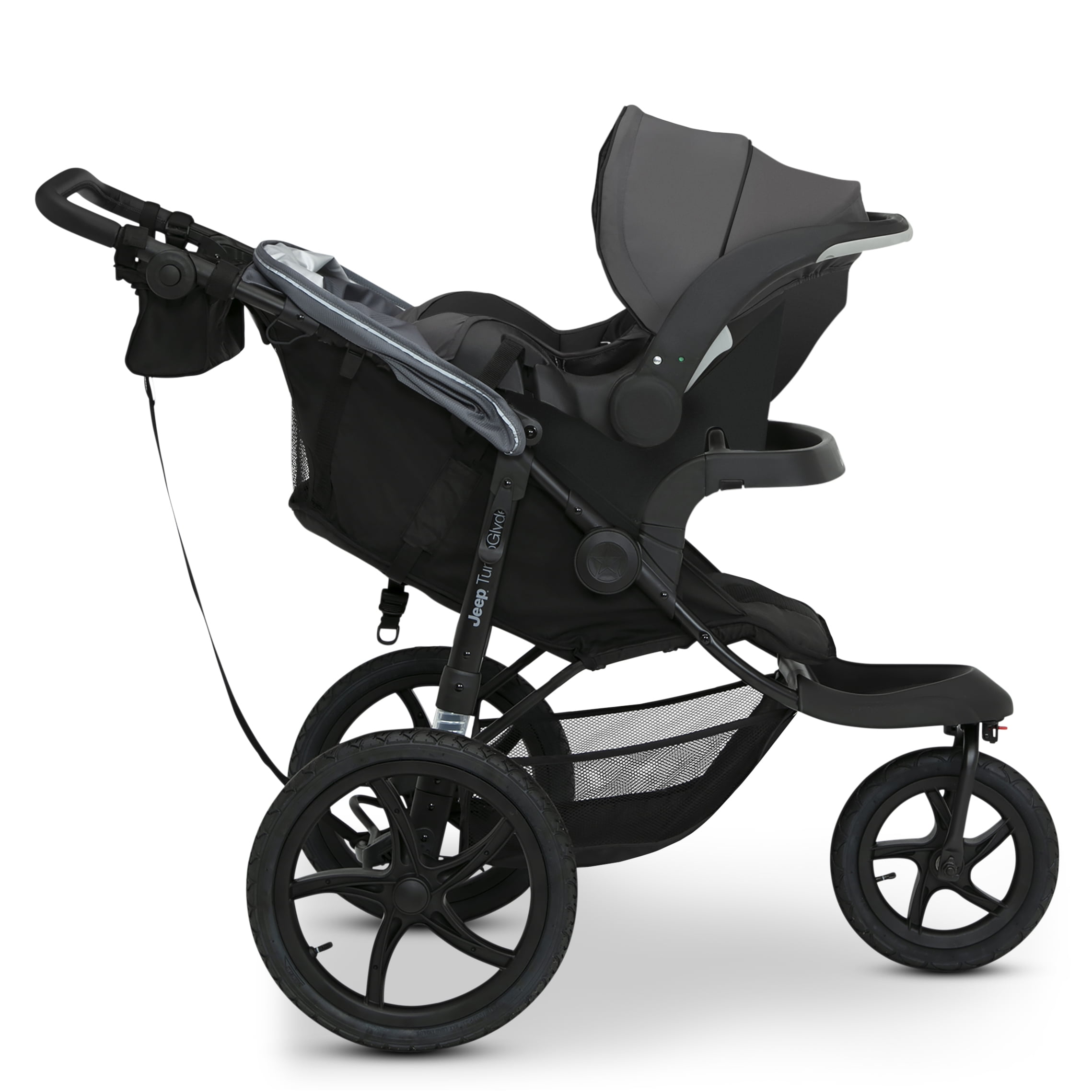 SMOOTH RIDE: This jogging stroller features a swivel front 12-inch front wheel and 16-inch back wheels with one-step brake | Shock absorbing frame PROTECTS THEM FROM THE ELEMENTS: Extendable water-resistant canopy with UPF 50+ and peek-a-boo window shields kids from the sun, rain, wind or snow TONS OF STORAGE: You’ll have plently of storage space with the included parent organizer with two cup holders and extra-large basket under the frame KEEPS KIDS & PARENTS COMFY: Adjustable leatherette handlebar works for all different heights | Swing out child tray | Reclining seat features multiple positions so kids can sit, rest or sleep COMPATIBILITY: This Jogging Stroller fits the following car seats with the included adapater: Graco SnugRide Click Connect; Evenflo Nurture; Evenflo Embrace | For Britax B-Safe 35 Car Seats, please use the Jeep Jogger Car Seat Adapter #10040-2294 (sold separately). For Chicco KeyFit 30 Car Seats, please use the Jeep Jogger Car Seat Adapter #10020-2294 (sold separately) COMPACT FOLD: Flat fold and quick-release back wheels allow for hassle-free transport or storage SAFE OPTION: 5-point safety harness with reflective piping for nighttime walks | Stroller includes safety tether to use while jogging | JPMA certified to meet or exceed all safety standards set by ASTM SIZE/WEIGHT: Weighs: 24.7 lbs. | Assembled: 46″L x 11″W x 41″H | Folded: 36″L x 11″W x 17″H | Recommend for ages 9 months up to 50 lbs. “
