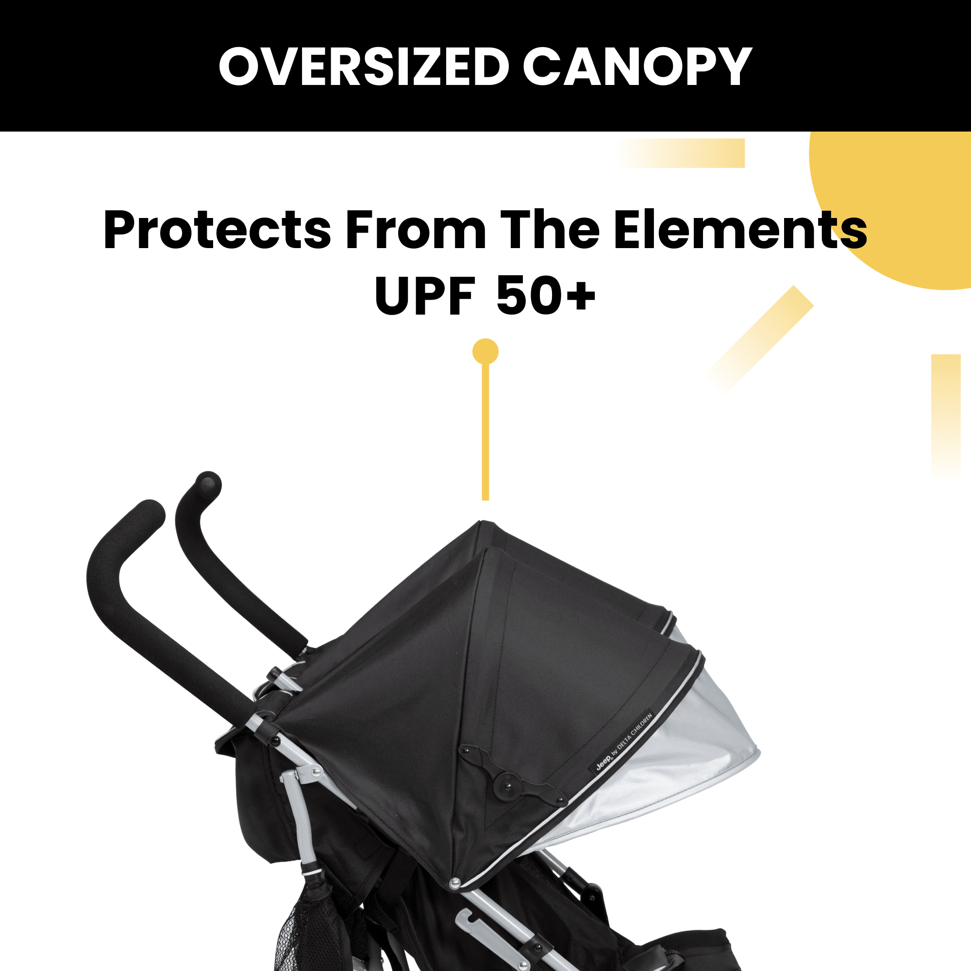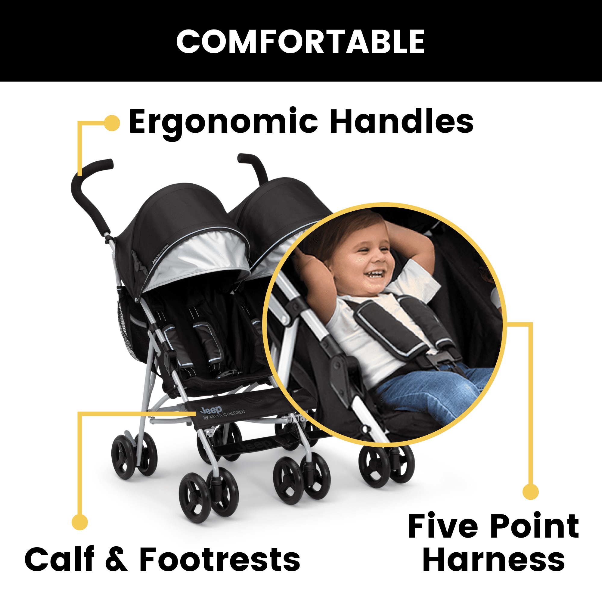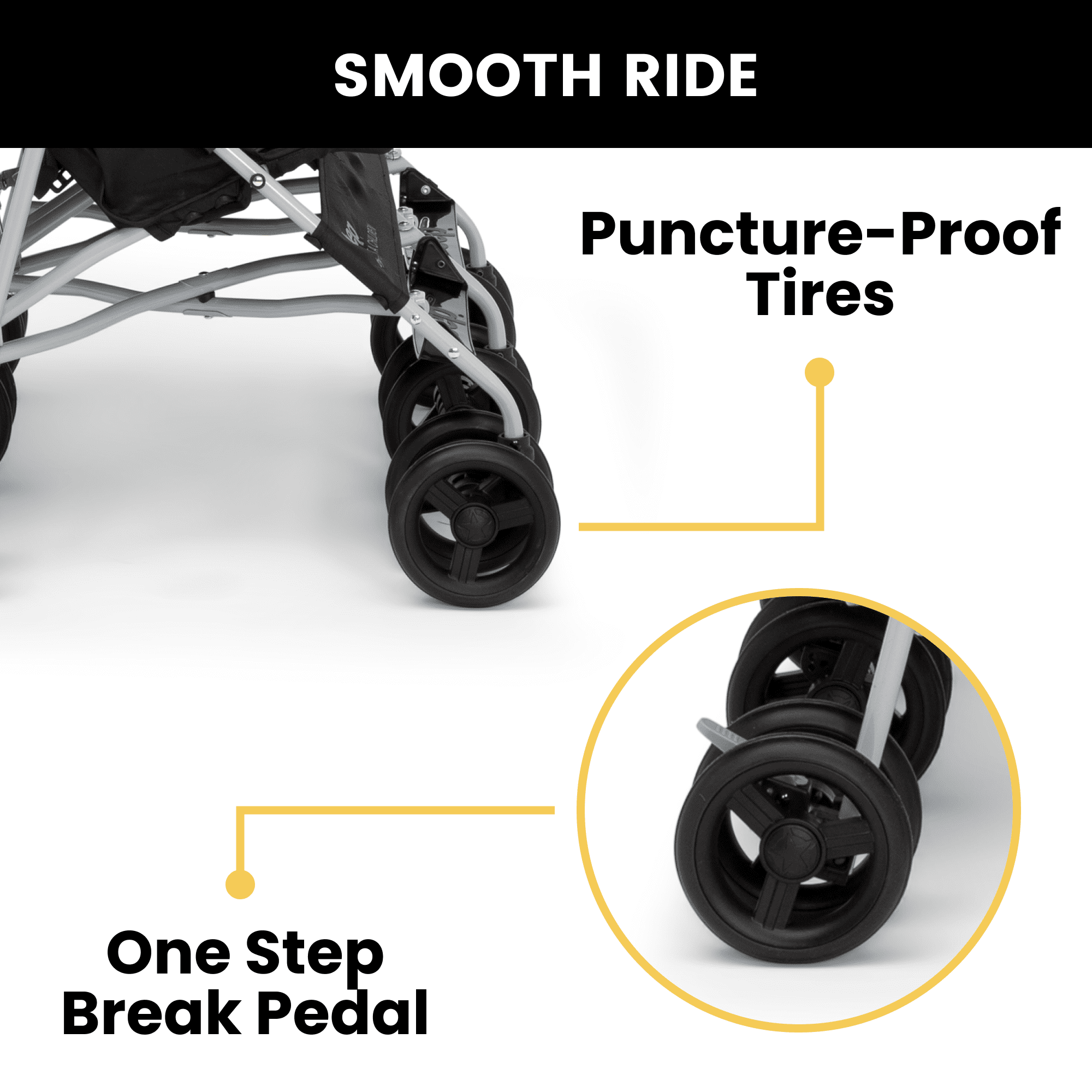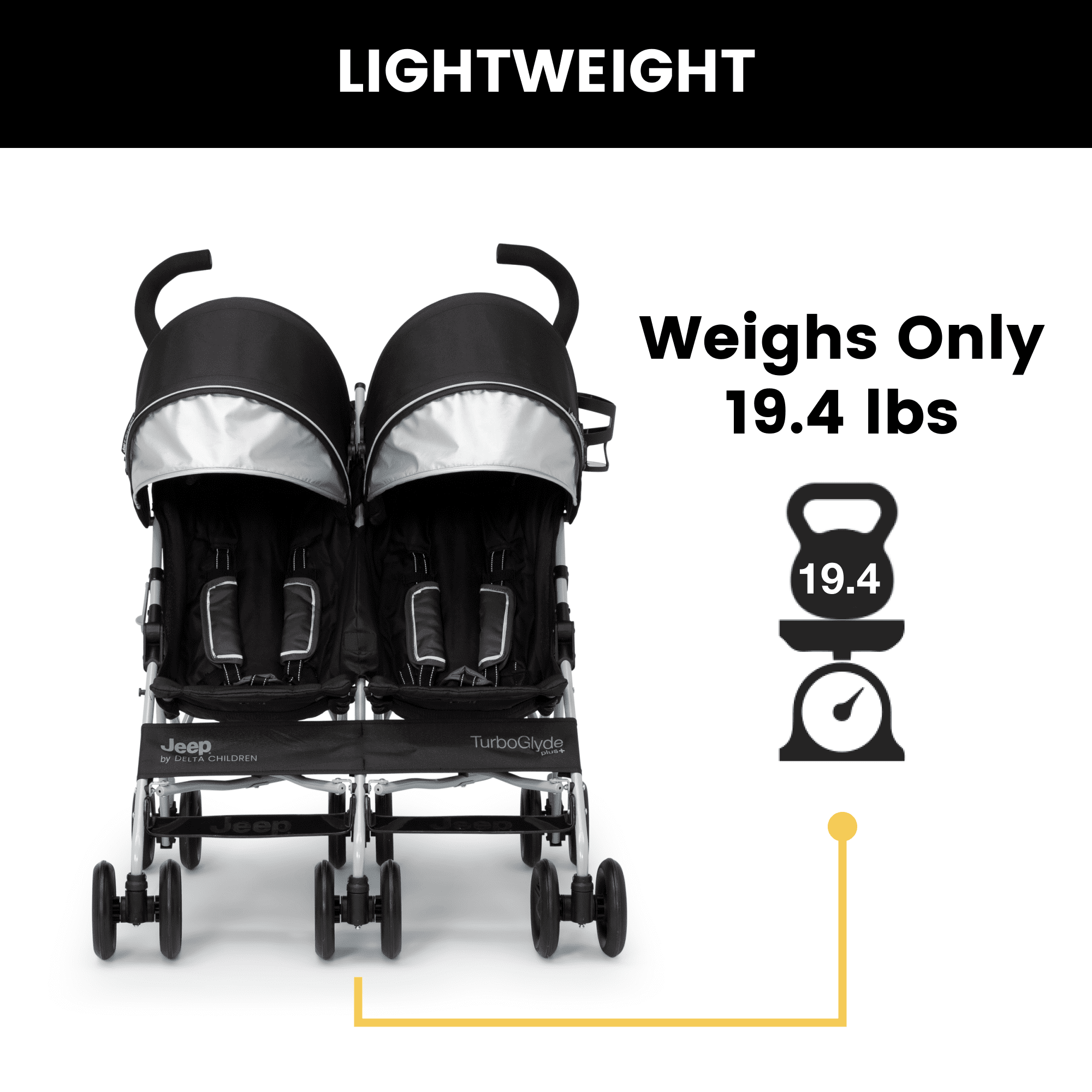 SMOOTH RIDE: Swivel front wheels feature precision technology for outstanding control and effortless push, easier than ever to glide, turn and maneuver | Separate back step brakes | Puncture-proof/never flat 5.5-inch tires are durable LIGHTWEIGHT: The ultimate in convenience, this lightweight double stroller has a durable frame that only weighs 19.4 lbs. COMPACT FOLD: The easy compact umbrella fold with carry handle and manual lock is ideal for travel or everyday use | Meets theme park size requirements | Folded dimensions: 19″L x 9″W x 46″H DESIGNED FOR COMFORT: Keep kids comfy with calf rests and footrests | Ergonomic handles | Extendable sun visors have UPF 50+ protection | 2 mesh storage pockets and extra-large parent cup holder SAFE OPTION: JPMA certified | 5-point safety harnesses | Reflective piping on shoulder pads | Recommended for ages 9 months up to 35 lbs. per seat (70 lbs. total) | Assembled dimensions: 32.5″L x 29.7″W x 38″H