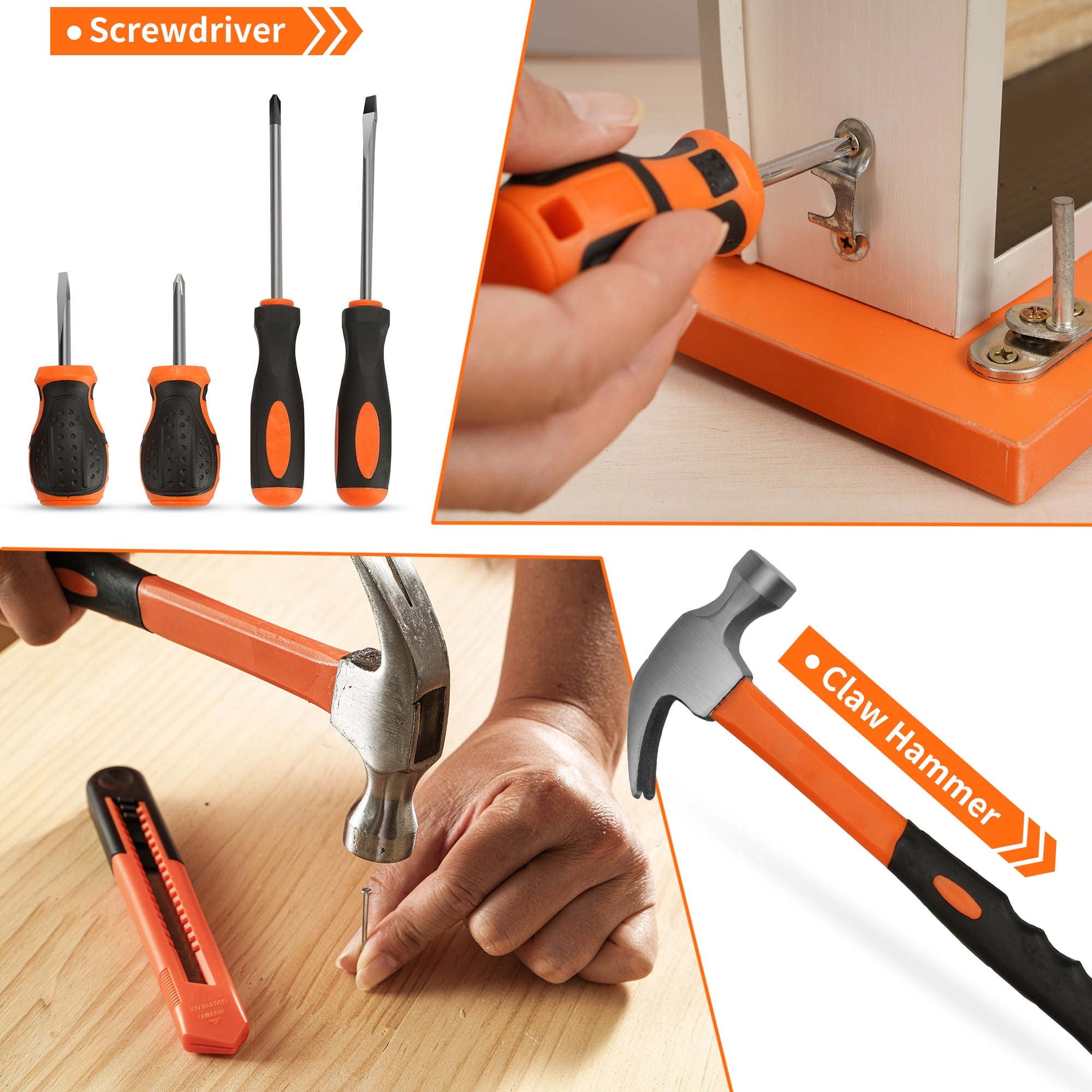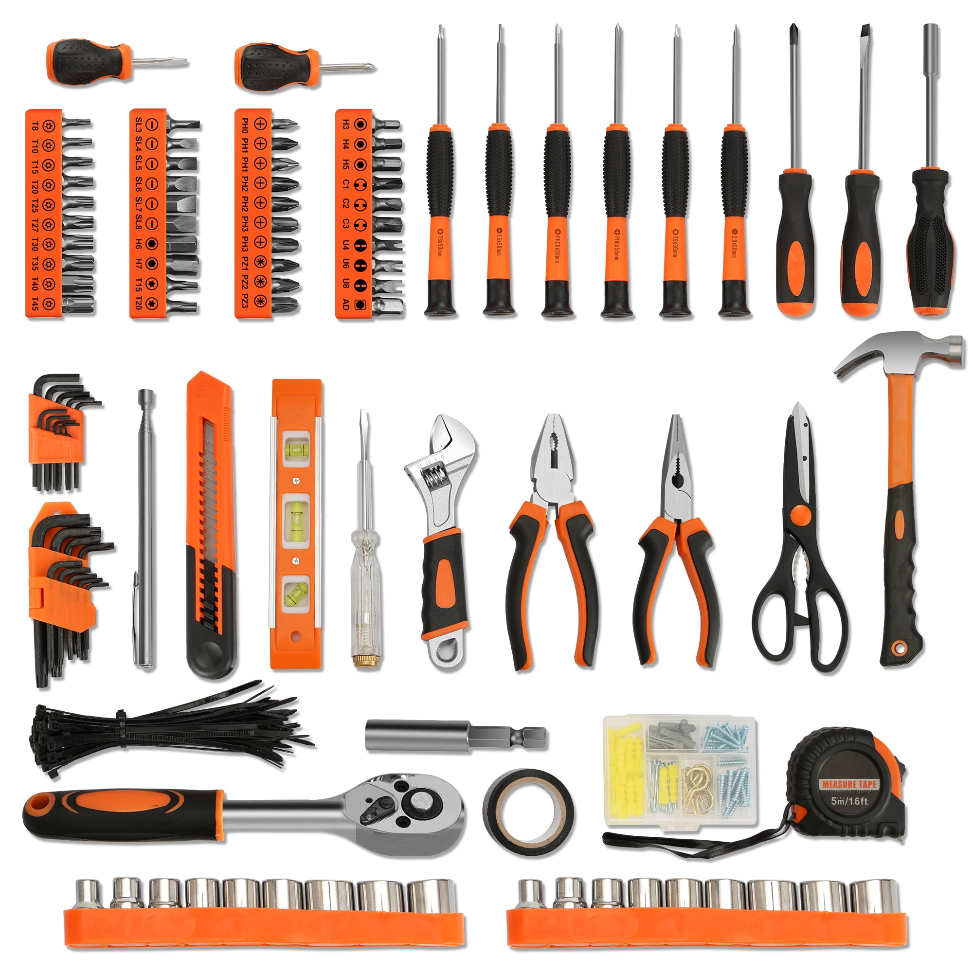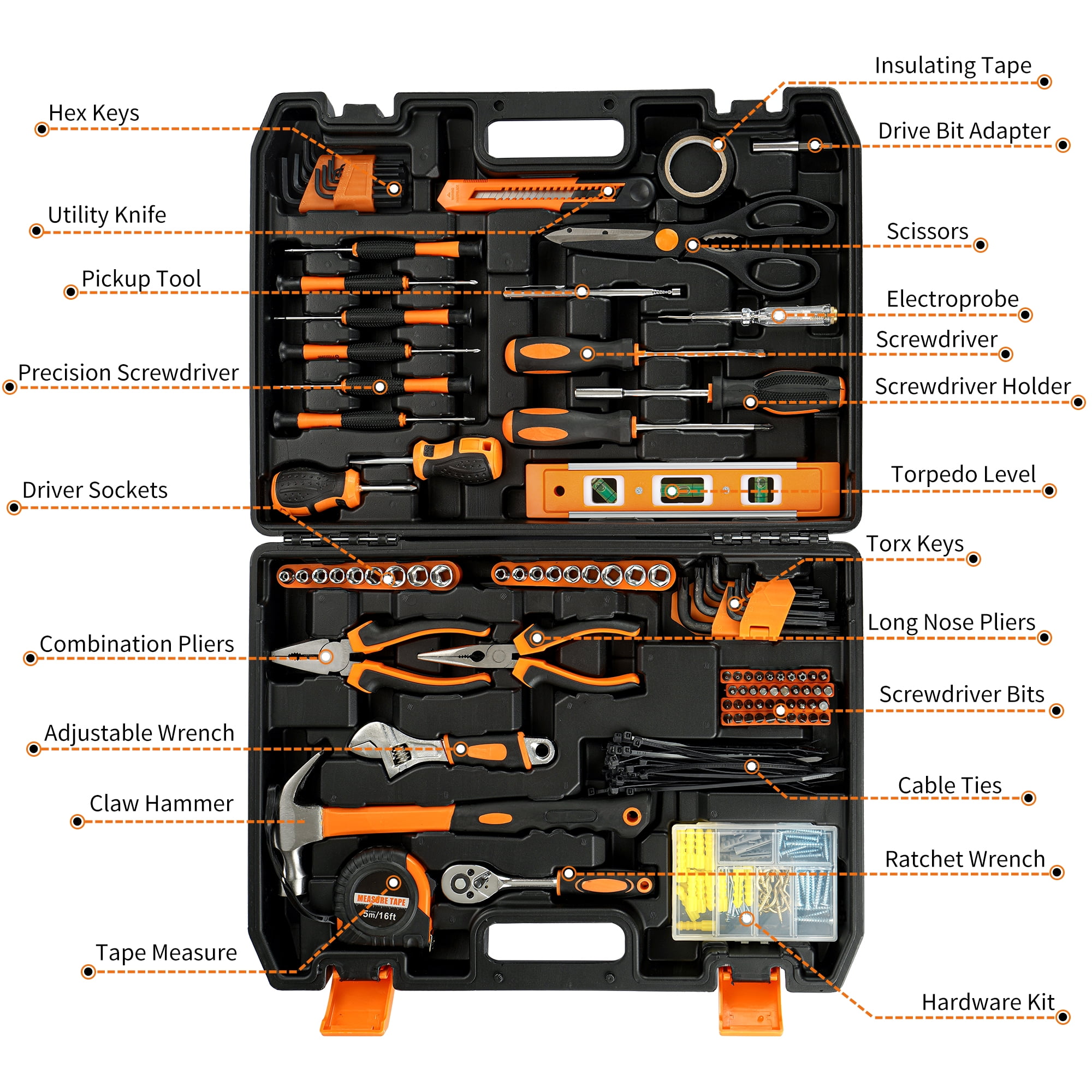 ????️【COMPLETE HOUSEHOLD TOOL SET】 Contains tools needed for small repairs and basic DIY projects around the house. Perfect for Handyman’s, repairmen, mechanics, body shops etc. Also a great tool set to have at home, garage and the workshop. ????️【EASY TO CARRY & STORAGE】 This tool set comes with a sturdy case to protect and house all your tools in one place. This makes it easy to carry tools around to your area of work whilst keeping everything neatly organized and ready to store away when you’re done. ????️【WIDE RANGE OF TOOLS】 Tool kits for household comes with a rich collection of tools to suit any job. You will receive combination wrenches, long nose pliers, polished quick release ratchet, adjustable wrench, rip claw hammer, measure tape rule, drive sockets and more. ????️【HIGH QUALITY BUILD QUALITY】 Forged from high-quality steel and finished in high-polish chrome provides plenty of strength, durability, and anti-corrosion protection. All the tools meet or exceed ANSI critical standards. ????️【COMPACT TOOL SET】 The case is tight and compact, and features a dirt-resistant design with a diamond shape pattern. The overall dimensions of the small tool set case is 16.9″ x 8.7″ x 3.2″. Overall, this basic tool set has a net weight of 8.8 lbs. ????【IDEAL GIFTS】 This tool set is a great option for housewarming, corporate, and college-bound students. It contains the tools needed for most small repairs around the house, making it an option for homeowners and DIY enthusiasts.