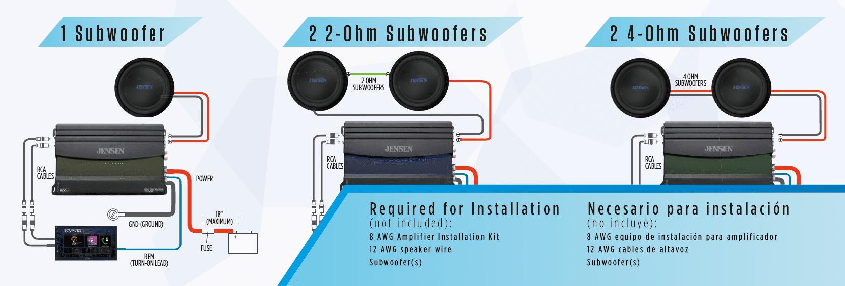 CLASS D MONO AMPLIFIER the 1 channel configuration ensures an overall improvement in sound quality and power output while reducing distortion and refining efficiency CLASS D EFFICIENT DESIGN produces 1,200 Watts peak power, 240 Watts RMS x 1 channel @ 4 ohms , 400 Watts RMS x 1 channel @ 2 ohms and 600 Watts RMS x 1 channel @ 1 ohm RGB ILLUMINATION VIA BLUETOOTH APP the Jensen DSP app allows you to have full control over your amplifiers various functions such as: Illumination, Remote Bass, Frequency, Volume and Gain LOW PASS CROSSOVER & BASS BOOST when constructing your Jensen mono amplifier, we added a low pass variable crossover plus a variable bass boost at 45Hz SHORT CIRCUIT PROTECTION given the vast amounts of dynamic power in your mono amplifier we built-in a thermal DC offset safety protection New Condition