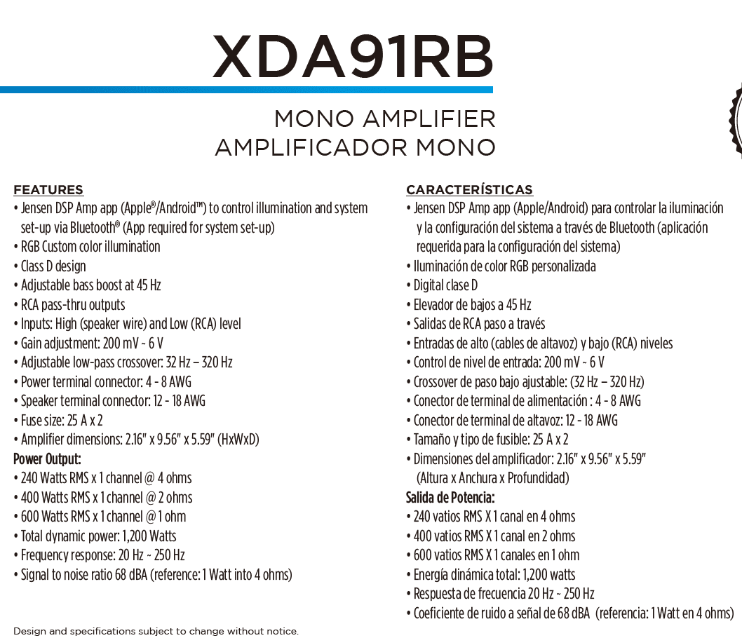 The XDA91RB amplifier was engineered with specific linear circuitry that improves sound quality and power output. Additional features include adjustable bass boost at 45Hz, high level input (speaker wire), low level input (RCA), adjustable low pass crossover and a 5 Band EQ . The Jensen DSP App connects to your amplifier via Bluetooth and allows you to full control over your amplifiers various functions such as illumination, remote bass, frequency, volume and gain. New Condition.