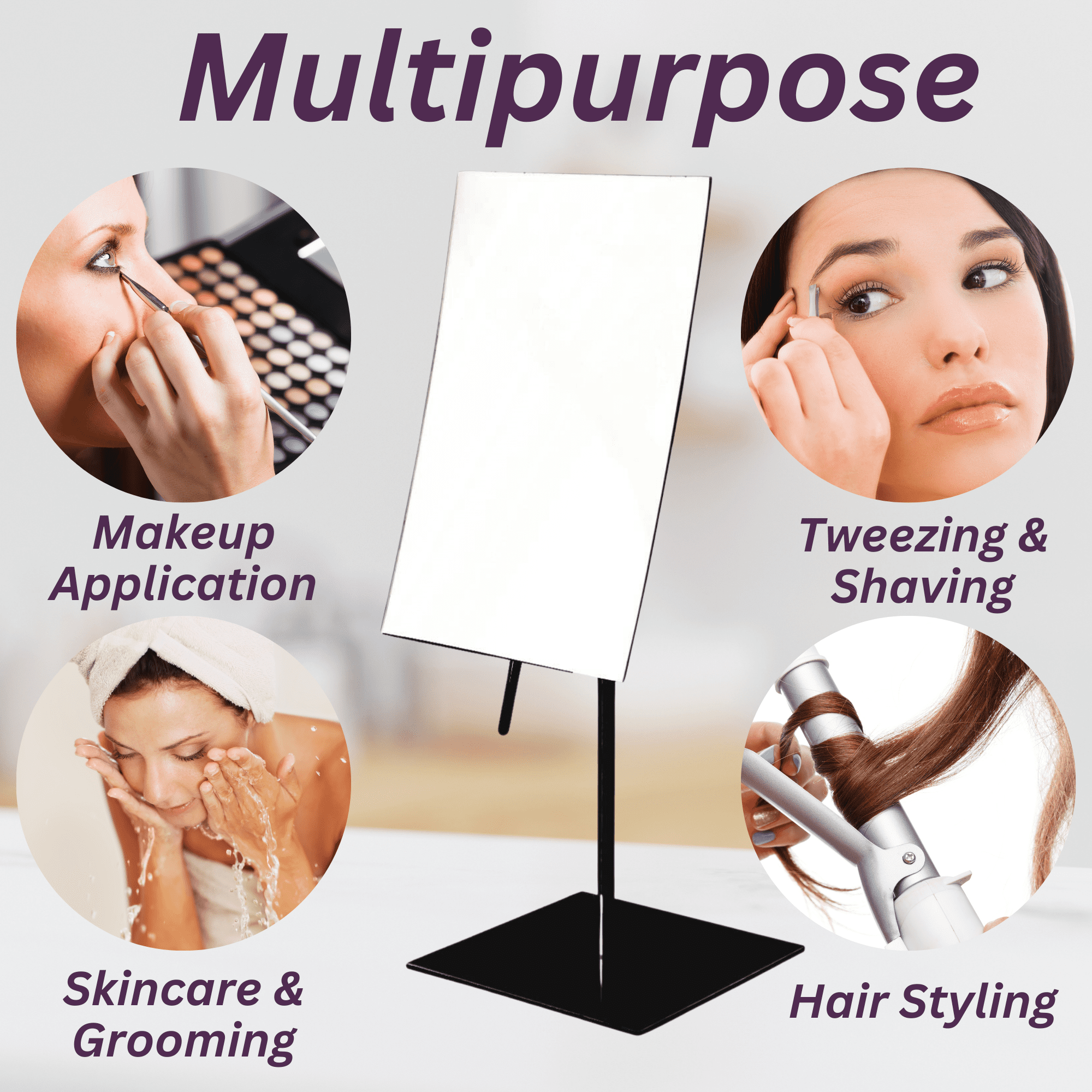 TABLETOP VANITY MIRROR – This sleek, rectangular mirror looks stunning on any vanity or bathroom counter. The modern, black base matches a variety of home styles and aesthetics. This tabletop mirror is great for getting ready, especially for styling hair and applying makeup. The magnification offers a close-up view, allowing you to see every detail and perfect your look! LUXURY DESIGN – Update your bathroom vanity with this ultra-modern makeup mirror. The simple, black base paired with the frameless mirror creates a contemporary look that is sure to impress. This elegant mirror is used in luxury hotel rooms across the world. ADJUSTABLE MIRROR – Easily adjust this mirror to see more angles. This Jerdon personal mirror tilts, allowing you to view multiple vantage points. Perfect for tweezing, grooming, and shaving, this mirror helps you see every angle. MAGNIFICATION OPTIONS – This Jerdon makeup mirror has a 3X magnification. The 3X magnification makes tweezing and grooming easier while still providing a perfect view for makeup application. SPECIFICATIONS – This simple, elegant personal mirror is perfect for any bathroom. This 5-inch by 8-inch mirror is great for shaving, grooming, makeup application and more! The tabletop mirror stands 13.75 inches high and has a lightweight base for easy mobility. Protected under a 1-year warranty