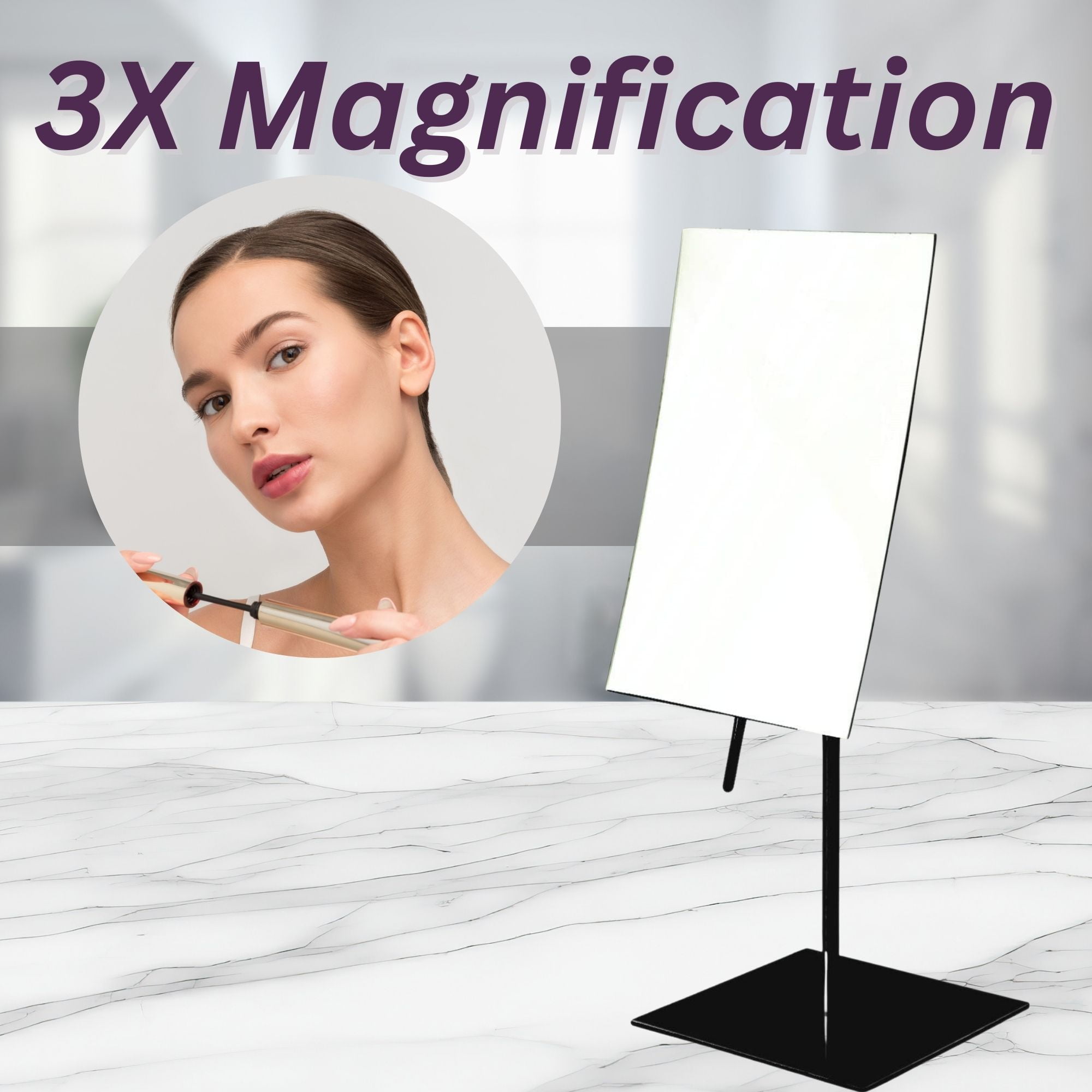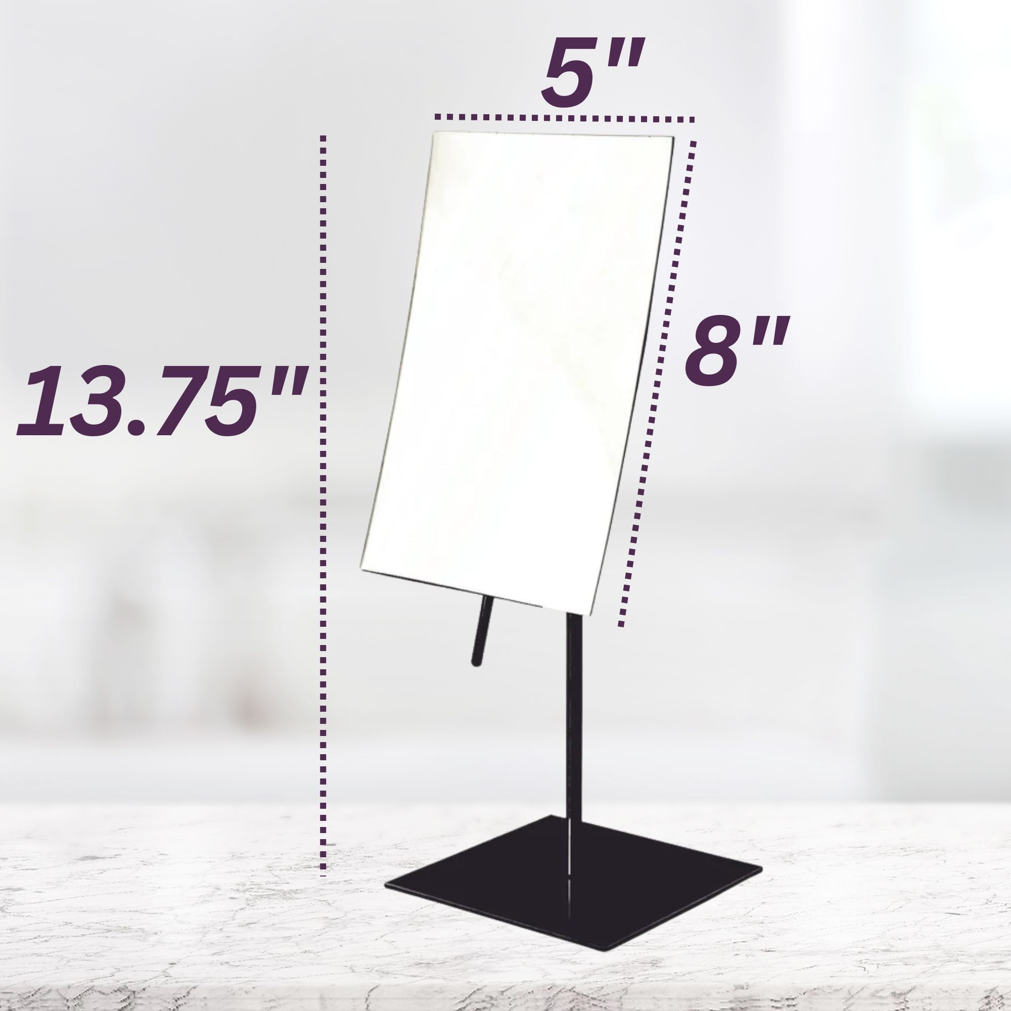 The Jerdon JP358BK 5-inch by 8-inch Tabletop Rectangular Adjustable Mirror is an ideal bathroom and makeup accessory. With various angle options and a 3X magnification, makeup application and grooming are simple and catered specifically to your needs. This stainless-steel, chrome-finished tabletop mirror stands upright on countertops, vanities, desks, and tables. This rectangular mirror is 5-inches by 8-inches in size with 3x magnification and frameless design for a modern look. This sleek mirror has an attractive black finish that protects against moisture and condensation. The JP358BK stands 13.75-inches high and has a body that can easily be moved around, while still firmly holding a specific position.