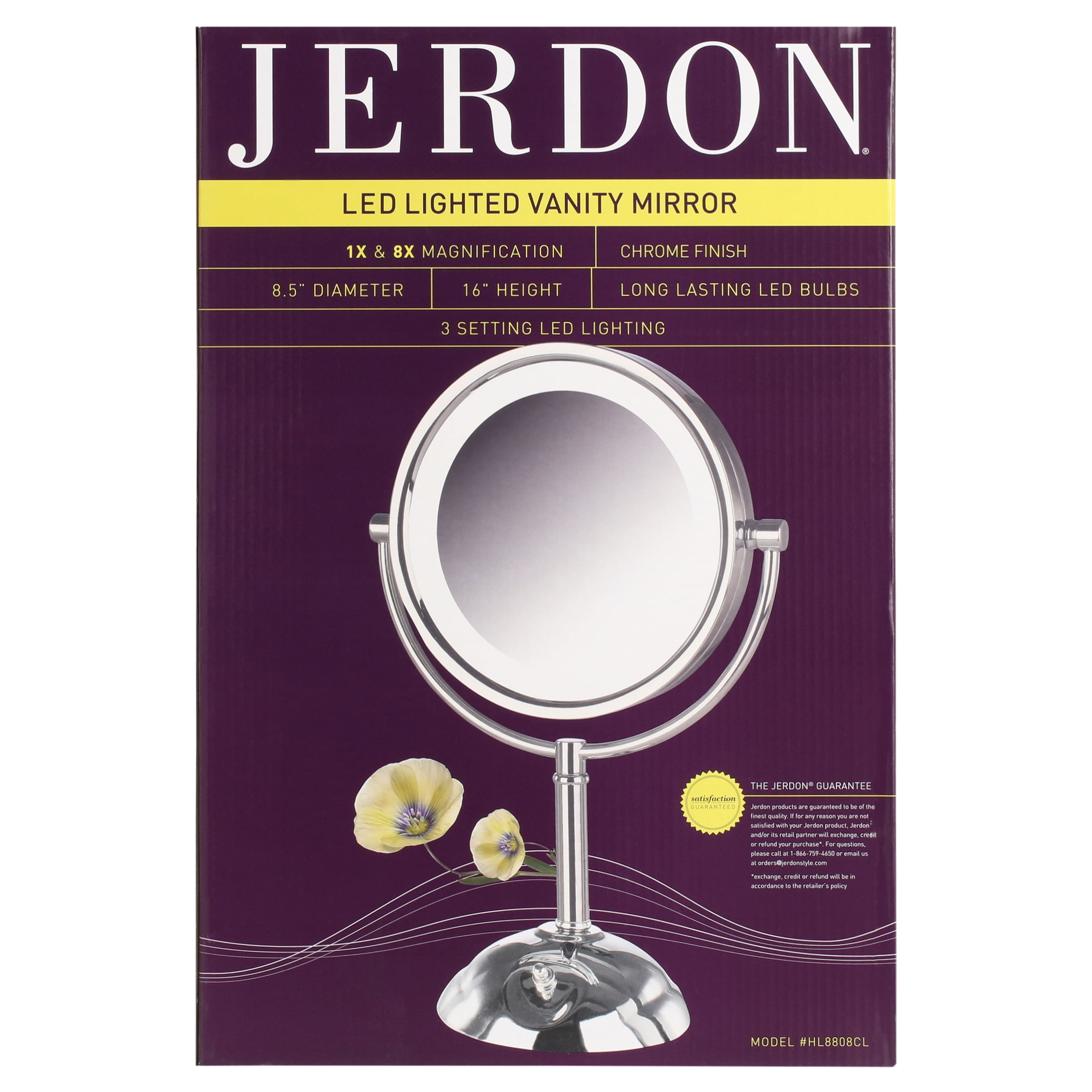 JERDON 8.5″ Diameter LED Lighted Tabletop Makeup Mirror – 1X and 8X Magnification – Chrome Finish – Plug In – Model HL8808CL