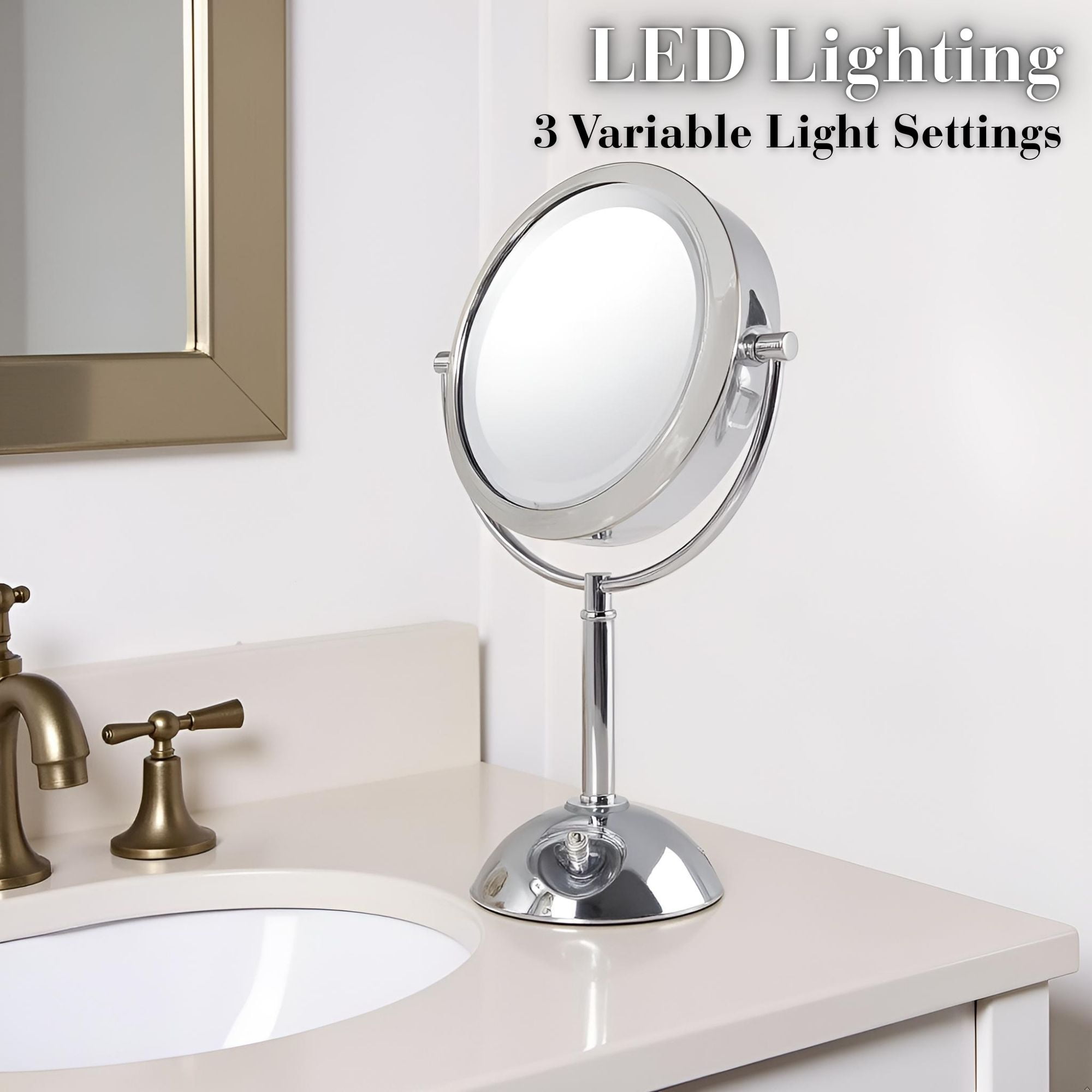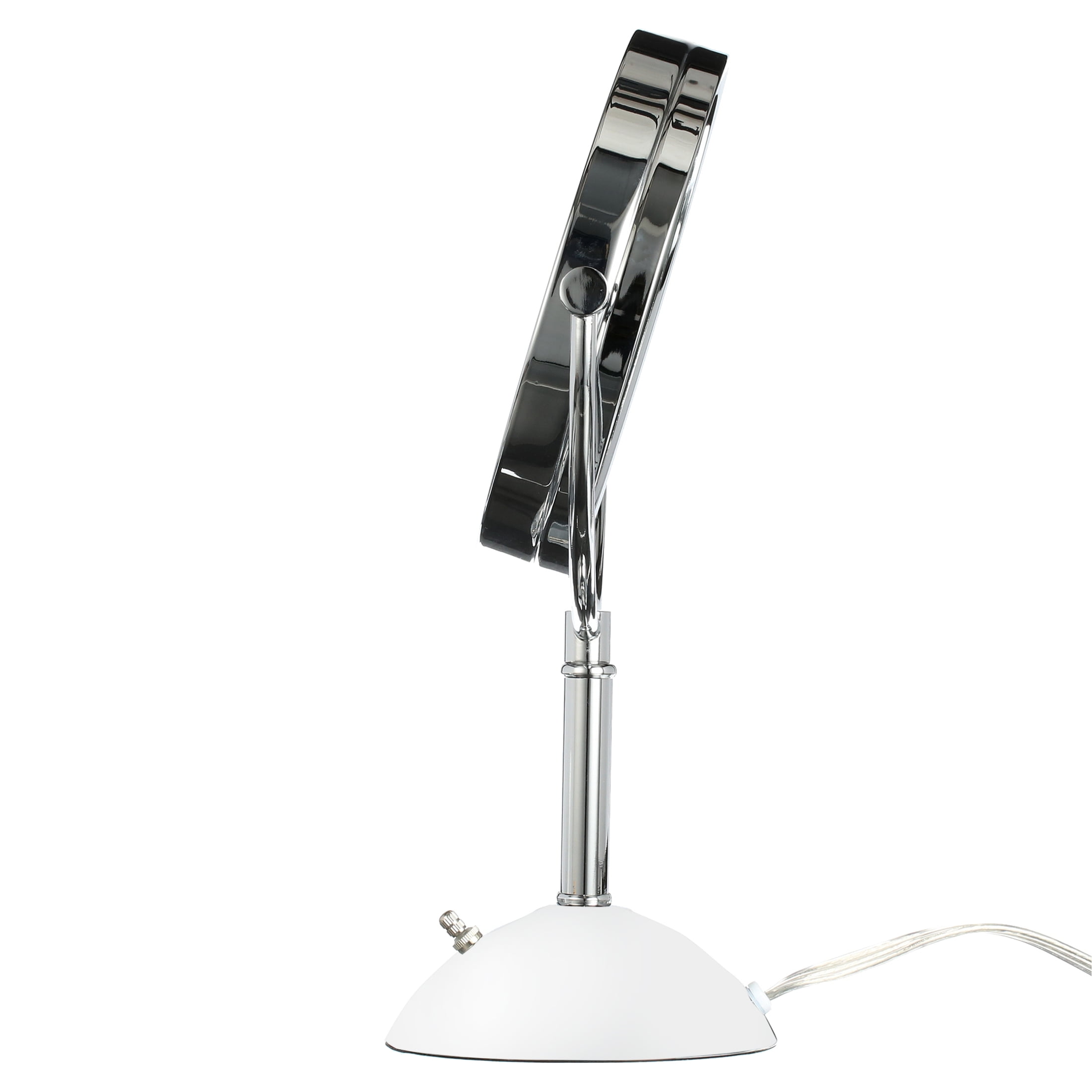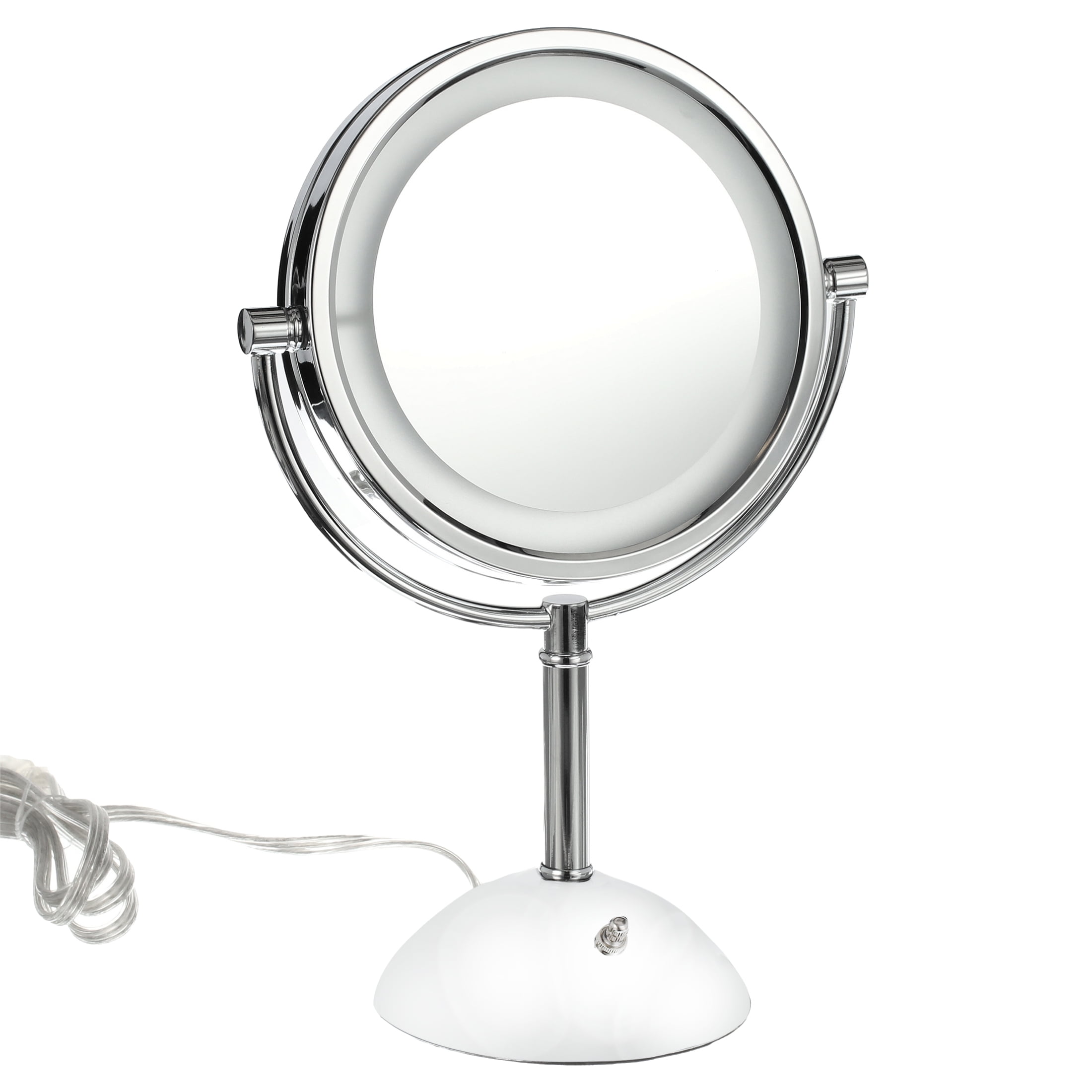 The Jerdon HL8808 8.5″Tabletop Two-Side Swivel LED Lighted Vanity Mirror is an ideal bathroom and makeup accessory that provides lighting and magnification options to display a clean, bright reflection whenever you need it. This two-sided circular mirror has an 8.5 inch diameter and features a smooth swivel design that provides 8X and 1X magnification options to make sure every detail of your hair and makeup are in place. The halo light design around the perimeter of the mirror and smooth rotation provide a dynamic point of view with (3) LED light settings to make sure the lighting is right. An on/off rotary switch on the base will activate the lighting whenever you need it. This mirror stands 16-inches high, stands upright on countertops, vanities and tables and has an attractive finish that protects against moisture and condensation.