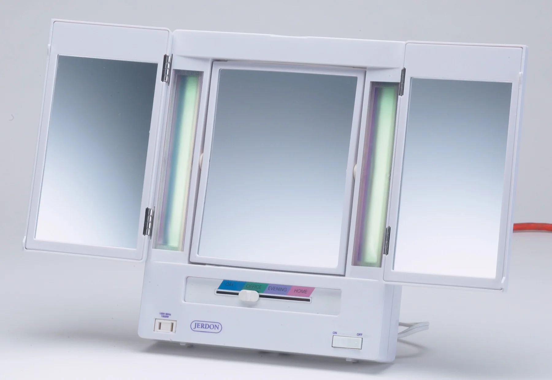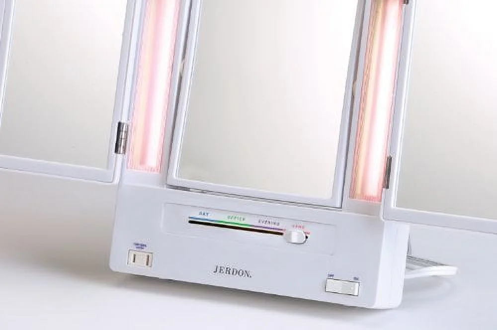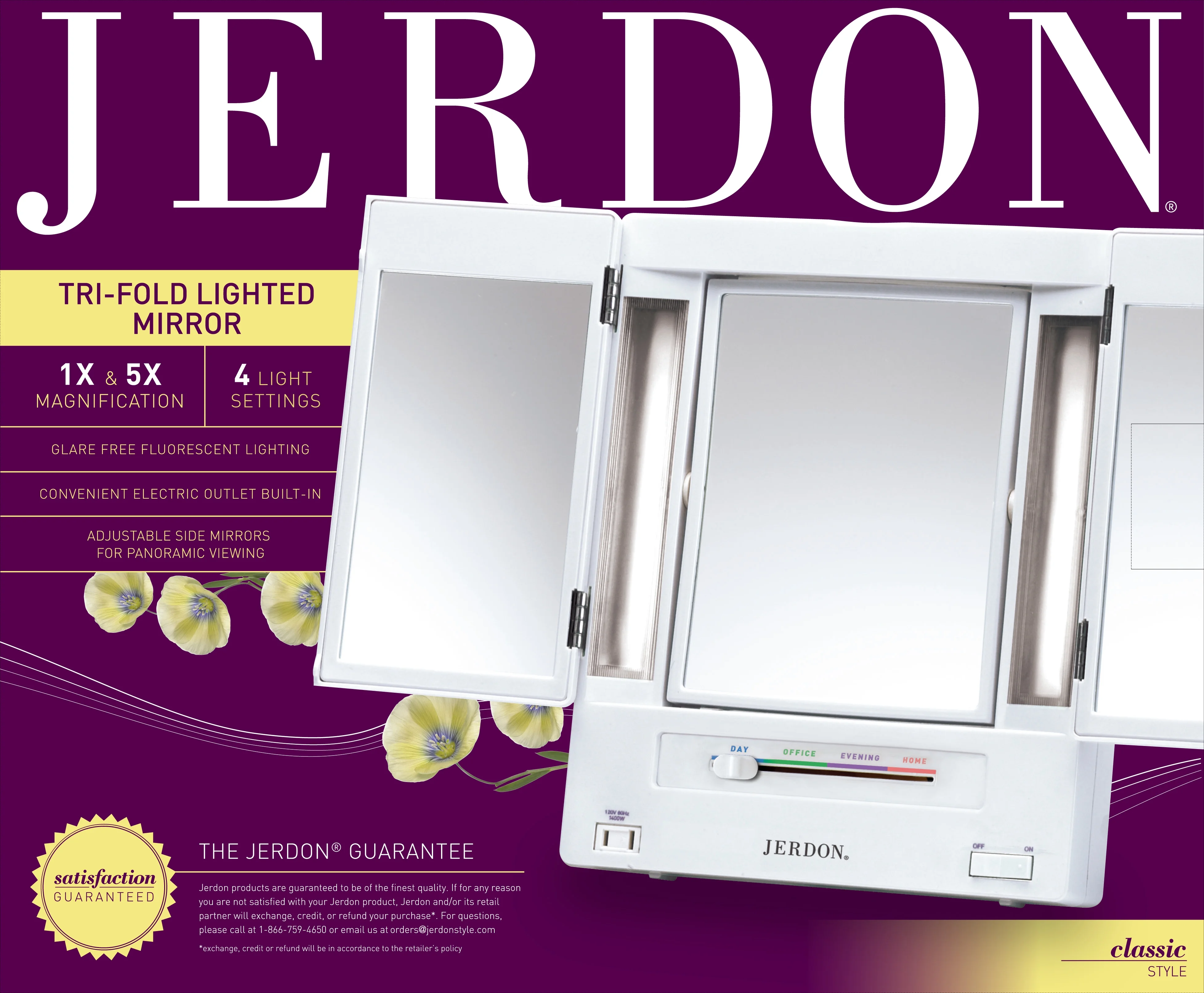 MULTIPLE LIGHT SETTINGS – Applying makeup is easier to do when you know how it will look in specific lighting. This vanity mirror has 4 light settings, including day, evening, office, and home. Whether you prefer soft, warm lighting or glare-free fluorescent, this light-up mirror has the right option for you. These settings help you customize your look based on where you’ll be going and make it easier to achieve the perfect look! COMPACT AND CONVENIENT – This trifold mirror can be placed on any desk, vanity, or countertop. The mirror’s adjustable back stand offers 11 angles, making grooming and makeup application a breeze! The compact base allows you to fold the mirrors in when not in use to save space. It also includes a built-in electrical outlet for further convenience. CLASSIC STYLE – This vanity mirror is a modern take on a timeless classic. The rectangle center mirror is similar to the classic Hollywood-style vanities while the outer mirrors provide additional angles and visibility. The white base is modern and versatile, matching any home decor or aesthetic. MAGNIFICATION OPTIONS – This Jerdon makeup mirror has 2 magnification levels, 1X and 5X. The 5X makes tweezing and grooming easier while the 1X is perfect for basic skincare and makeup application. SPECIFICATIONS – This vanity mirror includes 3 mirrors with 1X and 5X magnification. The tabletop mirror has a modern white base and 4 light settings. The mirror also has a built-in electrical outlet that allows you to plug in hair curling irons and straighteners. The mirror is protected under a 1-year warranty.