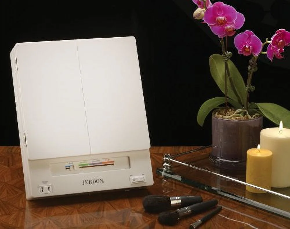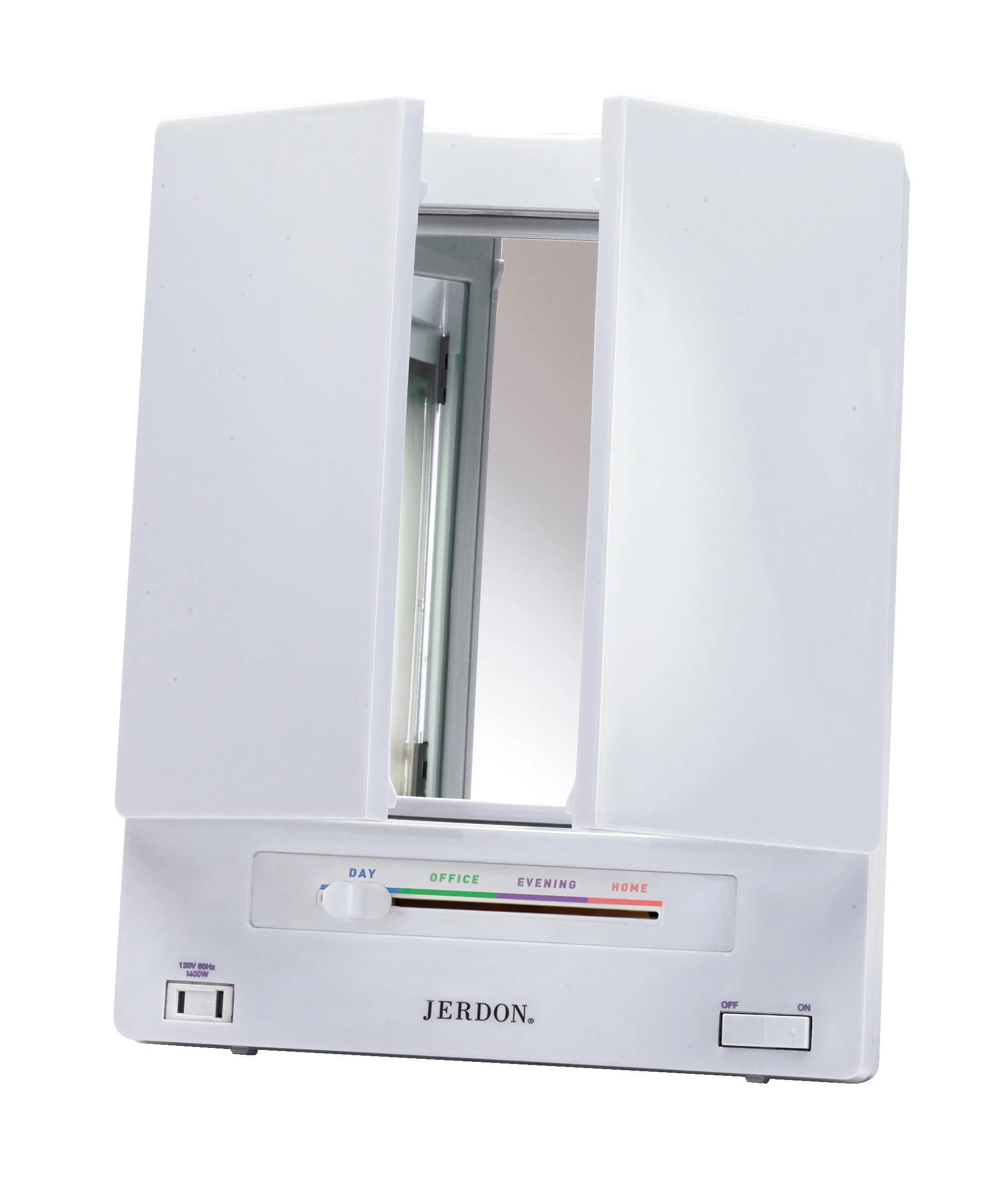 The Jerdon JGL9W makeup mirror has everything you need to perfect your look. The 5X magnification allows you to pluck and tweeze hairs with ease. The 1X magnification is great for hair styling, shaving, makeup application, and more! The fluorescent lights have 4 unique settings, including day, evening, office, and home. The white trifold frame is modern and sleek and looks great in any bathroom. Jerdon mirrors are used in hotel rooms and spas around the world. Add a touch of luxury to your daily routine with this multipurpose personal mirror.