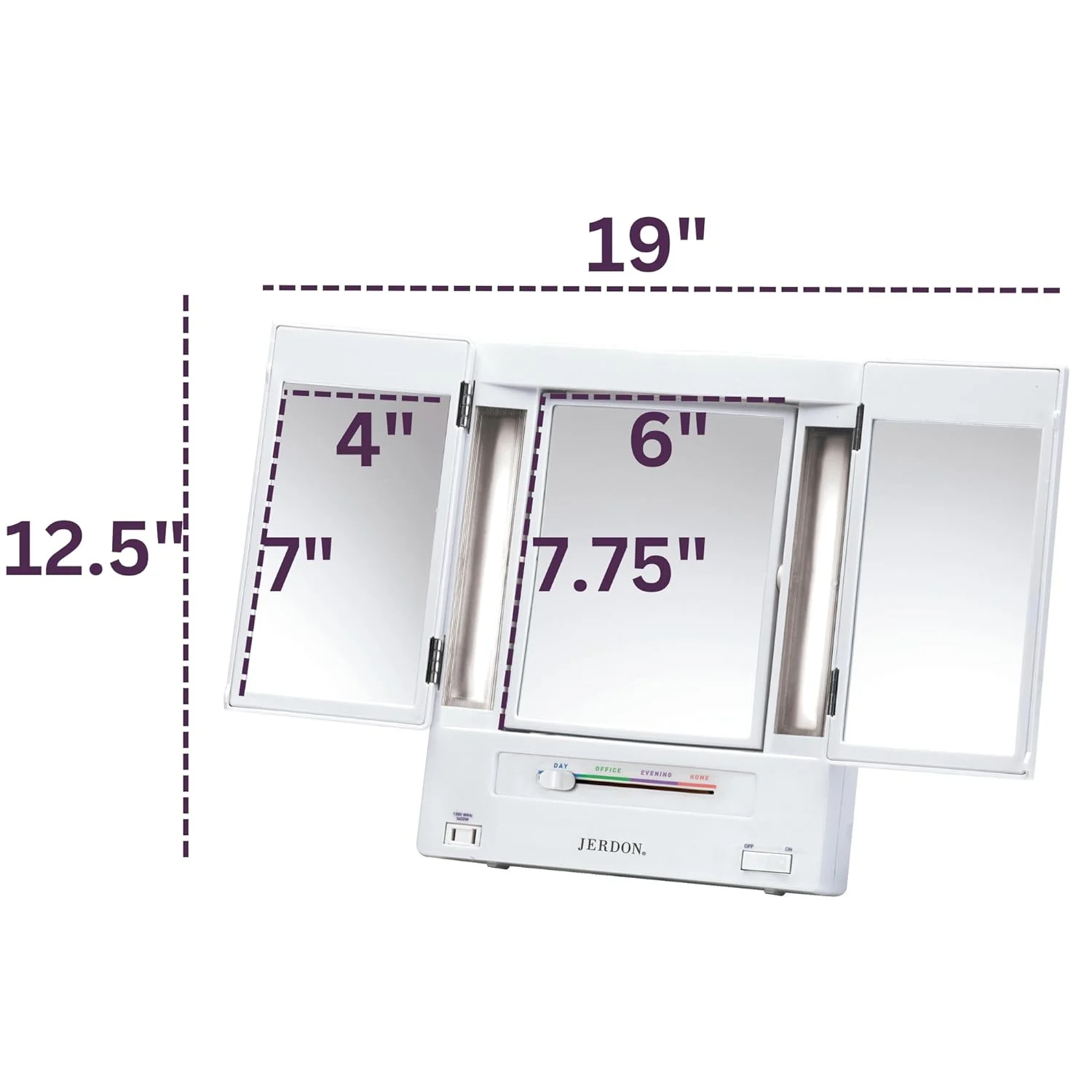 Jerdon Tri-Fold Makeup Mirror with Variable Light Settings, 5X- 1X Magnification, White-Model JGL9W