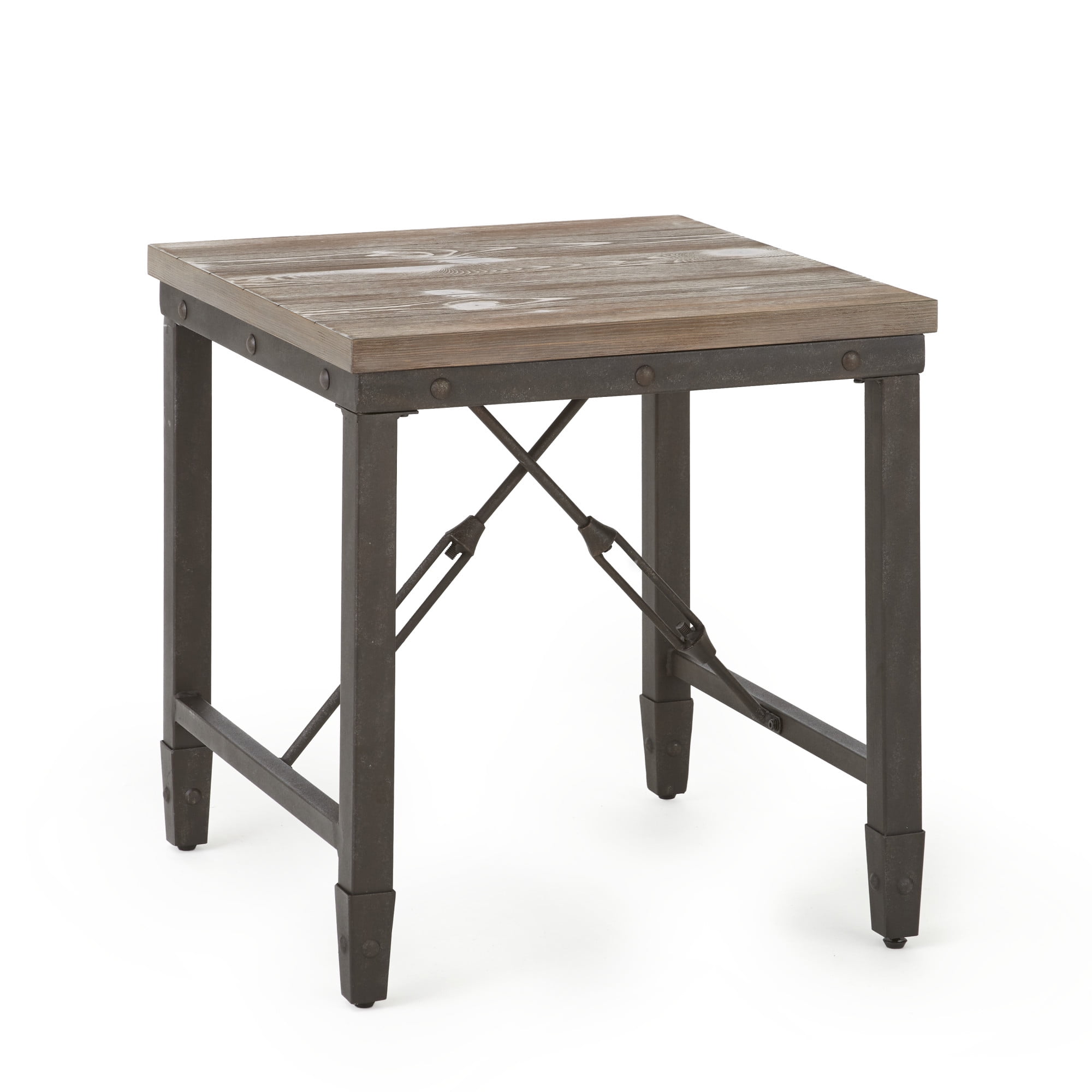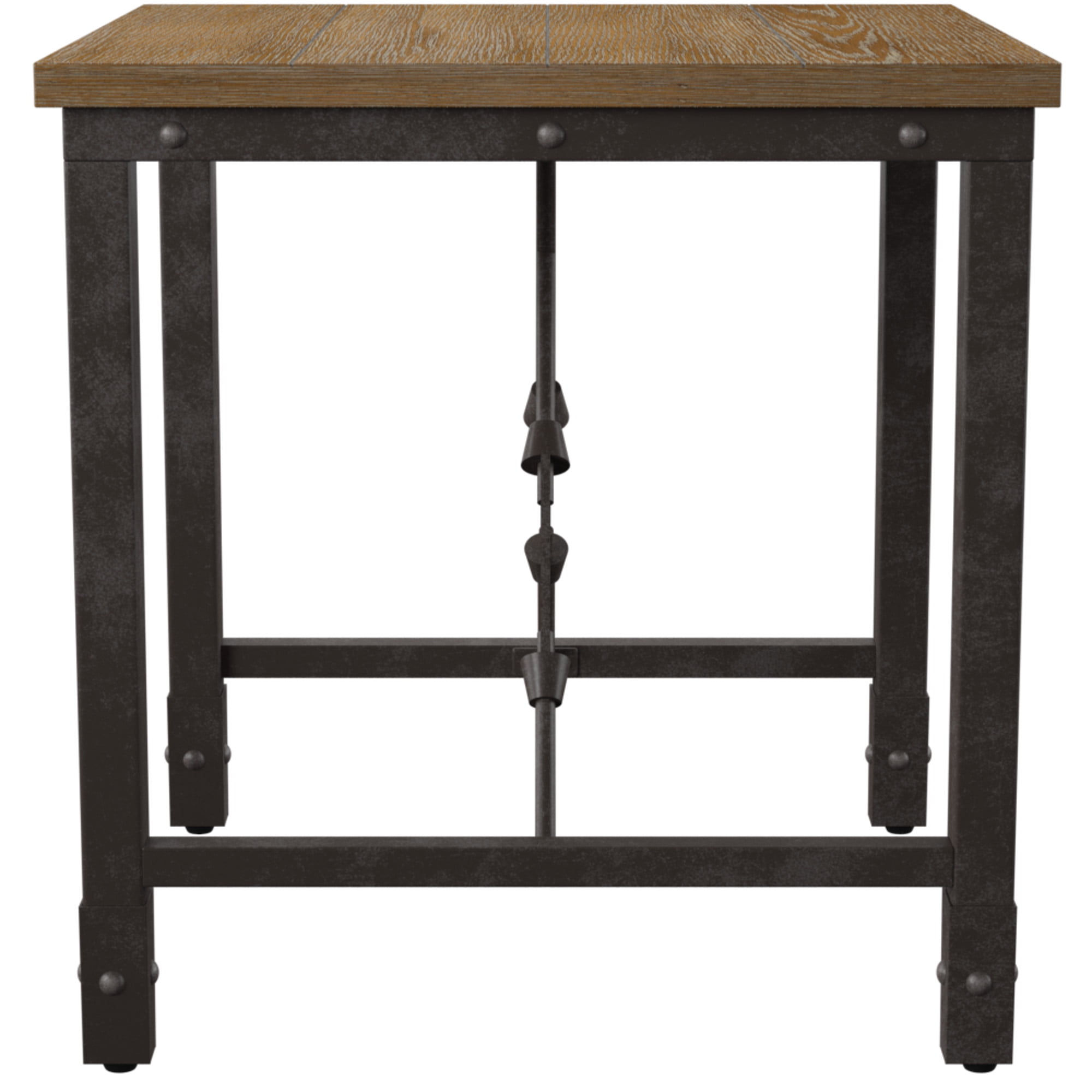 Take industrial design to a new level with the Jersey End Table. The simulated plank top, riveted iron sides and industrial designed stretchers are combined for that restoration look without being bulky. Sturdily constructed using engineered hardwoods and pine veneers in a warm, antiqued tobacco finish. Also available in this collection (purchased separately) are the matching cocktail table, sofa table and chairside end table. Features: Finish: Antique Tobacco Brown Top Material: Engineered Hardwoods and Pine Veneers Simulated plank top Riveted iron sides Industrial styled stretchers Specifications: Product Dimensions: 24″ H x 23″ W x 23″ D Product Weight: 28 lbs