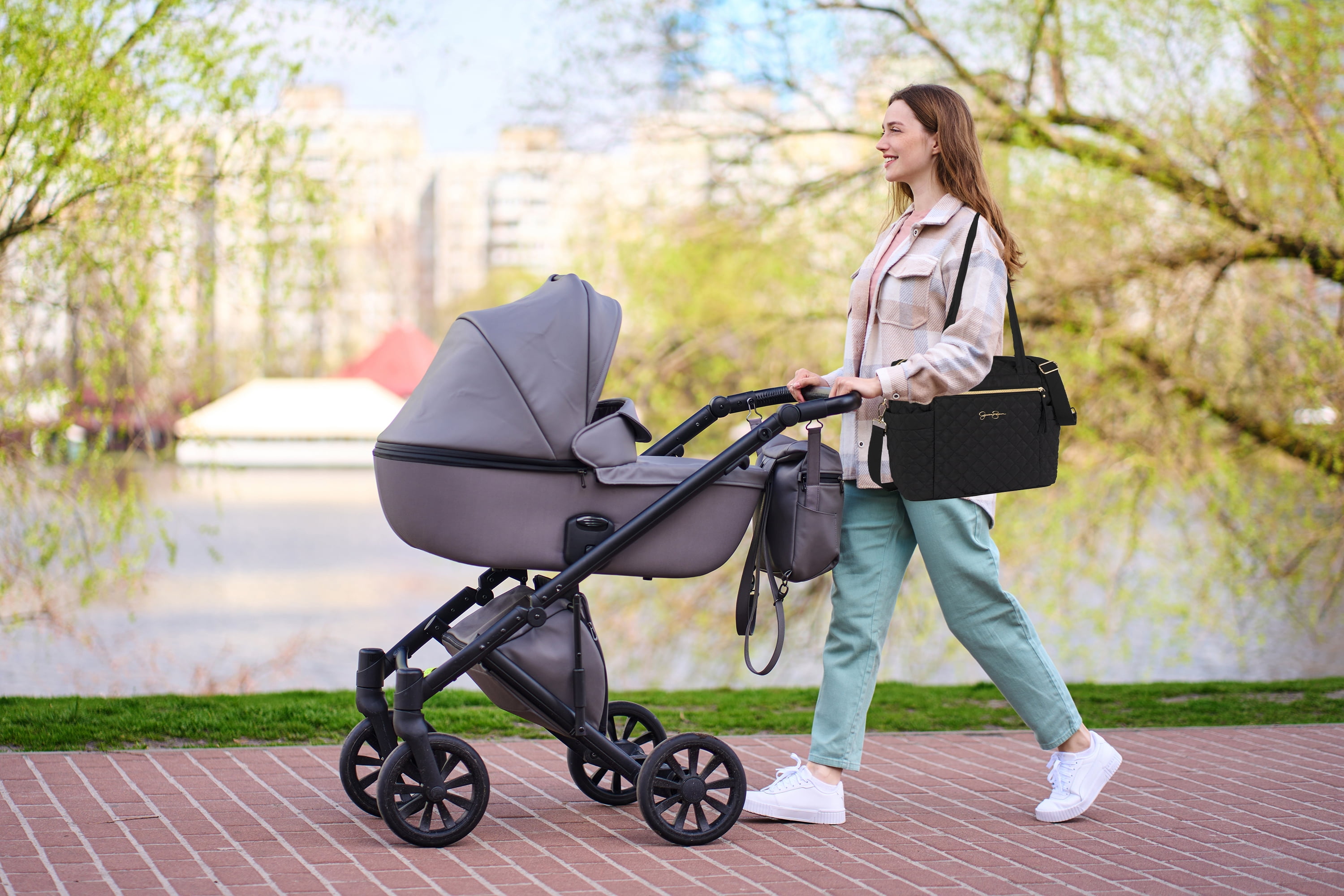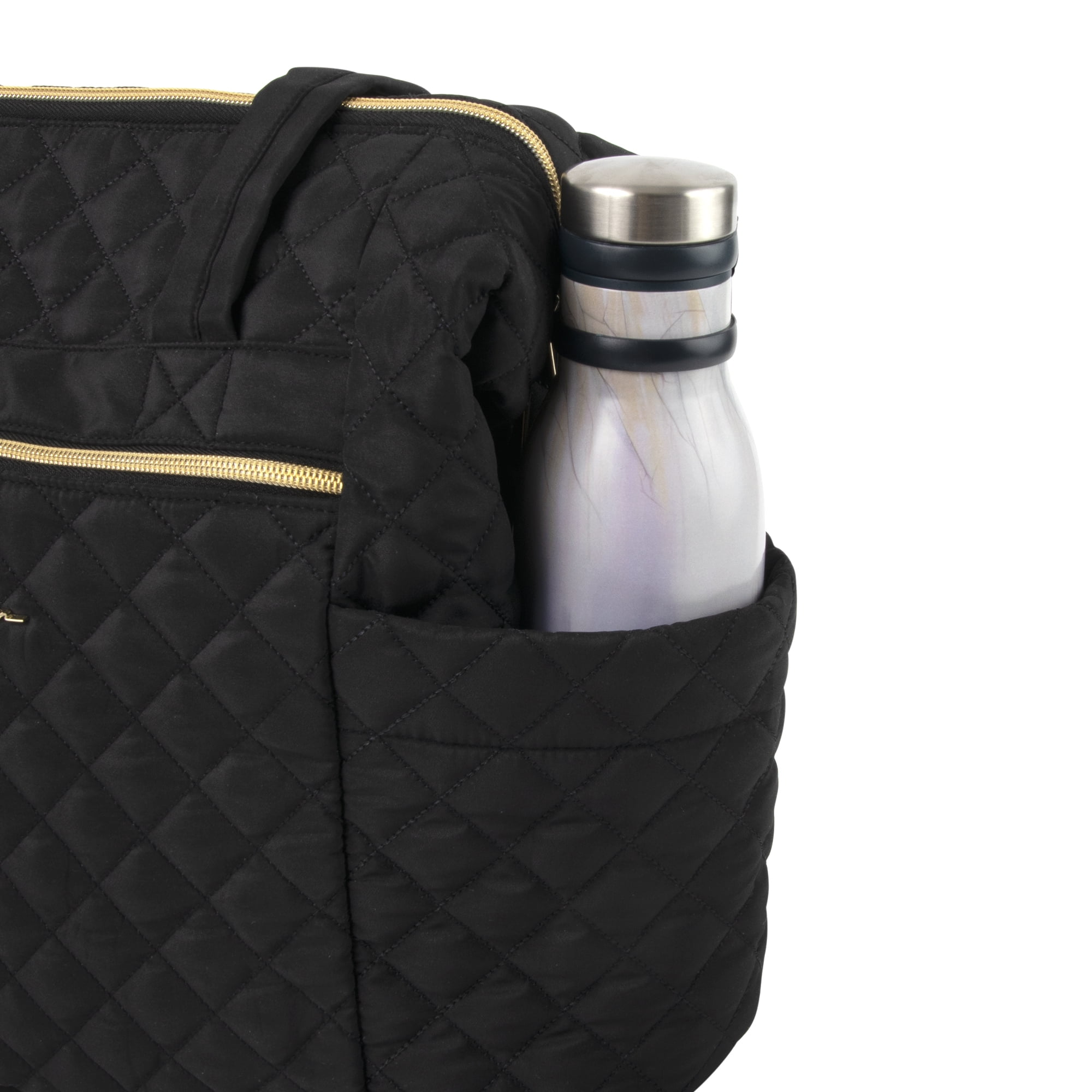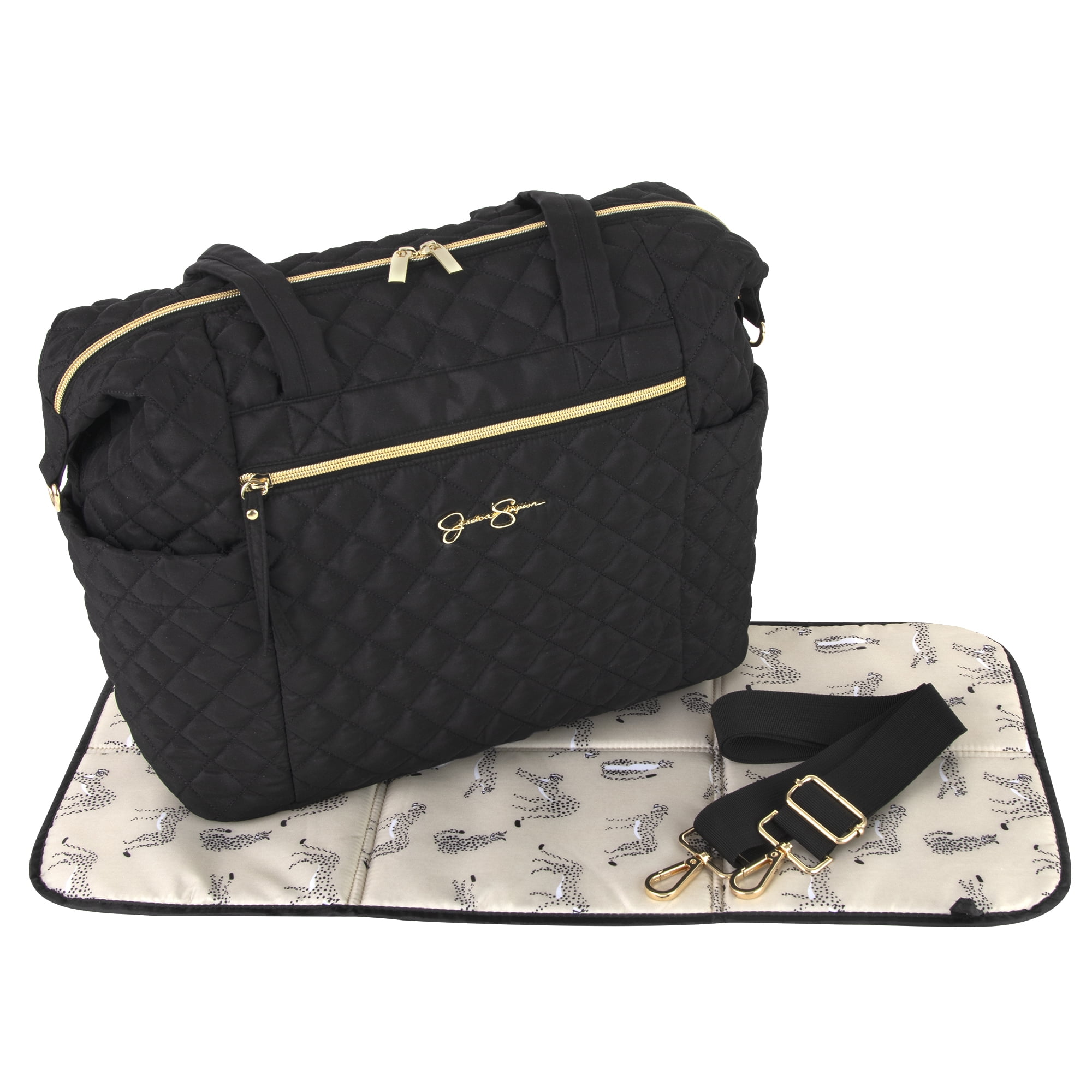 Jessica Simpson Large Black Diamond Stylish Quilted Multi-Pocket Dual Zipper Closure Fashion Diaper Bag Travel Tote Satchel with Luggage Strap, Running Cheetah Print Interior & Changing Pad