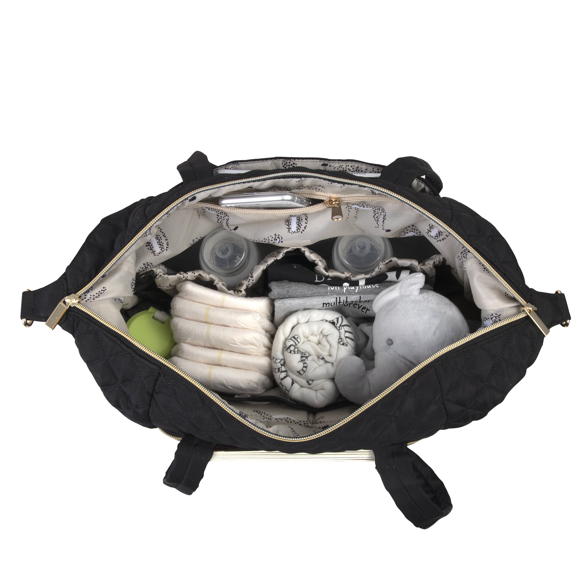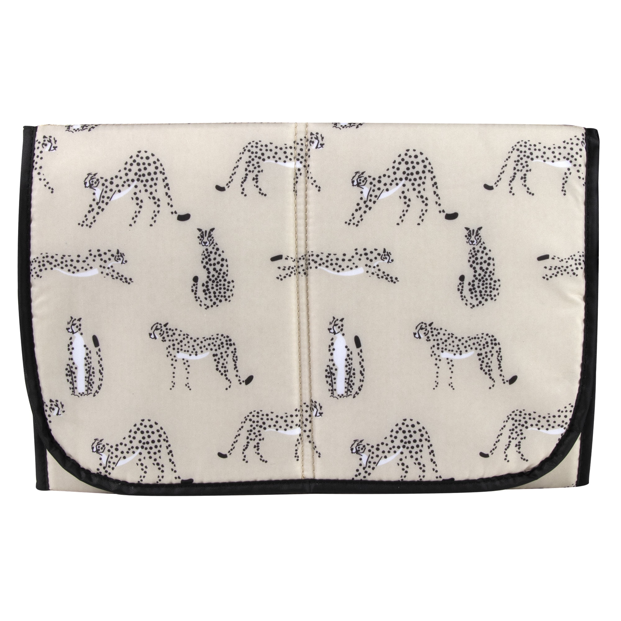EXTERIOR RUNNING CHEETAH PRINT LINED FRONT ZIPPER POCKET: Let’s start with Mom and her some of her most immediate necessities on the go! Pack your phone, house keys, car keys and wallet safely and securely for quick and easy access with this deep front zipper pocket, lined with luxurious running cheetah print fabric. 2 DEEP FOIL LINED TEMPERATURE CONTROLLED INTERIOR POCKETS FOR BABY FEEDING BOTTLES: With the capacity of fitting up to 2-3 baby feeding bottles in each pocket for a total of 4-6 bottles, keeping bottle materials such as glass, plastic, silicone and stainless steel chilled or warmed, this multi-pocket diaper bag backpack contains (2) deep, foil lined interior pockets for keeping your baby’s formula, milk, juice, or water temperature controlled throughout your trips, travels and commute. REMOVABLE 3-PLY WIPE CLEAN FOLDING CHANGING PAD: Protect your baby from any germs or bacteria that may be living within restrooms or on baby changing tables on the go with this removable, 3-ply wipe clean folding changing pad in a fun, stylish, running cheetah print to match the interior of the bag! Lightweight, easy to fold and manage, use this convenient changer to also protect fabric surfaces such as the bed or couch and even hard surfaces too, but even more importantly, your baby. Just remember to wipe down and sanitize before and/or after each use. 15.5 INCH LONG TOTE HANDLE SHOULDER STRAPS WITH 49 INCH MAX LENGTH REMOVABLE LUGAGGE STRAP: We’ve added a few alternative ways to carry this diaper bag tote satchel by including a pair of 15.5 inch long tote handle straps, so you can easily grab and go with this bag by hand, on your forearm, or even by the tote handles on your shoulder. We’ve also included a removable luggage strap that allows this tote to be worn on the shoulder (again) or as a cross body with the strap measuring 25.5 inches at its shortest and 49 inches at its maximum length. COLLAPSIBLE CORNER SNAP EDGES FOR EXTENDING AND MINIMIZING STORAGE CAPAPCITY: Want to extend the amount of space you have within the bag or maybe minimize to help size down? This tote satchel comes with collapsible corners on the exterior of the bag that fold downward and snap, allowing you to shrink or extend your bags interior holding capacity and outer appearance. DIMENSIONS: This Diaper Bag Tote Satchel with Running Cheetah Print interior measures 15L” x 20″W x 6”H with 15.5”L tote handle shoulder straps and its removable luggage shoulder strap measures 25.5”L at its shortest and 49“L at its maximum length. The removable changing pad measures 24”L x 12”W.