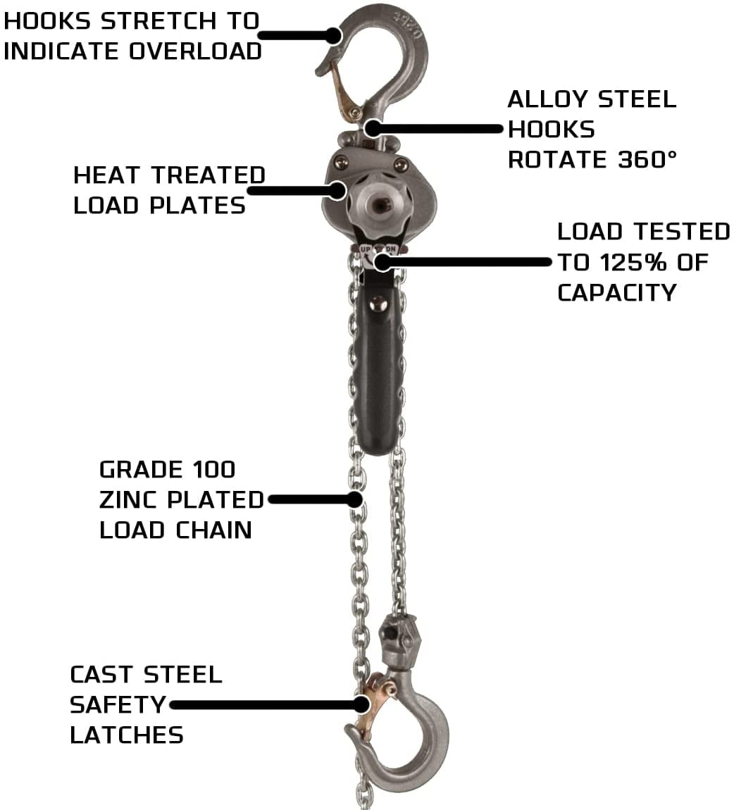 Compact lever hoist with 2 hooks designed for heavy-duty industrial applications with a 0.5-ton load capacity and lift of 10 feet and includes a carry case Durable construction with Grade 100 corrosive-resistant load chain, heat-treated load plates, cast steel safety latches, aluminum housing, and geared drive train Features Weston-style double ratchet pawl brake design that splits the load to opposite sides of the ratchet gear for greater load security and increased safety Industrial-rated alloy steel hooks rotate 360 degrees for easy rigging and slowly stretch to indicate an overload situation Complies with OSHA regulations, ANSI/ASME B30.21 and HST-2 safety standards and load tested to 125-percent of capacity Work to weight ratio allows hoist to pull or hold loads more than 170 times its weight Cast-steel safety latches secured by Allen screws and lock nuts won’t bend out of compliance with lifting regulations Smaller body and lightweight design, ideal for confined areas and low headroom applications Includes nylon carrying case for convenient and safe transportation Specification: Headroom: 9.7 inches Handle length: 6.3 inches Lever pull force: 54 pounds/foot Lift per turn: 0.33 inches Number of falls: 1 Load chain dimensions: 0.17 x 0.47 inches Color: Black Weight: 7 pounds