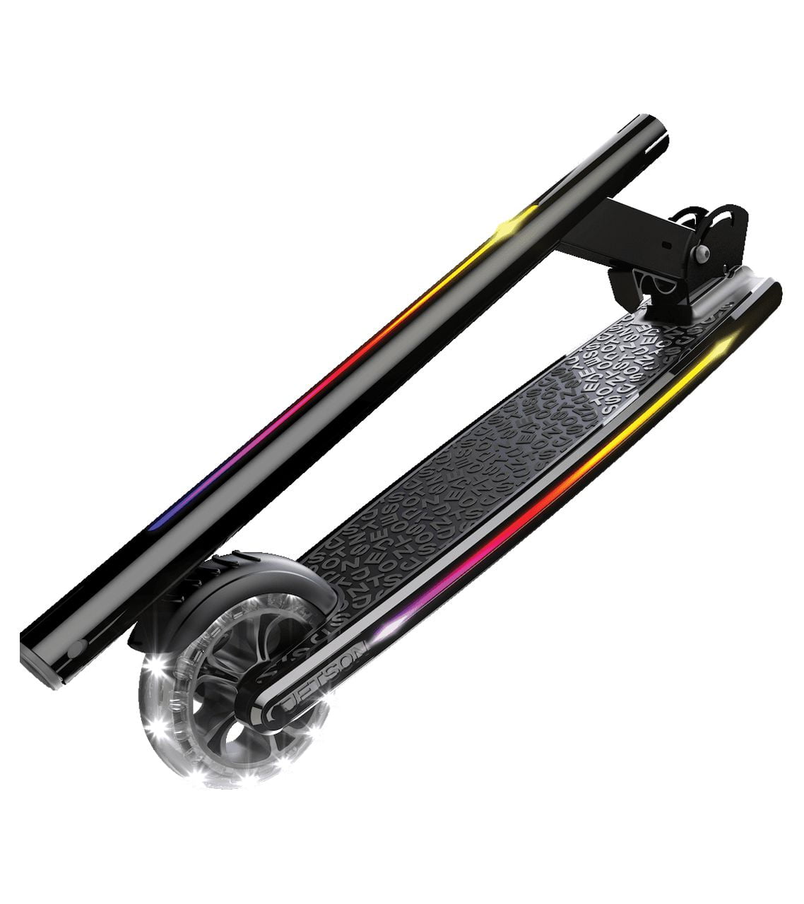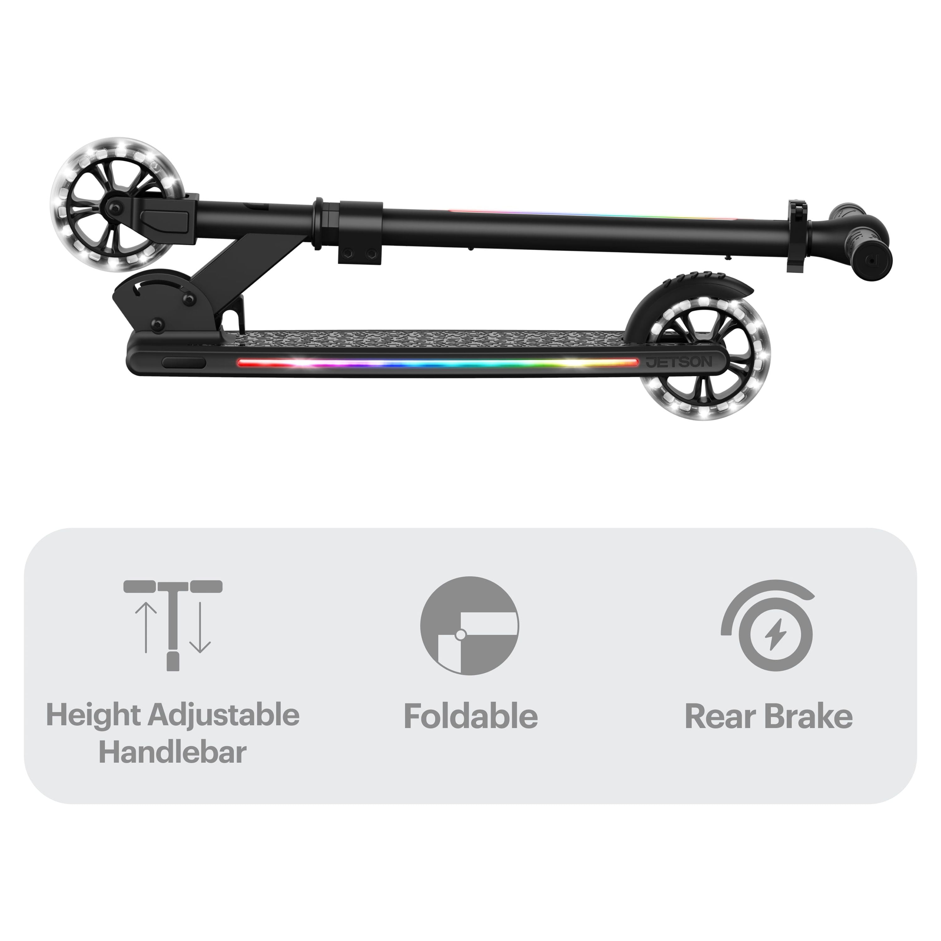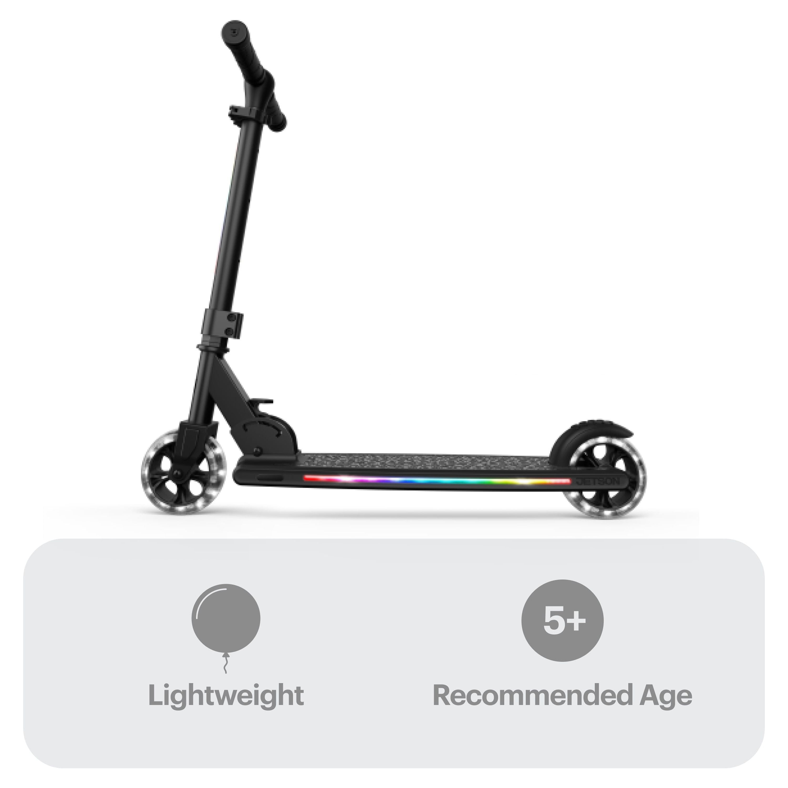 Jetson Mars Folding Kick Scooter • Easy folding mechanism for portability • LED Light-Up Wheels, Deck & Stem • Height Adjustable Handlebar: Scooter grows with you (25.5”-34.5”) • Weight Limit: Up to 150 lb • Wheel Size: 4.66” • Deck Size: 20.5” × 4.4” • Brake Style: Rear foot brake • Product Weight: 7 lb • Recommended Age: 5+