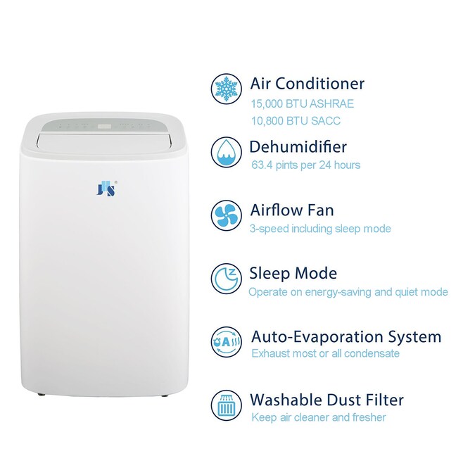 Enhance your home comfort with the JHS 15,000 BTU ASHRAE, 10,800 BTU DOE portable air conditioner. Ideal for rooms up to 550 square feet, this powerful unit is perfect for your home office, bedroom, living room, apartment, or attic. The portable cooling unit’s built-in dehumidification capabilities can remove up to 63 pints of moisture from your home per day, ensuring a clean, fresh, and comfortable environment. Maintaining steady airflow throughout your space is effortless with the 2 fan speeds and automatic swing louver. The sleep function gradually increases the room temperature to keep you cool and comfortable while sleeping. Thanks to its integrated side handles and caster wheels, you can easily transport the unit from room to room wherever you need relief the most. Setting up the portable AC unit is a breeze with the included flexible exhaust hose and complete window venting kit. The 24-hour timer allows you to schedule the unit to run only when needed to conserve energy and reduce costs. Cleaning and maintaining the unit is easy with the easy-accessible washable permanent mesh filter. Simply clean or replace the filter as needed to keep the unit cooling effectively throughout the warmest seasons of the year.