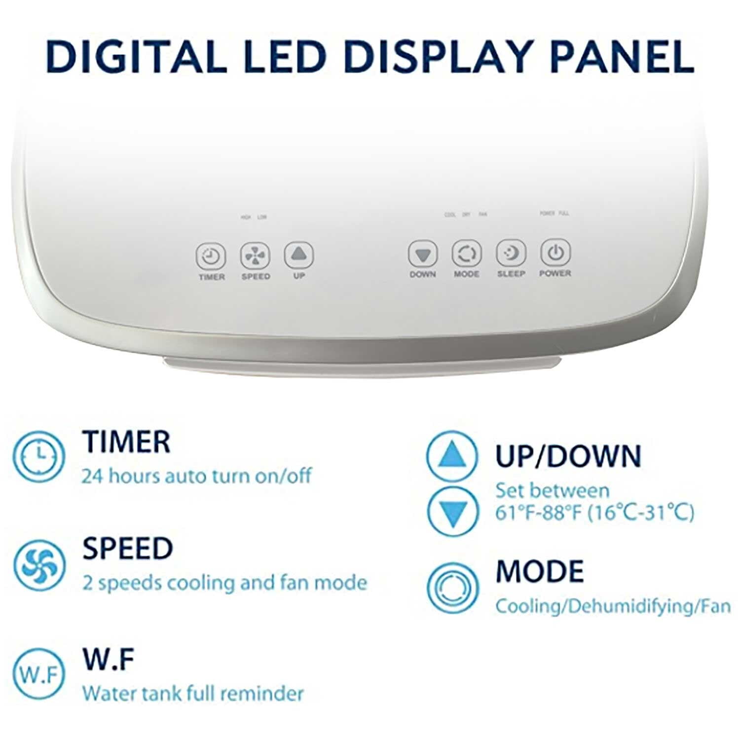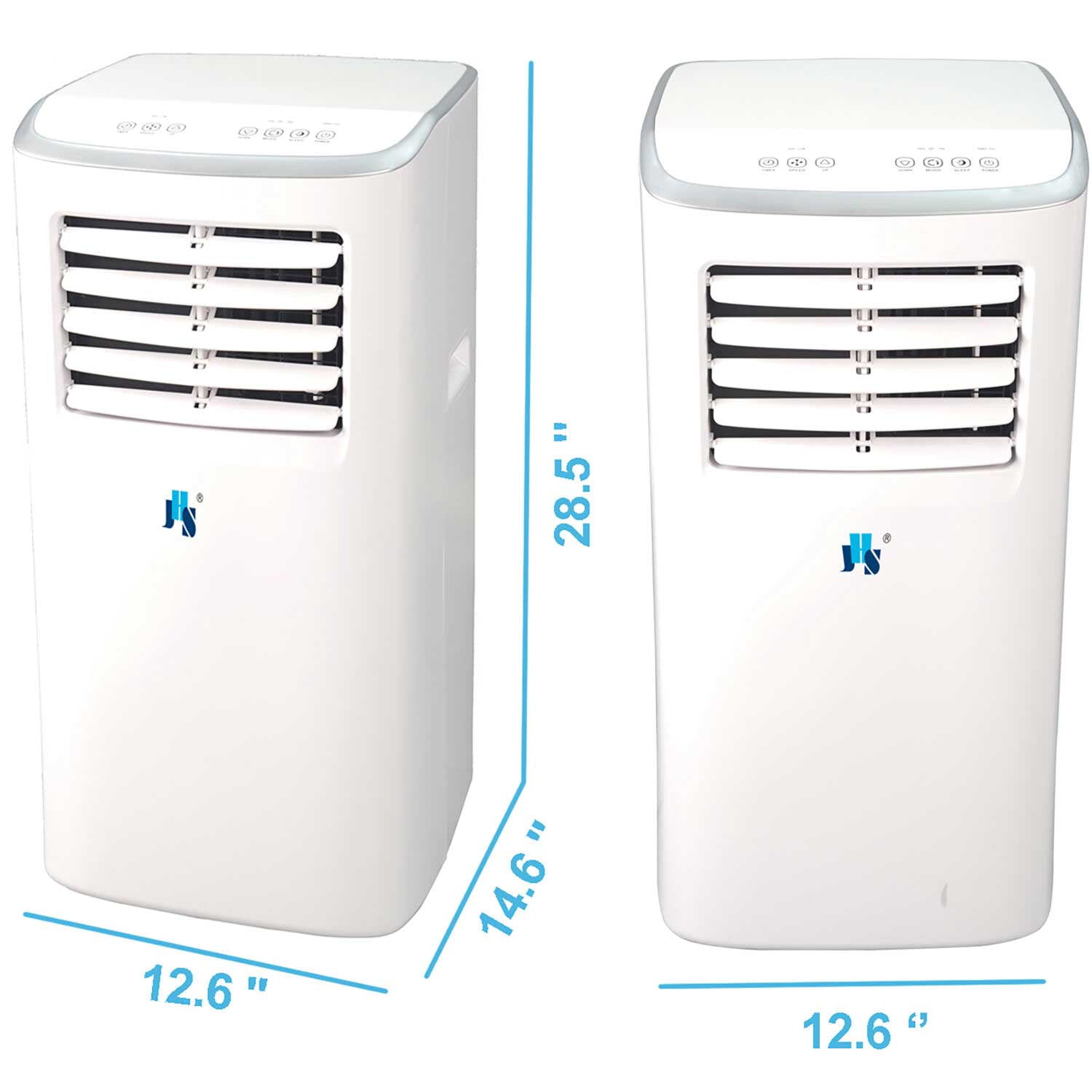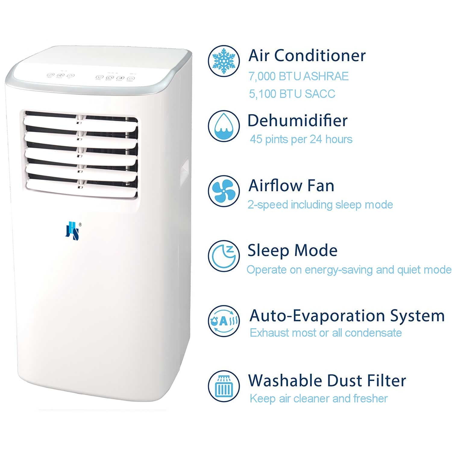 JHS 5,000 BTU (7,000 BTU ASHRAE) Portable Air Conditioner, Rooms up to 250 Sq. ft., A019J-05KR Perfect for home office, bedroom, living room, apartment or attic Electronic controls with LED display, 2 speeds, and programmable 24-hour timer 3 operating modes – cool, fan, and dehumidify Dehumidification up to 45 pints per day Sleep function gradually increases room temperature after being activated Removable air filter for easy cleaning Integrated side handles and caster wheels for easy portability 6-ft. 5-15P power cord with LCDI plug uses standard 115V and 8.0 Amps electrical outlet located on back of unit