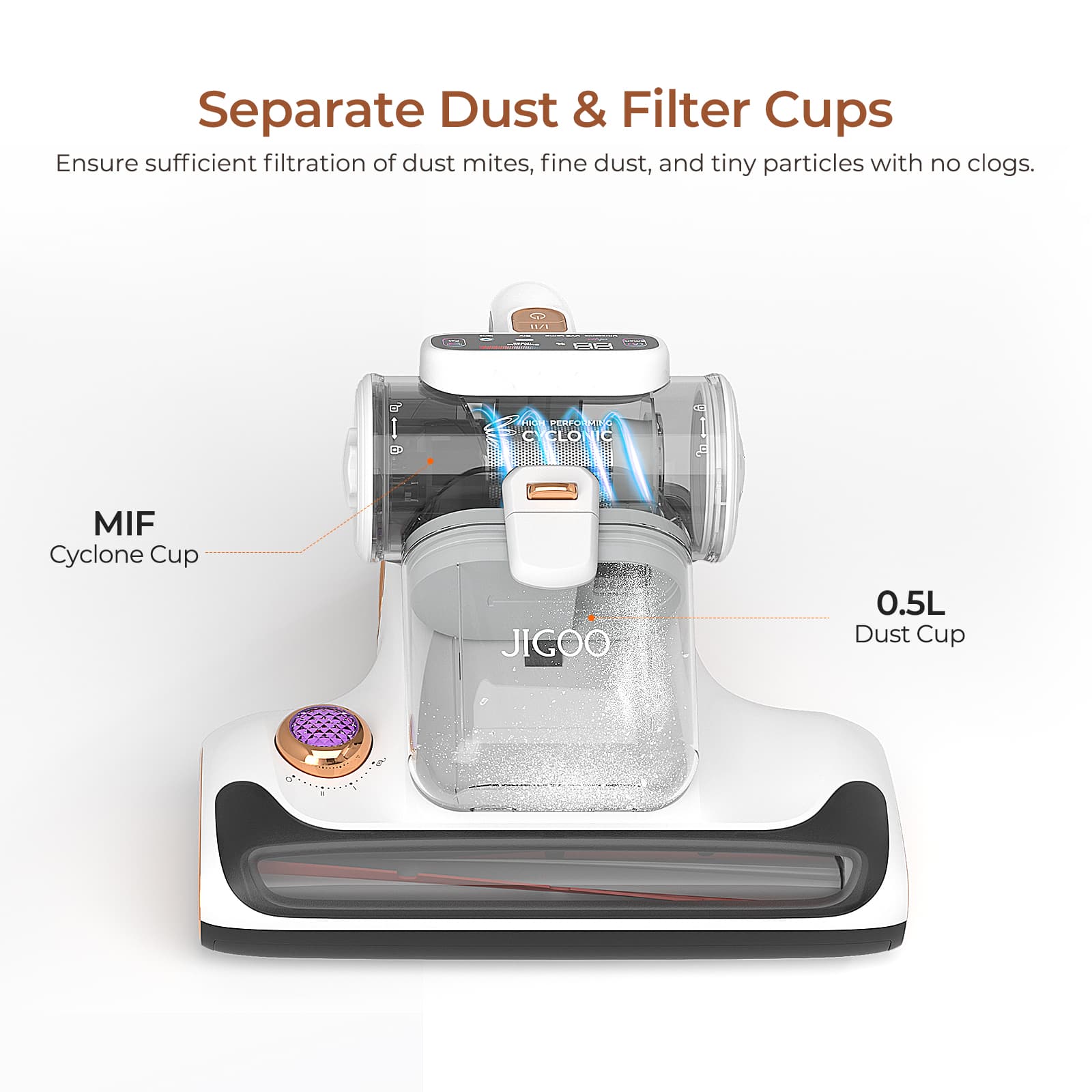 JIGOO T600 Smart Dual-Cup Mite Cleaner, takes dust mite removal to the next level with its dual-cup design and innovative aroma-diffused system. Effectively get rid of dust mites with its 700W power, strong 15kPa suction, and unique metal brush roller. Achieve 72dB low noise level despite its 700W high power, thanks to the sound-absorbing materials. It reaches a constant 60℃ temperature in a mere 5s, eliminating dust mites deep into your bedding.It disrupts the protein structures of bacteria and mites while efficiently removing unpleasant odors. Sufficiently prevent dust mites from breeding through the incorporation of unique aroma and rapid diffusion technology. High-frequency ultrasonic waves can disrupt the dust mite reproductive cycle. Swiftly remove at least 99.99% of dust mites in larger beds. The filter and dust cup are both detachable and washable for the easiest maintenance.