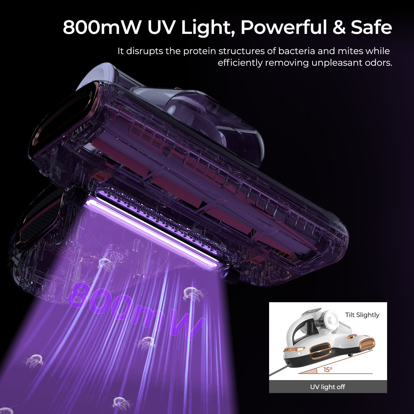 JIGOO Mattress Vacuum Cleaner can remove 99.99% of dust mites from your bedding, thanks to its 700W high power and 15kPa vacuum suction that captures the majority of dust mites on the surface of your bedding. It also features an 800mW ultraviolet lamp and maintains a constant 60℃ temperature to penetrate deep into the fabric.