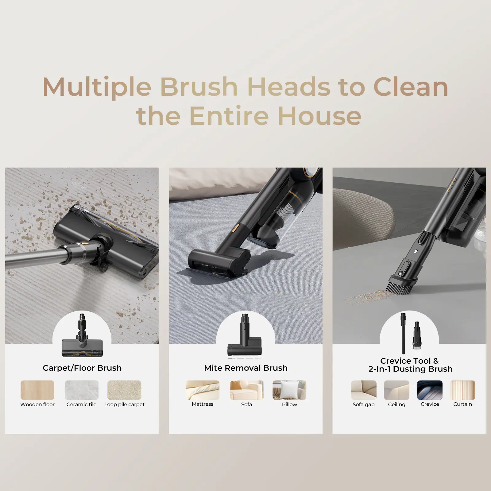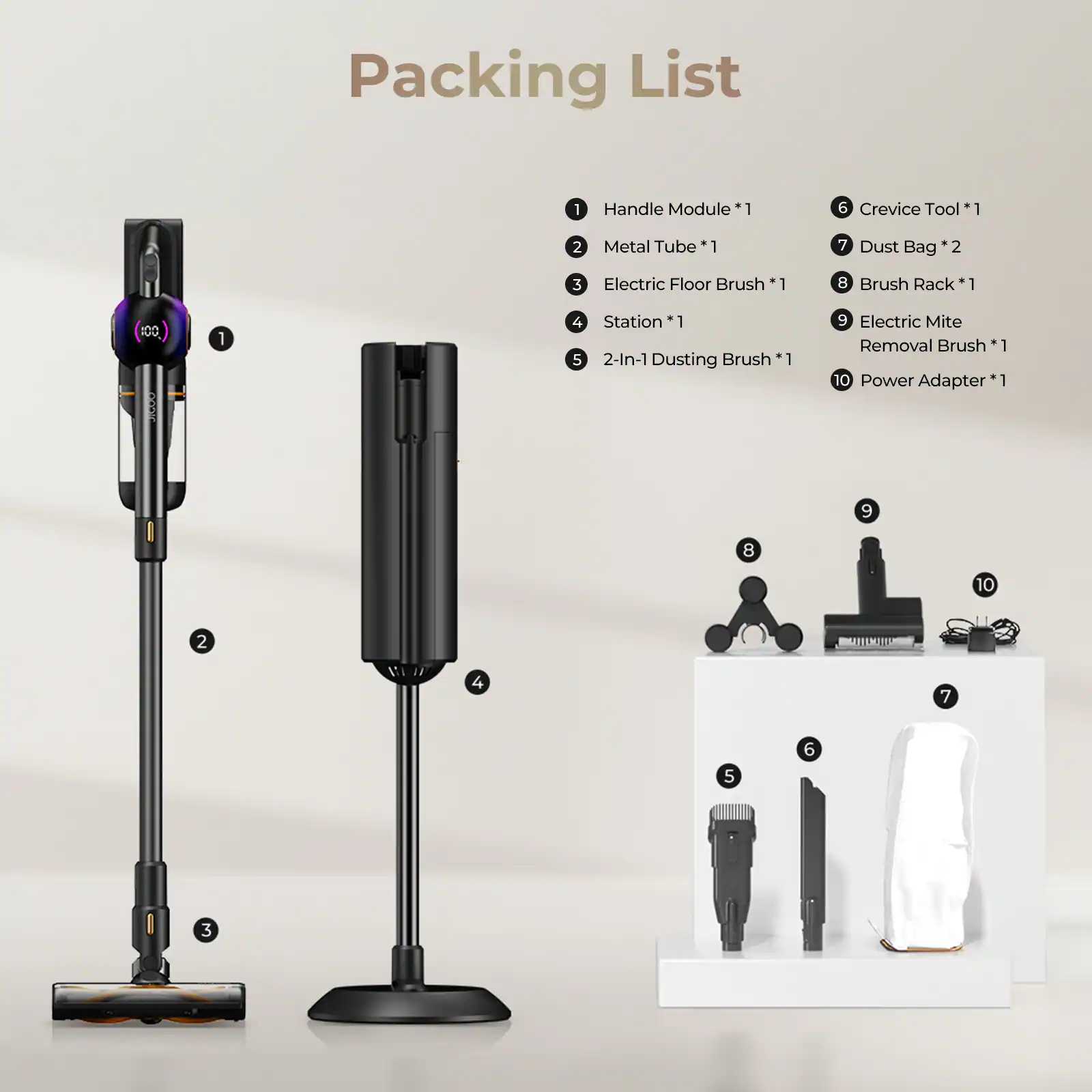 - Attachments Included: Handle Module, Metal Tube, Electric Floor Brush, Electric Mite Removal Brush, 2-In-1 Dusting Brush, Crevice Tool, Brush Rack for Storage, Dust Bag