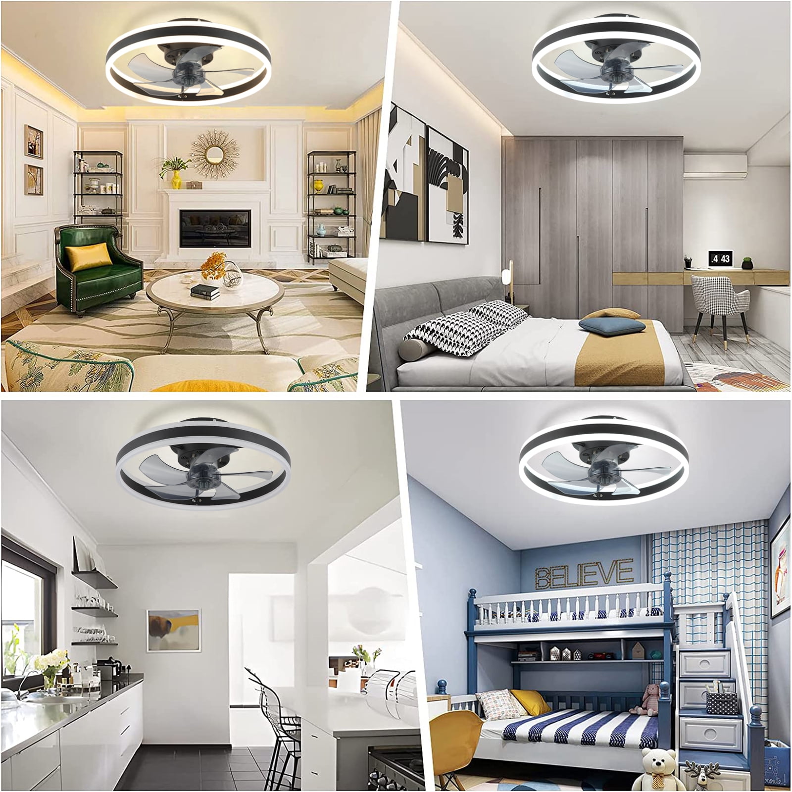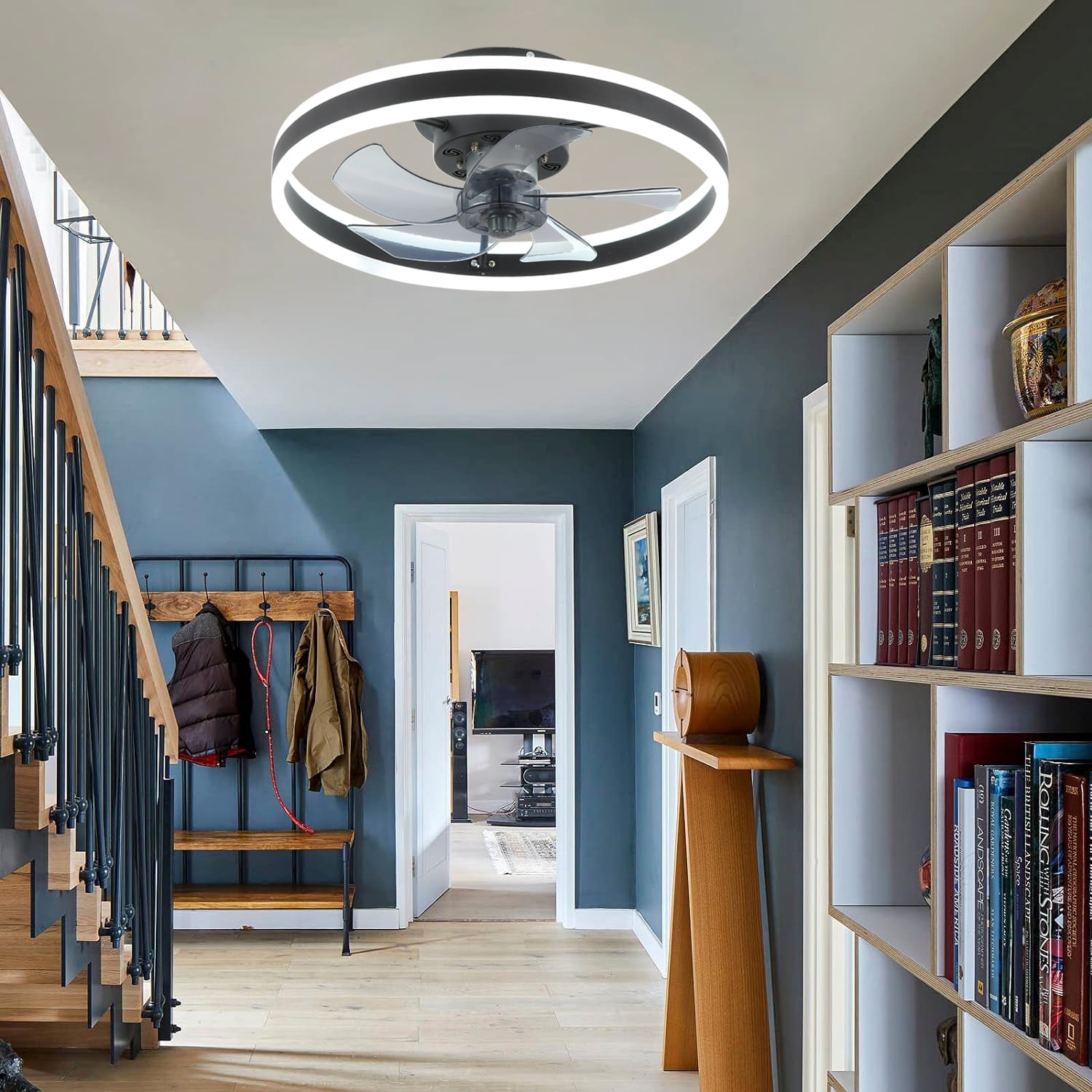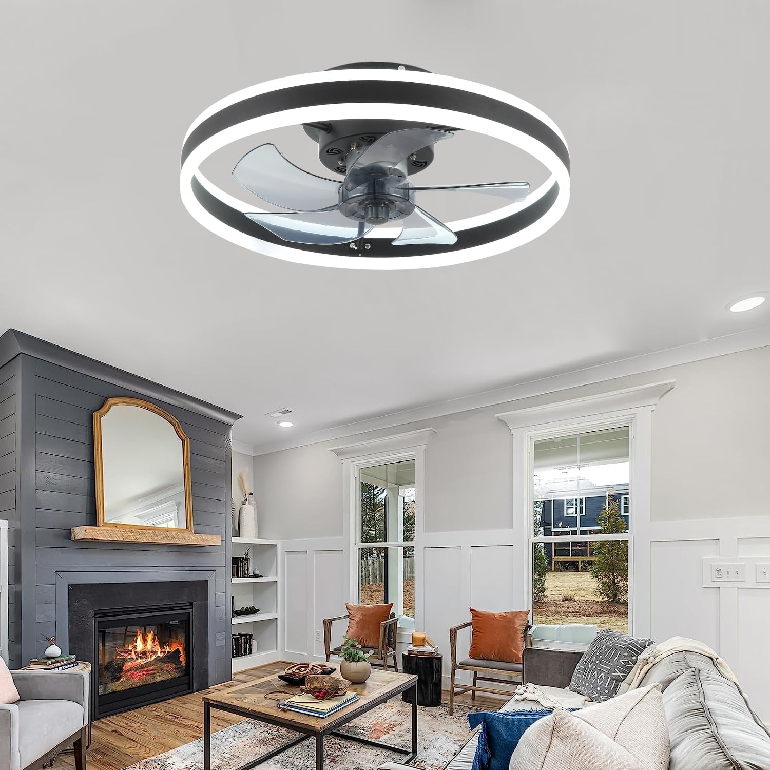 JLPAN Ceiling Fans with Lights, Low Profile Flush Mount Modern Bladeless Ceiling Fan and Remote Control, 19.7″ Dimmable LED 3 Colors and 6 Speeds – Black