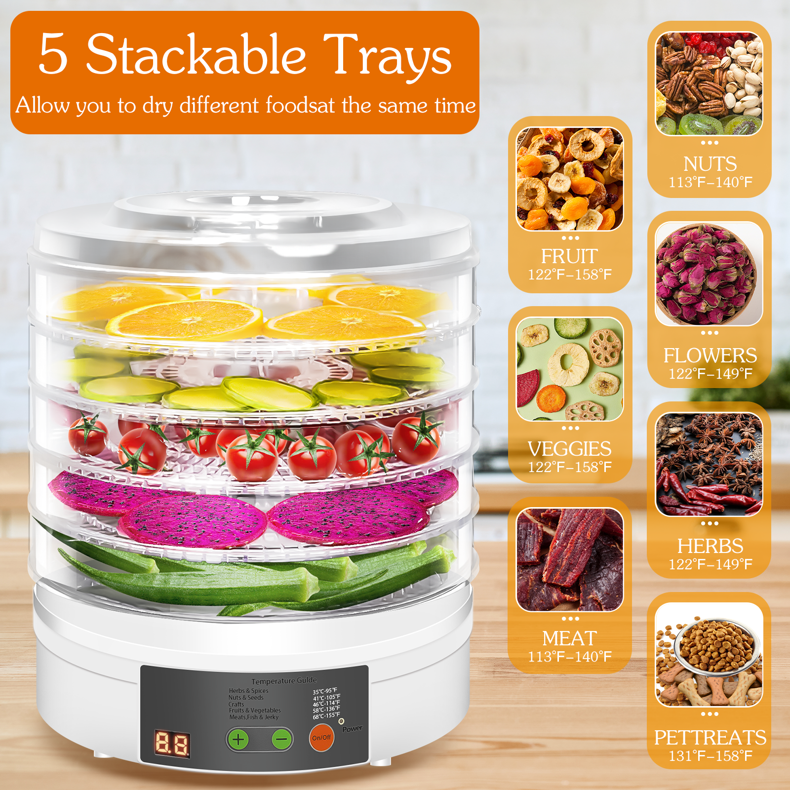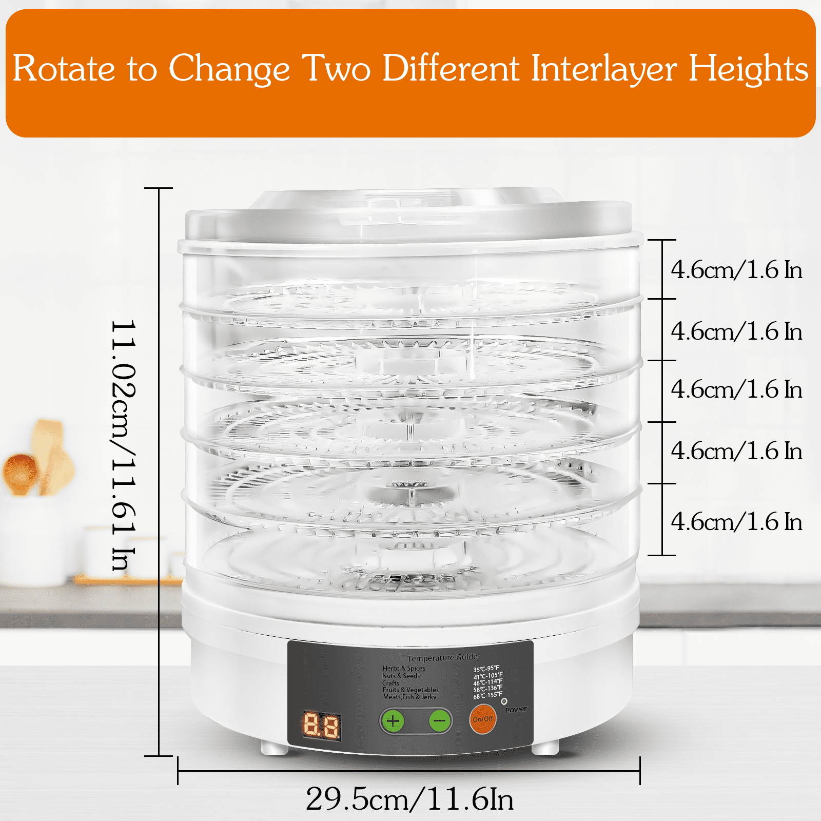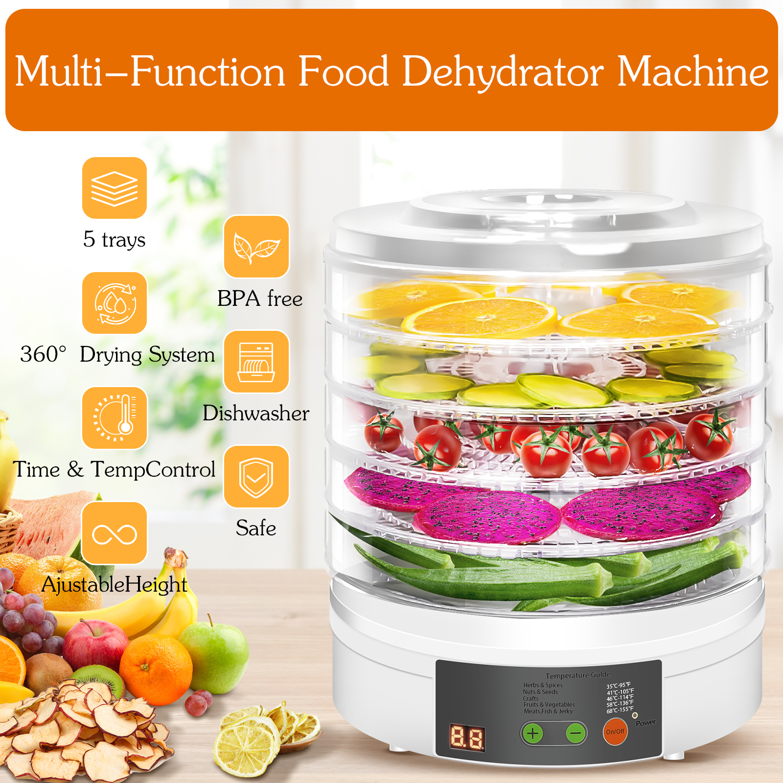 Electric food dehydrator machine 5 trays & 350 watt: More drying space and dry quickly!Includes one fine-mesh sheet for drying small food like herbs and one solid fruit roll tray for making fruit roll-ups. Equipped with 350W of drying power, this food dehydrator removes moisture and locks in the original flavors of your favorite foods; Excellent craftsmanship means excellent operation with a 97% vitamin and mineral retention rate; This is definitely the best way to preserve food Precise Timer & LCD digital Temperature 72 hours timing for precise drying time and Accurate temperature settings (35º-70ºC/95º-155ºF) allow you to dry out different types of food to perfection.Choose the optimal time and temperature depending on the ingredients; A hot air fan will automatically switch on and off to balance the temperature; Never worry about making a mess again 5 Trays Multifunction Dehydrator Adjustable height offers you more space to dry different kinds of food. Offer more space to make delicious trail mix, Suitable for drying fruit, vegetables, meat, herbs, flower tea, nuts, mushrooms, or to make beef jerky, turkey jerky, fish jerky, and any other homemade food; Also can be used to make chews and snacks for your pets High Quality premium plastic trays, all the materials are free of BPA, and are absolutely safe for your health; The digital LED display screen allows you to accurately time and control temperature settings; Dehydrator fine-meshed plastic sheet for drying small food like herbs while silicon tong helps you take up and place food more conveniently; Enjoy an easy, healthy homemade snack without any additives No rotation needed The bottom-mounted fan and heating element provide consistant air flow for optimum drying. Two ways to place and different sizes:Rotate food trays 180 degrees together,to get different heights,1.37In and 1.77In. Easy to store &Safety Stack the trays in Storage Mode to take up less space.The dehydrator is equipped with an auto shut-off mechanism in case the machine overheats. It is also BPA-free, so you can be confident that you’re receiving a safe and high-quality appliance.