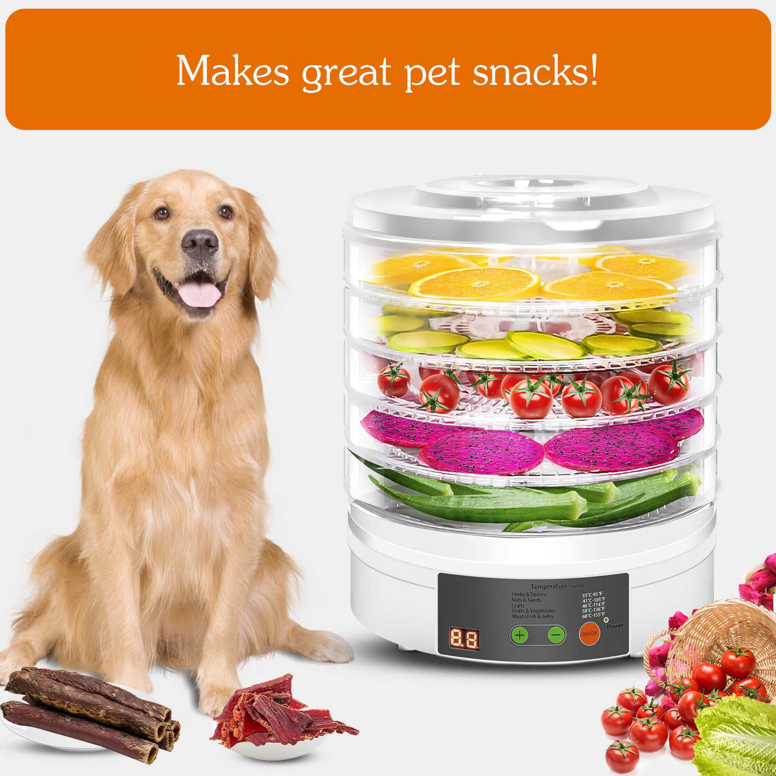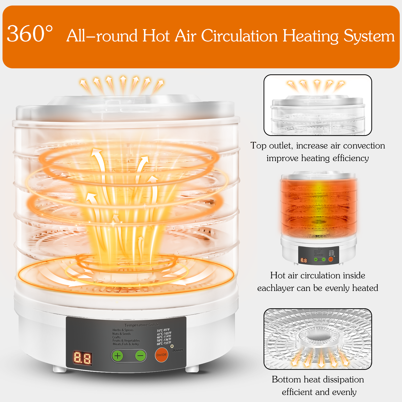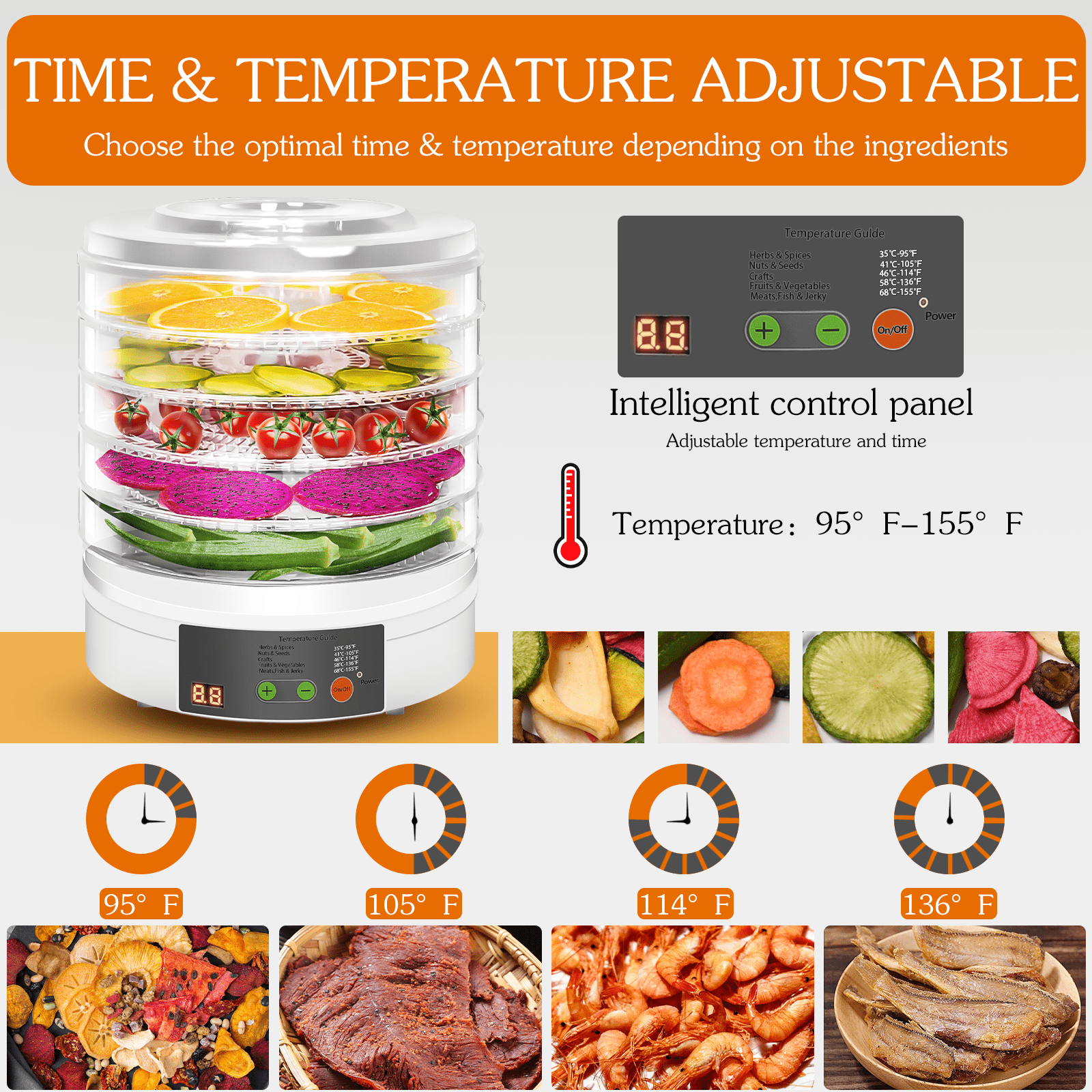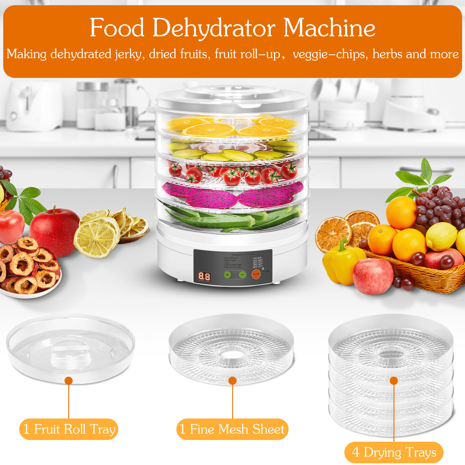 Electric food dehydrator machine 5 trays & 350 watt: More drying space and dry quickly!Includes one fine-mesh sheet for drying small food like herbs and one solid fruit roll tray for making fruit roll-ups. Equipped with 350W of drying power, this food dehydrator removes moisture and locks in the original flavors of your favorite foods; Excellent craftsmanship means excellent operation with a 97% vitamin and mineral retention rate; This is definitely the best way to preserve food Precise Timer & LCD digital Temperature 72 hours timing for precise drying time and Accurate temperature settings (35º-70ºC/95º-155ºF) allow you to dry out different types of food to perfection.Choose the optimal time and temperature depending on the ingredients; A hot air fan will automatically switch on and off to balance the temperature; Never worry about making a mess again 5 Trays Multifunction Dehydrator Adjustable height offers you more space to dry different kinds of food. Offer more space to make delicious trail mix, Suitable for drying fruit, vegetables, meat, herbs, flower tea, nuts, mushrooms, or to make beef jerky, turkey jerky, fish jerky, and any other homemade food; Also can be used to make chews and snacks for your pets High Quality premium plastic trays, all the materials are free of BPA, and are absolutely safe for your health; The digital LED display screen allows you to accurately time and control temperature settings; Dehydrator fine-meshed plastic sheet for drying small food like herbs while silicon tong helps you take up and place food more conveniently; Enjoy an easy, healthy homemade snack without any additives No rotation needed The bottom-mounted fan and heating element provide consistant air flow for optimum drying. Two ways to place and different sizes:Rotate food trays 180 degrees together,to get different heights,1.37In and 1.77In. Easy to store &Safety Stack the trays in Storage Mode to take up less space.The dehydrator is equipped with an auto shut-off mechanism in case the machine overheats. It is also BPA-free, so you can be confident that you’re receiving a safe and high-quality appliance.
