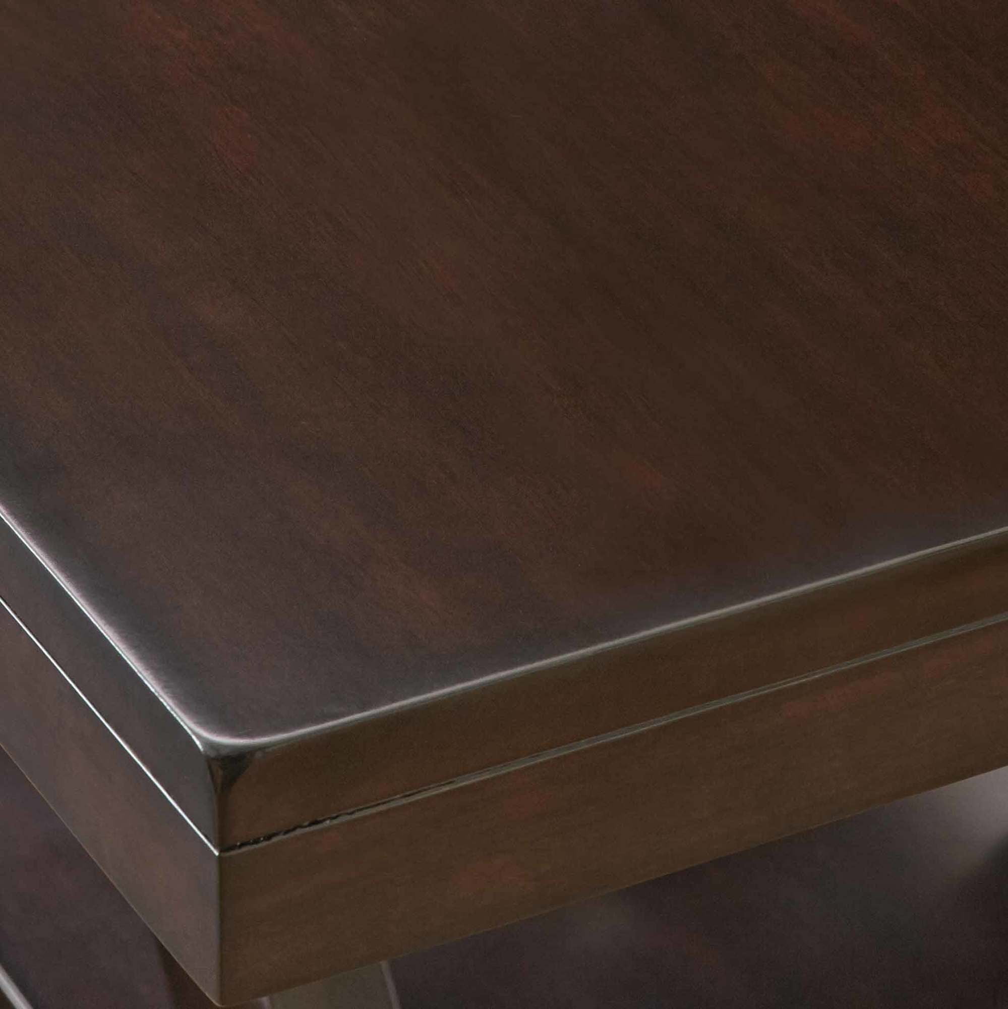 Finish: Espresso Cherry Constructed from hardwood solids and mango veneers Decorative base and thick tops add to classic style Minimalist frame has a unique design Cherry finish adds warmth to any room This table is casual but yet sophisticated