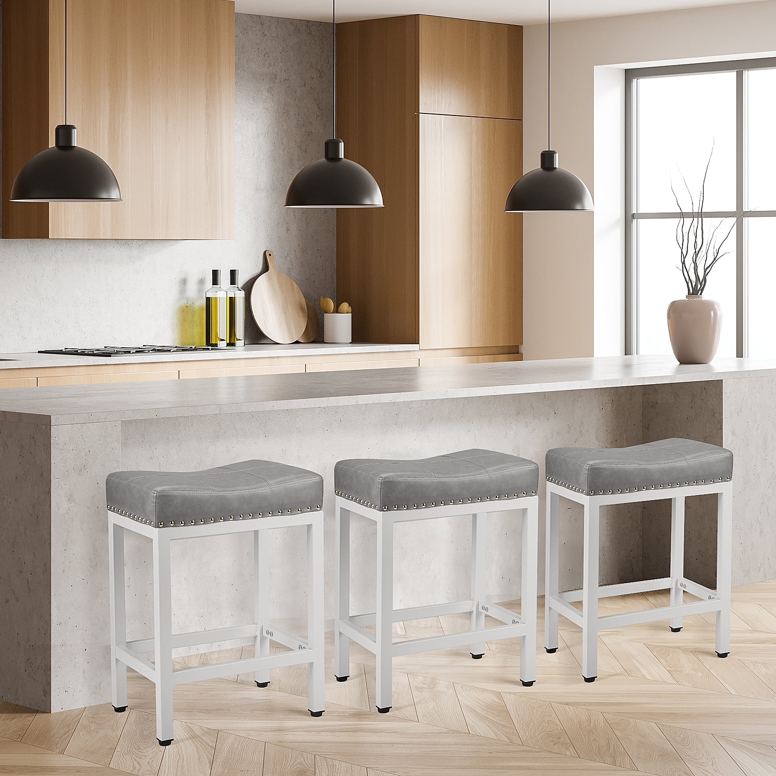 JOINSUN Bar Stools Set of 4, Hight 24 Inch Kitchen Barstools with Metal Base, PU Leather Saddle Seats for Kitchen, Gray