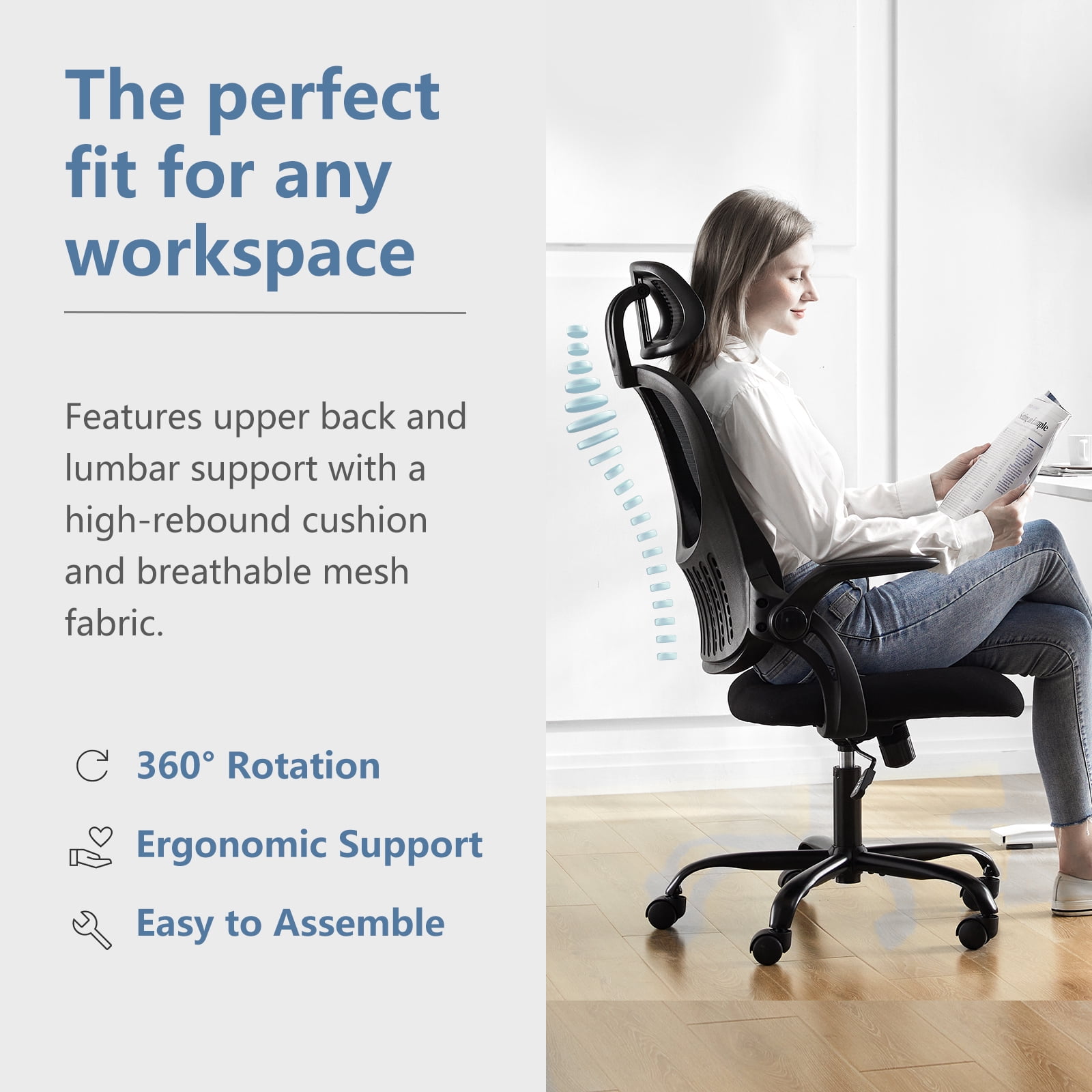 [Ergonomic Design] The JOINSUN Ergonomic Mesh Office Desk Chair is meticulously designed to provide optimal comfort and support for your body. The chair features a curved backrest that follows the natural curve of your spine, promoting a healthy sitting posture and reducing strain on your back. The adjustable headrest ensures proper alignment of your neck and head, while the lumbar support can be customized to fit your individual needs, preventing discomfort and fatigue during long hours of work. [Adjustable Features] This office chair offers a range of adjustable features to suit your preferences and needs. The height of the chair can be easily adjusted to accommodate users of different heights, promoting proper alignment of your body and reducing the risk of posture-related issues. The armrests can be flipped up to allow for more freedom of movement, while the recline angle can be adjusted to find the perfect sitting position for maximum comfort and productivity throughout the day. [Multifunctional Mechanism] The JOINSUN chair is equipped with a multifunctional mechanism that enhances your sitting experience. The chair’s tilt tension control allows you to adjust the recline tension according to your preference, enabling you to lean back and relax or sit upright for focused work. The 360-degree swivel function and smooth rolling casters make it easy to move around your workspace without straining your body, promoting efficiency and convenience in your daily tasks. [Smooth & Stable] With a sturdy base and high-quality materials, the JOINSUN chair offers stability and durability for long-term use. The chair’s five-point base provides excellent support and prevents tipping or wobbling, ensuring your safety and security while sitting. The smooth-rolling casters glide effortlessly across various flooring surfaces, allowing you to move around with ease and efficiency. This combination of stability and mobility creates a comfortable and productive working environment for you. [Easy Assembly] The JOINSUN Ergonomic Mesh Office Desk Chair is designed for hassle-free setup, allowing you to enjoy its benefits with minimal effort. The chair comes with clear assembly instructions and all the necessary tools, making the process quick and straightforward. You can easily put together the chair in a matter of minutes, without needing any special skills or expertise. This easy assembly feature saves you time and frustration, ensuring that you can start using your new chair right away. Say goodbye to complex assembly processes and hello to instant comfort and convenience with the JOINSUN chair.